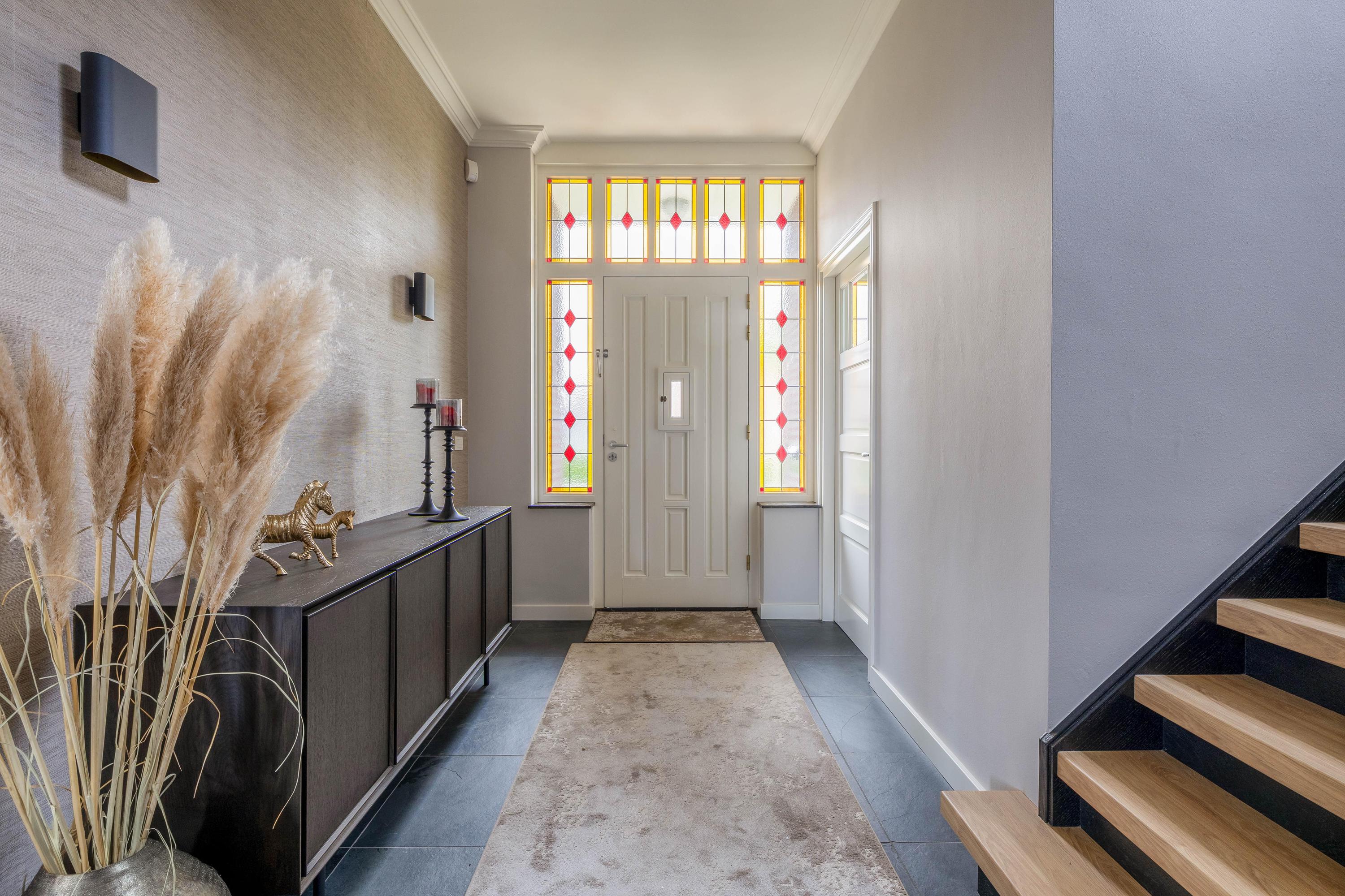 De begane grond (m.u.v. de garage) is voorzien van vloerverwarming. In de royale entree zijn het toilet met fonteintje en een trapkast aanwezig. Hier bevindt zich ook het kantoor (ca. 10,5m²) met tegelvloer, airco en een vaste kastenwand met schuifdeuren.