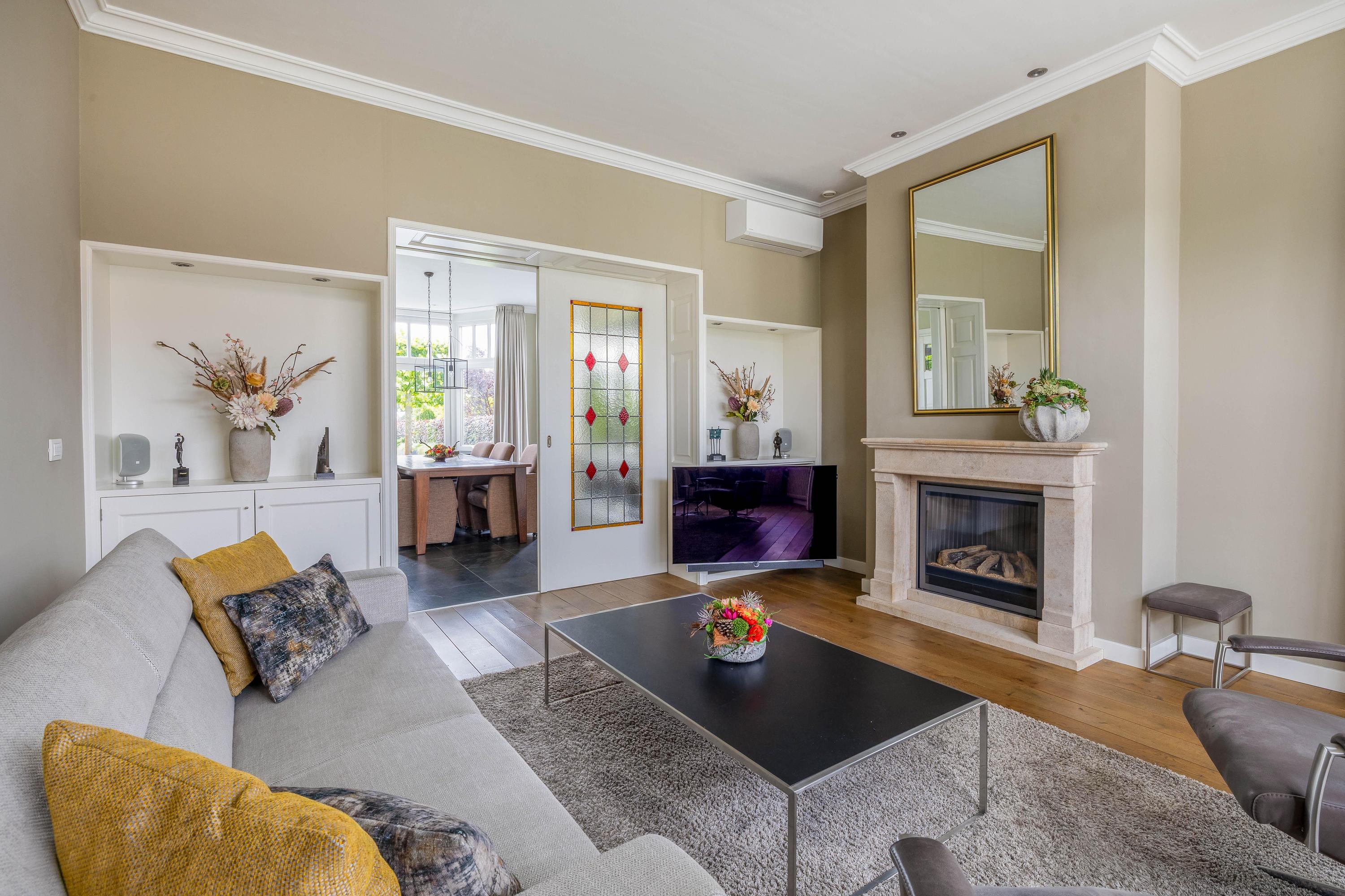 In de, met licht overgoten, woonkamer ligt in het voorste gedeelte een houten vloer. Vanuit de erker is er zicht op de eigen voortuin. Hier zijn een mooie gashaard. airco en twee muurkasten aanwezig. De prachtige en-suite deuren met glas-in-lood bieden toegang tot de eetkamer. Hier ligt een tegelvloer en is ook een muurkast aanwezig. Openslaande deuren bieden toegang tot de tuin. De woonkamer is ca. 53m².