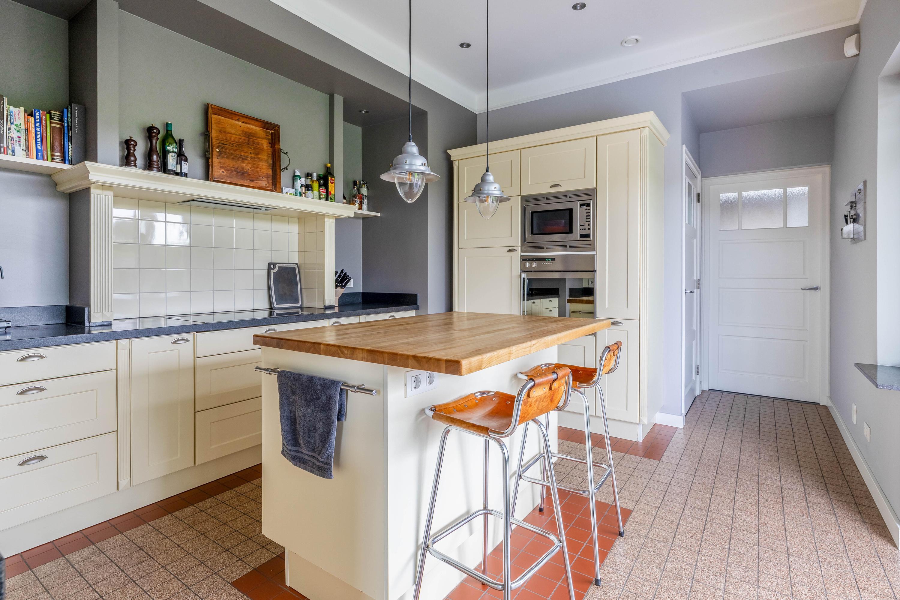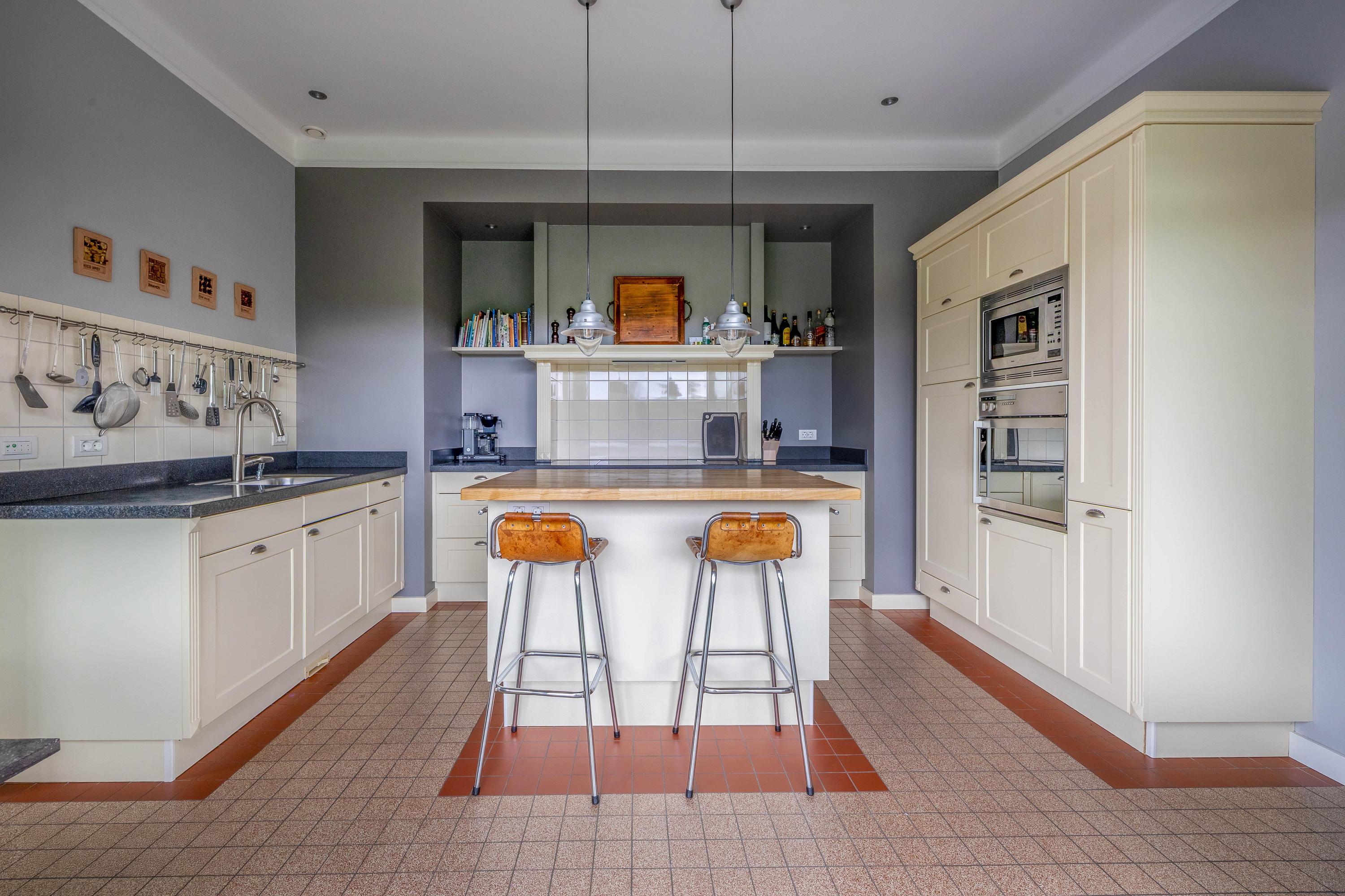 De grote keuken (ca. 16m²) is uitgerust met een keramische kookplaat, afzuigkap, koelkast, vaatwasser, oven en magnetron. Ook hier bieden openslaande deuren toegang tot de tuin.