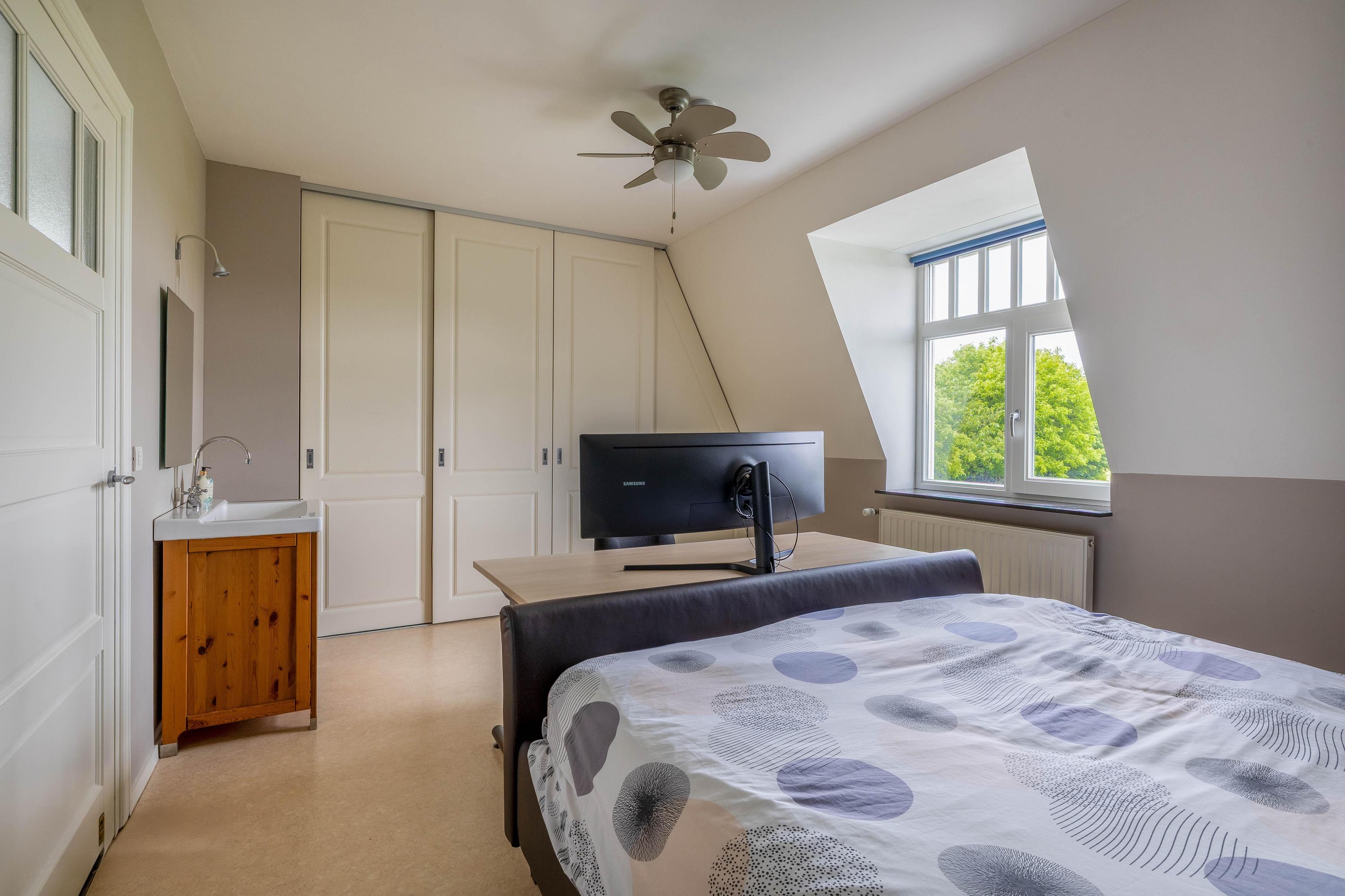 Slaapkamer 1 (ca. 18m²) is voorzien van een novilon vloer, dakkapel, vaste kast en wastafelmeubel met warm en koud water.