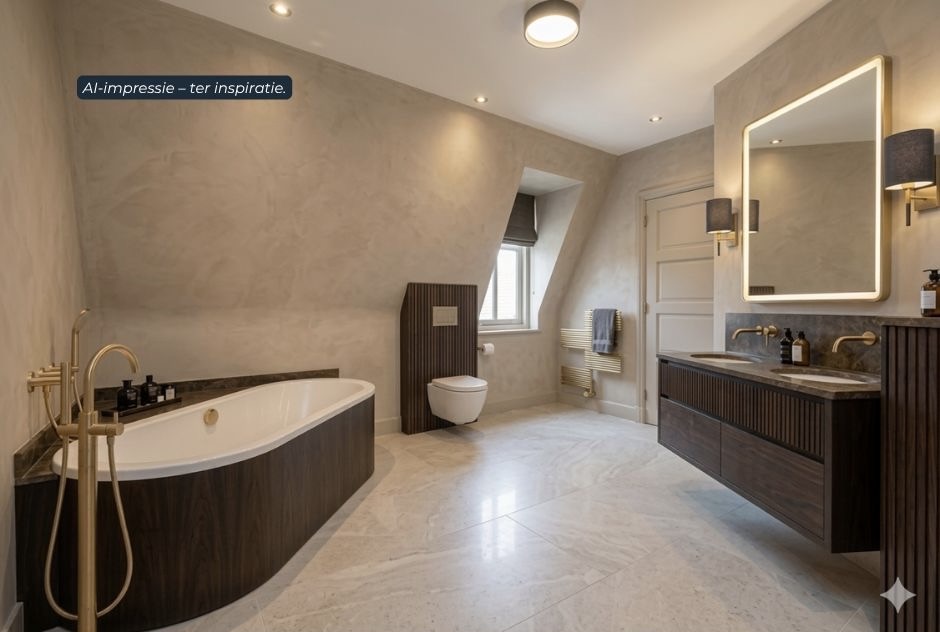 In de badkamer (ca. 15m²) ligt een tegelvloer met vloerverwarming. Er zijn een ligbad, inloopdouche, wastafel, toilet en designradiator aanwezig. Het is een grote badkamer met een dakkapel die zorgt voor veel daglicht.