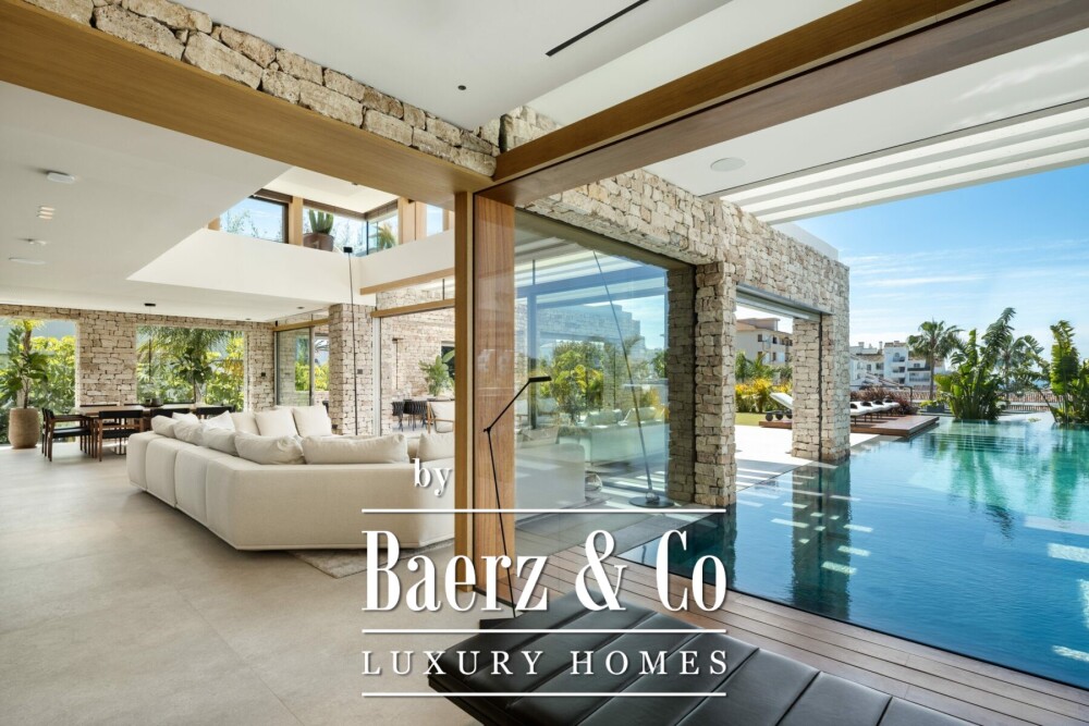 Villa Nueva Andalucia Marbella biedt een verfijnde woonervaring waarin moderne architectuur en locatie naadloos samenkomen. Deze villa is zorgvuldig vormgegeven met 742 m² aan interne leefruimte op een perceel van 909 m². Op enkele minuten van Puerto Banús en op loopafstand van voorzieningen, maar toch volledig privé. Het kenmerkende infinity zwembad laat binnen- en buitenruimte in elkaar overvloeien en krijgt extra allure door LED-verlichting bij zonsondergang. Meerdere terrassen breiden de leefruimte uit met mogelijkheden voor buiten dineren en ontspanning, ideaal ingericht voor moeiteloze gastvrijheid of rustige contemplatie. De toegang is discreet via een eigen oprit en een beveiligde garage.