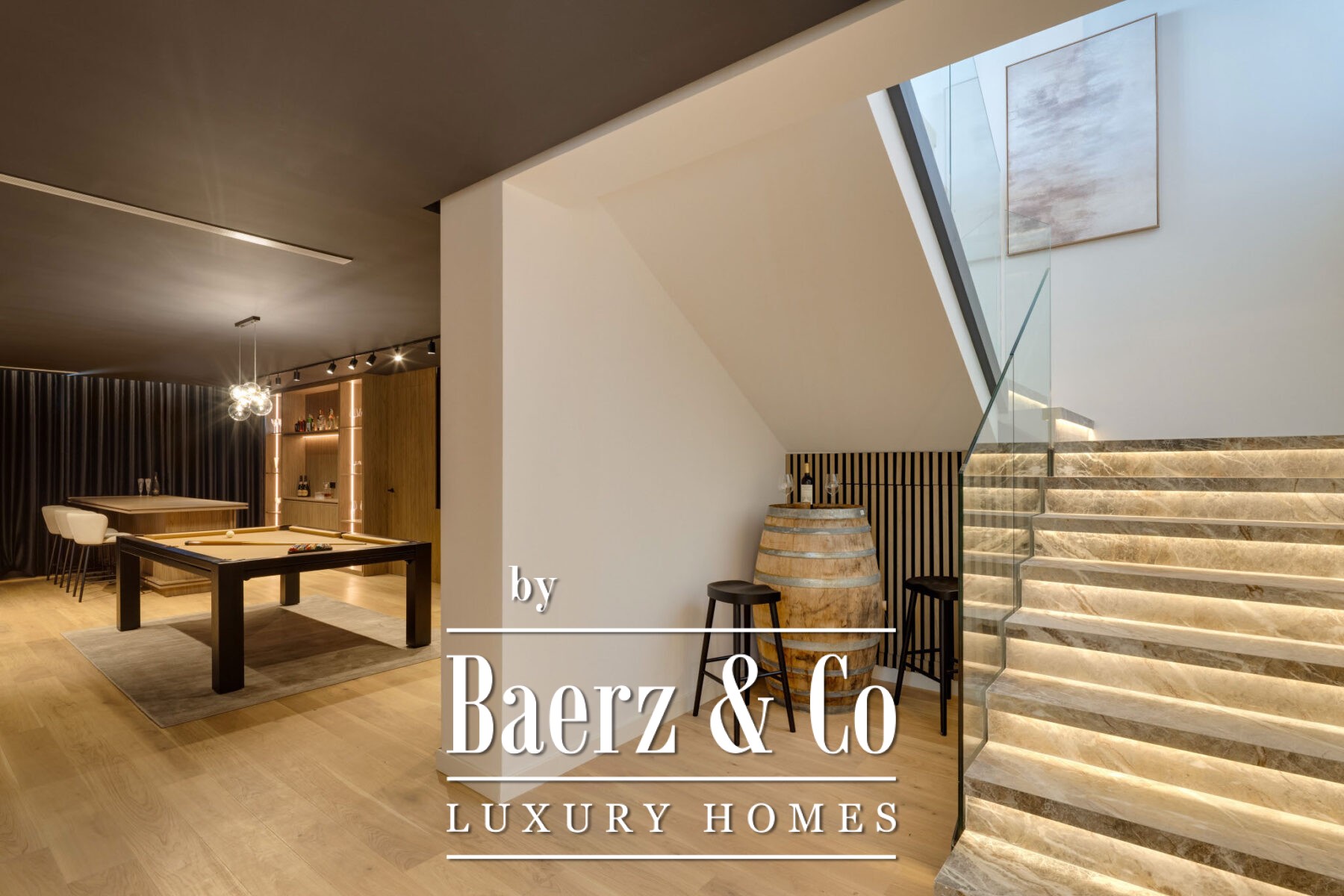 Het interieur onderscheidt zich door hoogwaardige eiken vloeren, grootformaat porseleinen tegels en de nieuwste apparatuur van Gaggenau en Siemens. Voor ontspanning is er een privé verwarmd zwembad, een eigen bioscoop en een gym. De garage voldoet aan de moderne eisen. De villa wordt volledig gemeubileerd in een hedendaagse stijl aangeboden, met de mogelijkheid het meubilair apart aan te schaffen voor €250.000.