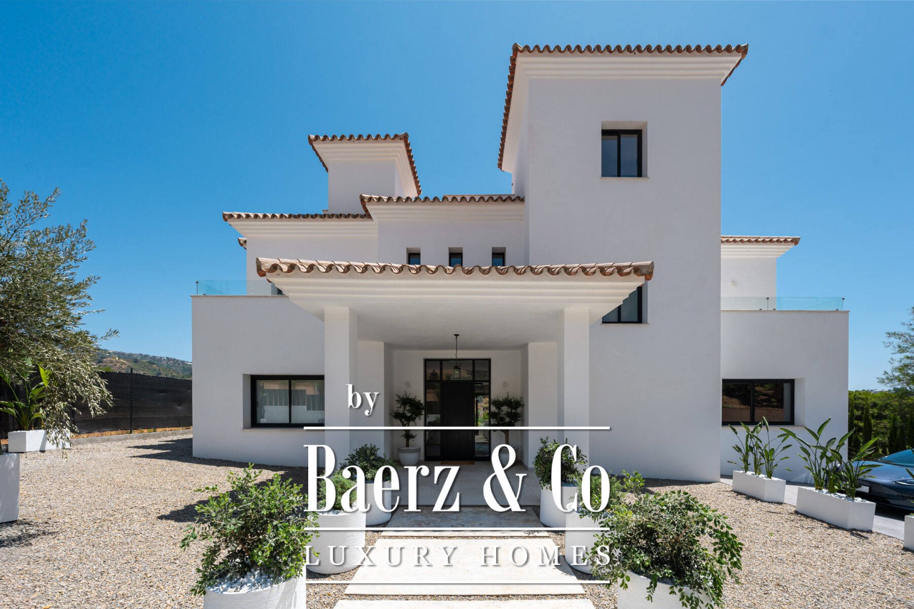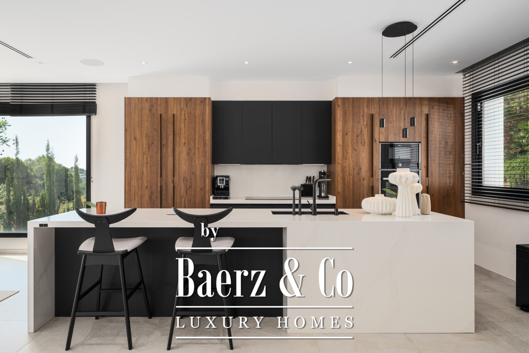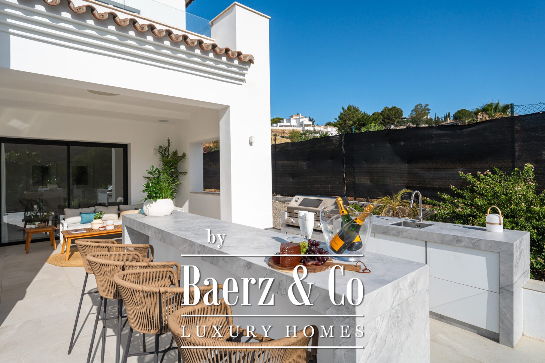 De architectuur van de residentie verenigt hedendaagse helderheid met warmte: keramische steen en houtafwerking zorgen voor een verfijnde sfeer. Miele-apparatuur, zonnepanelen, elektrische rolluiken en een geavanceerd irrigatiesysteem onderstrepen de duurzame details. Vanuit alle slaapkamers en leefruimtes openen terrassen naar het overdekte zwembad, de buitenbarbecue en de sauna, terwijl het panoramisch uitzicht op de golfbaan en de Middellandse Zee steeds het decor vormt.