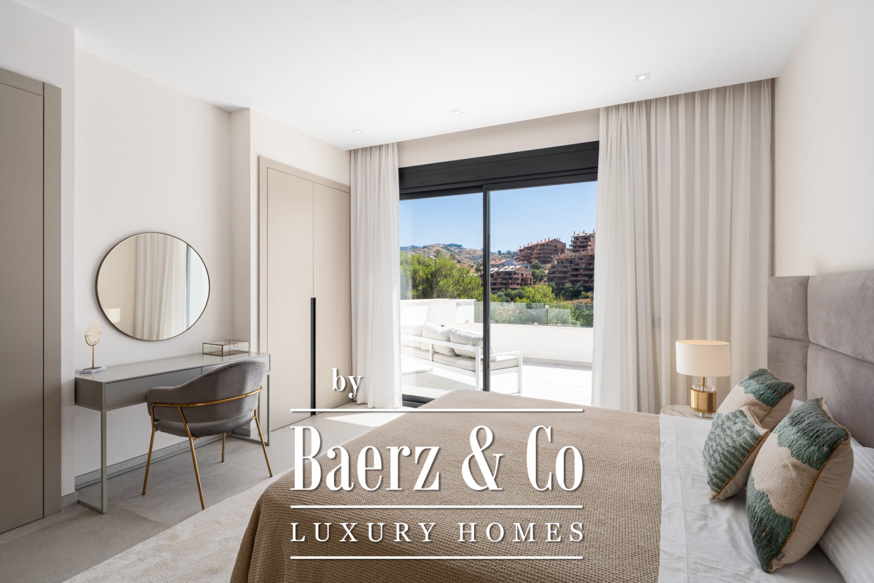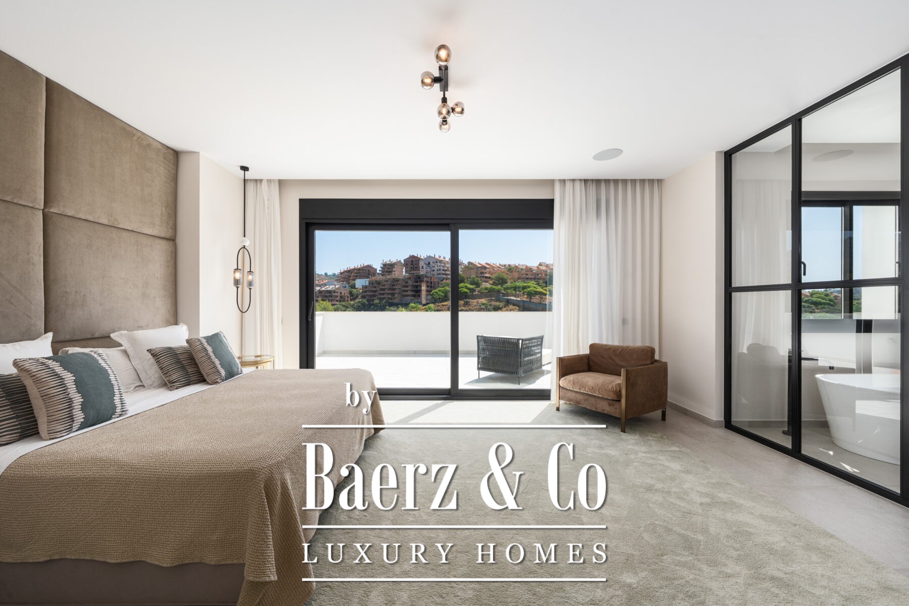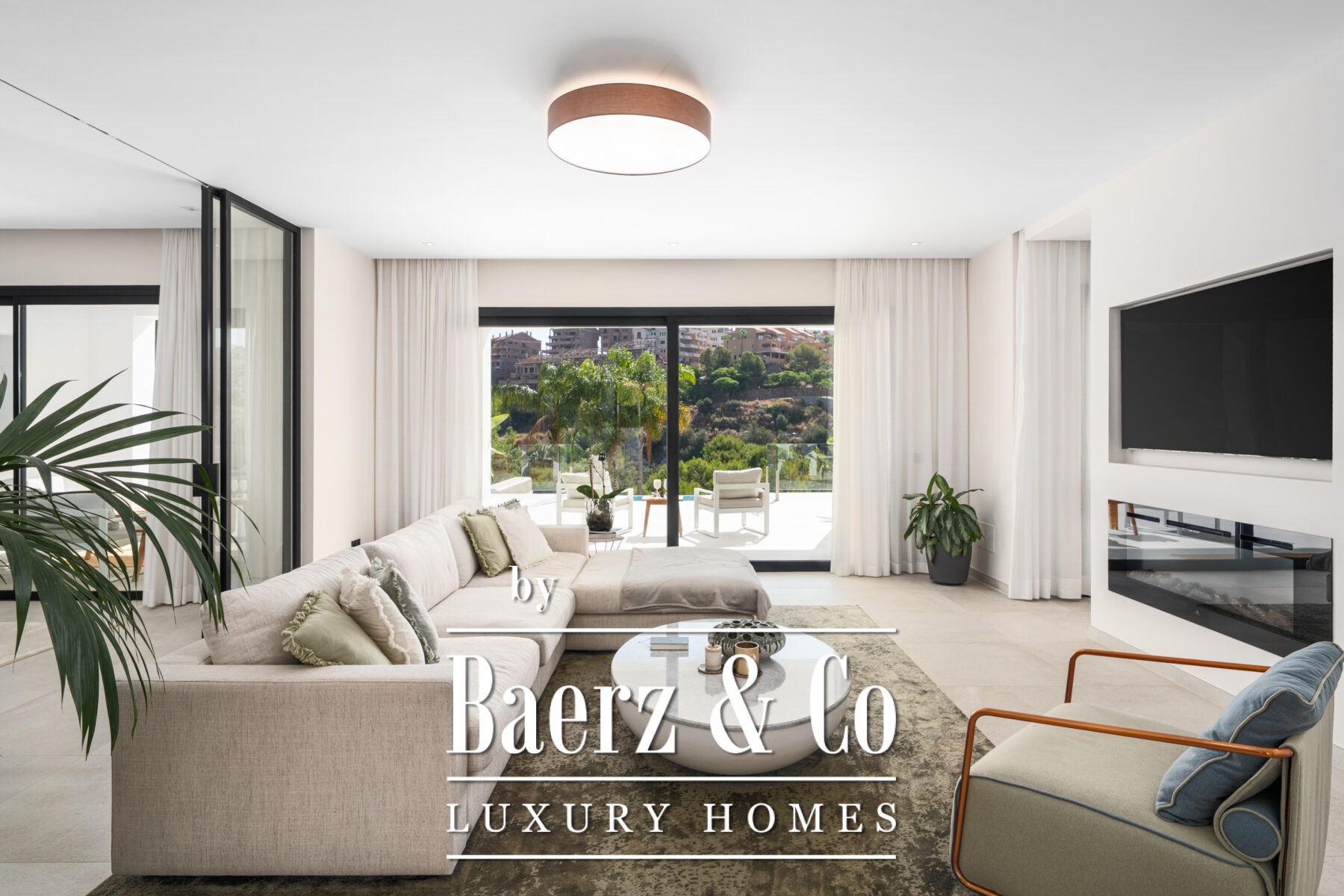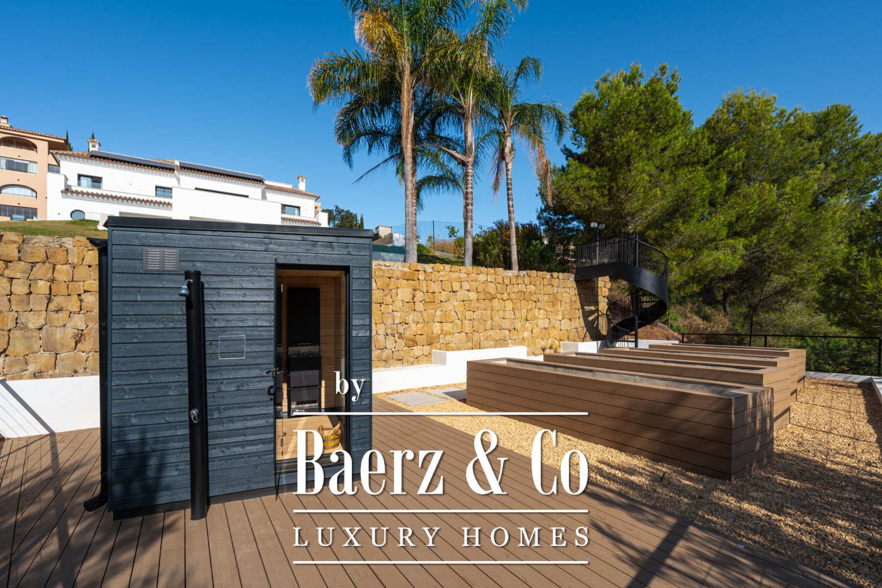 De architectuur van de residentie verenigt hedendaagse helderheid met warmte: keramische steen en houtafwerking zorgen voor een verfijnde sfeer. Miele-apparatuur, zonnepanelen, elektrische rolluiken en een geavanceerd irrigatiesysteem onderstrepen de duurzame details. Vanuit alle slaapkamers en leefruimtes openen terrassen naar het overdekte zwembad, de buitenbarbecue en de sauna, terwijl het panoramisch uitzicht op de golfbaan en de Middellandse Zee steeds het decor vormt.