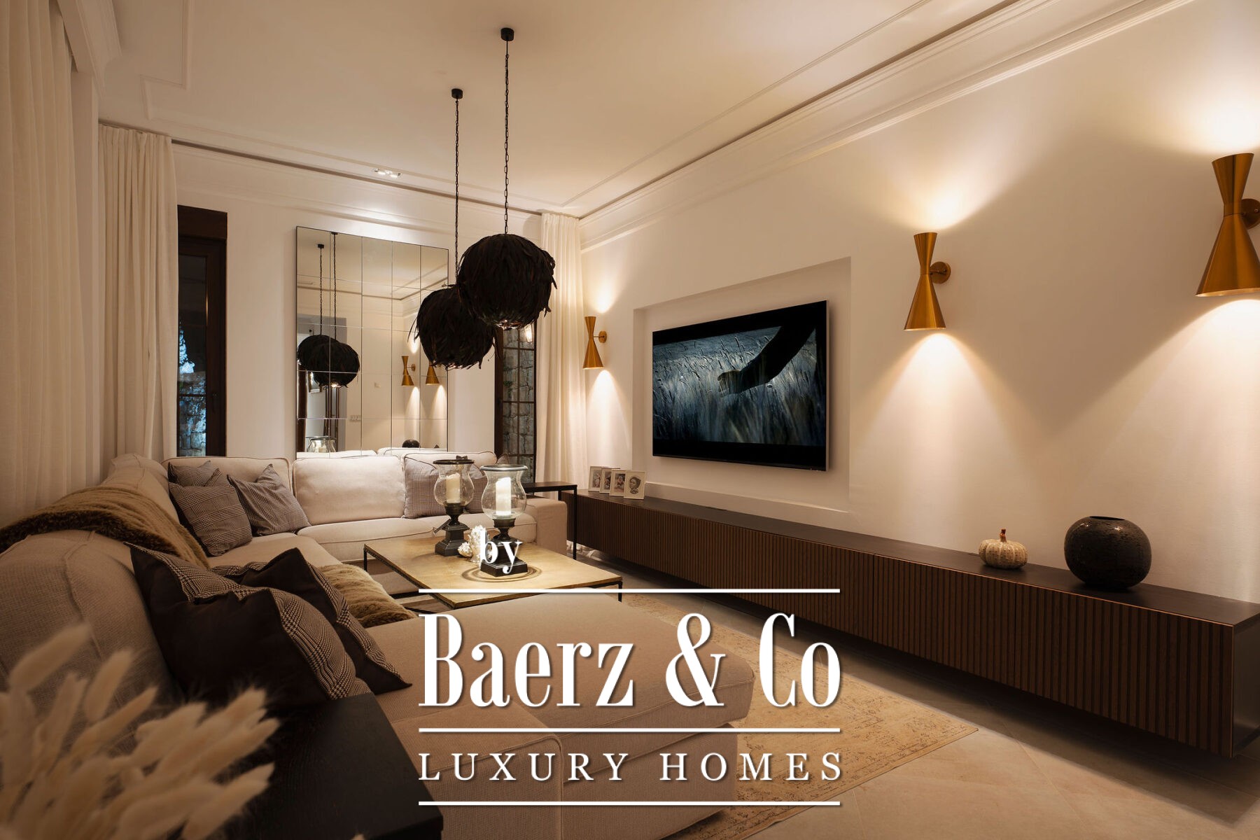 Het interieur ademt mediterrane elegantie, gekenmerkt door hoge plafonds, gracieuze bogen en open ruimtes die vloeiend overlopen van formeel naar informeel wonen. De vier slaapkamers en vier badkamers zijn zo gesitueerd dat privacy en comfort samengaan, terwijl de master suite beschikt over een inloopkast. Vloerverwarming, airconditioning voor zowel warm als koud, en een geïntegreerd surround sound systeem waarborgen gemoedsrust en welzijn. Daarnaast biedt de privé bioscoopruimte en de TV-lounge ultieme flexibiliteit voor ontspanning of gezelschap.