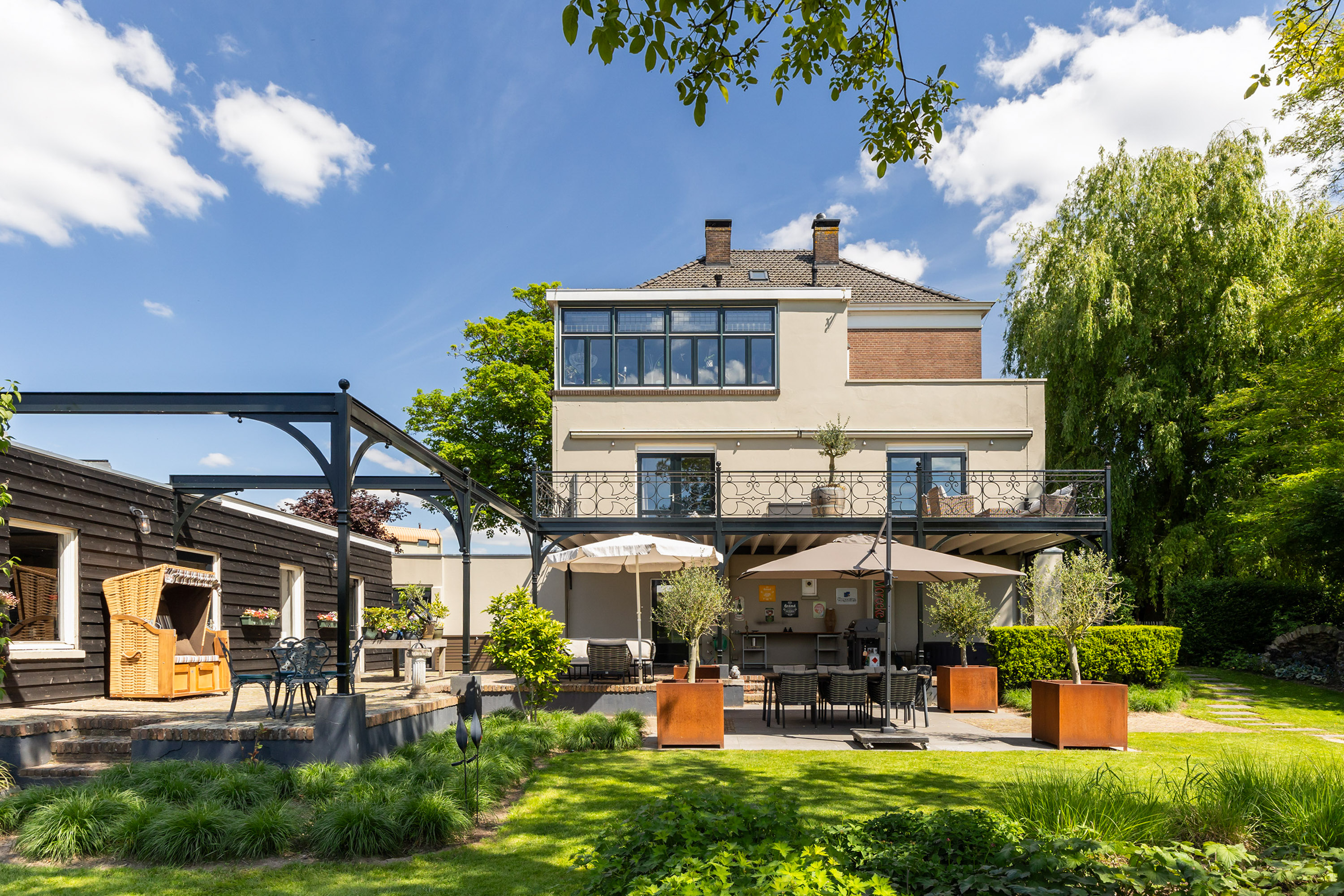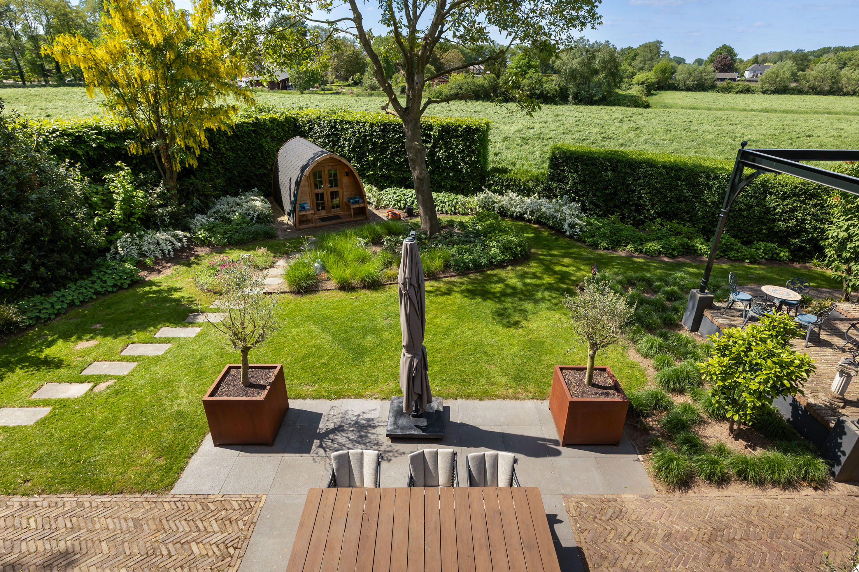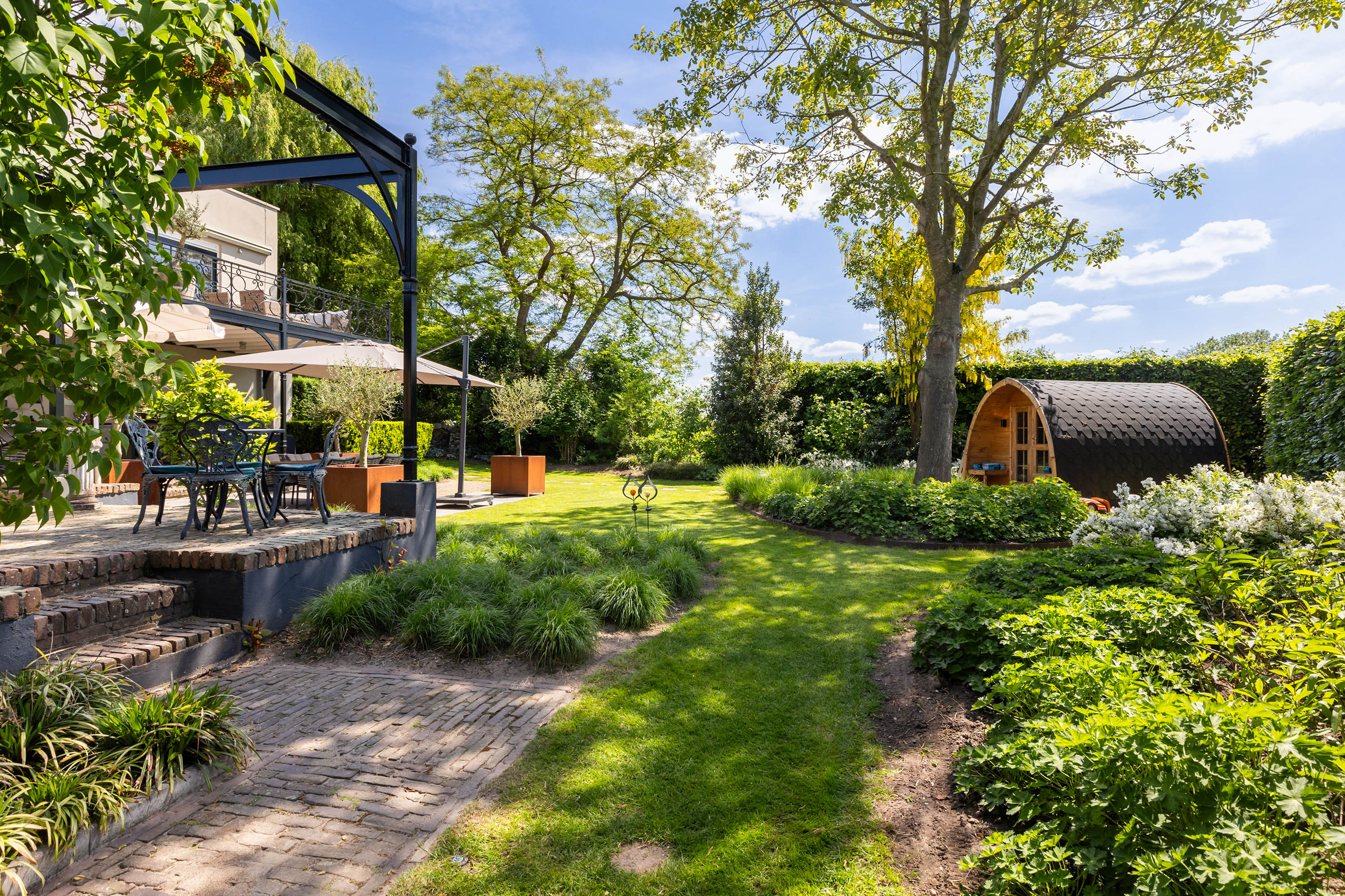 Het buitenterrein vormt een volwaardig verlengstuk van de woning. De tuin, opnieuw aangelegd in 2022, is ontworpen met oog voor rust en functionaliteit. Strakke lijnen worden afgewisseld met natuurlijke beplanting en meerdere terrassen bieden altijd een plek in zon of schaduw. De veranda met houten balkenplafond, voorbereid op buitenkeuken en wellness, maakt het buitenleven bijzonder aangenaam. Aan de zijkant van het perceel ligt een tweede tuin met gazon en een karakteristieke treurwilg, wat bijdraagt aan de groene beleving.