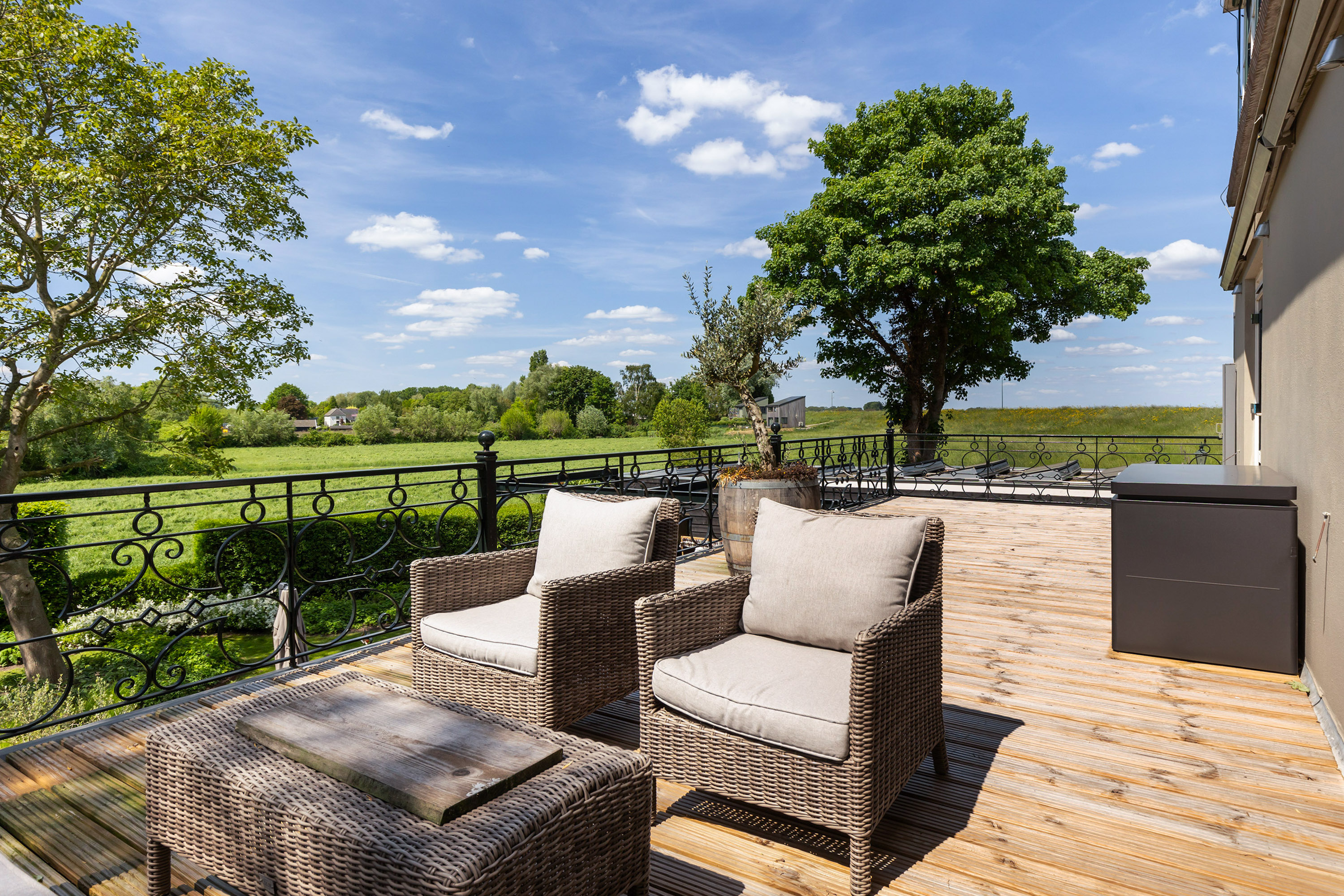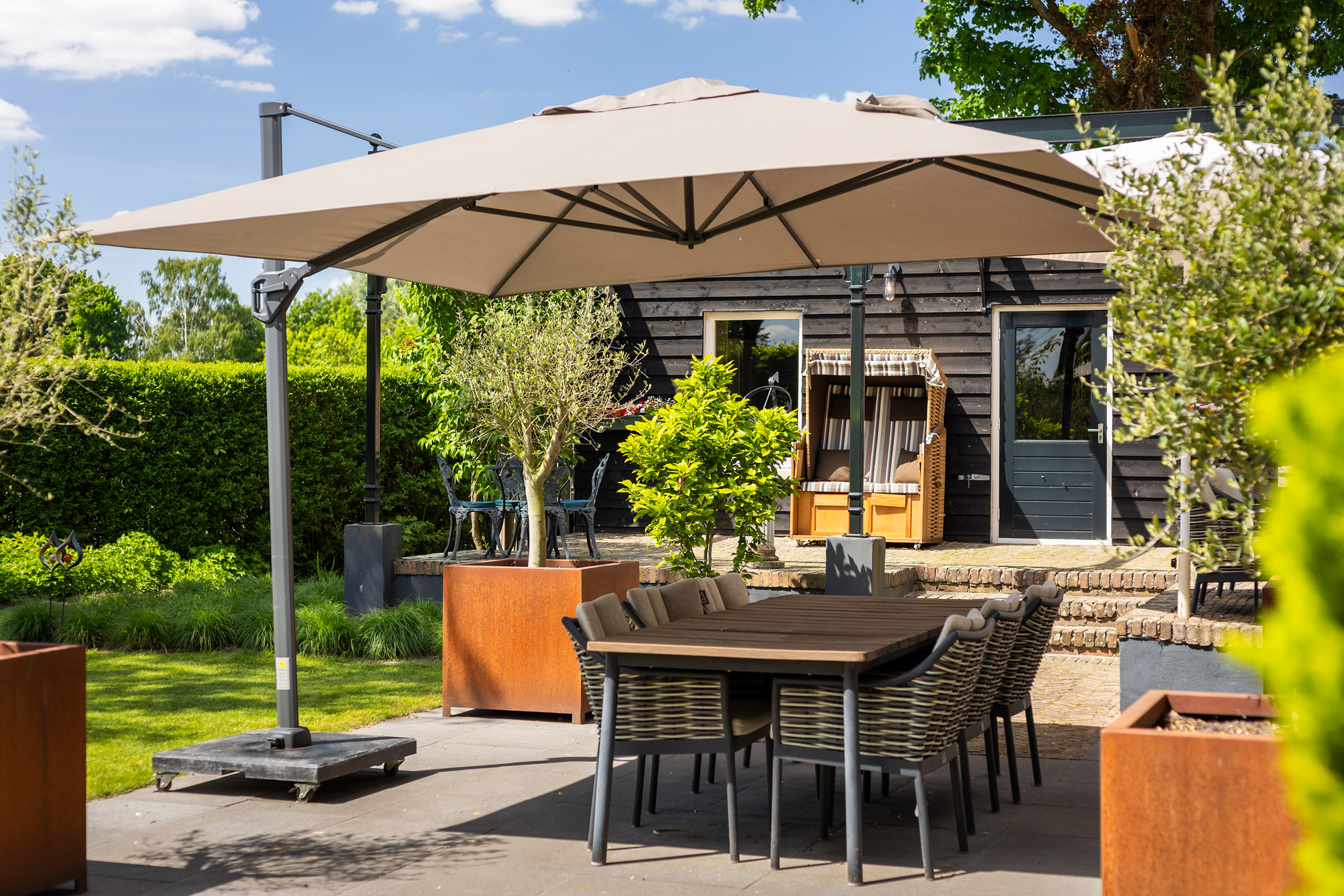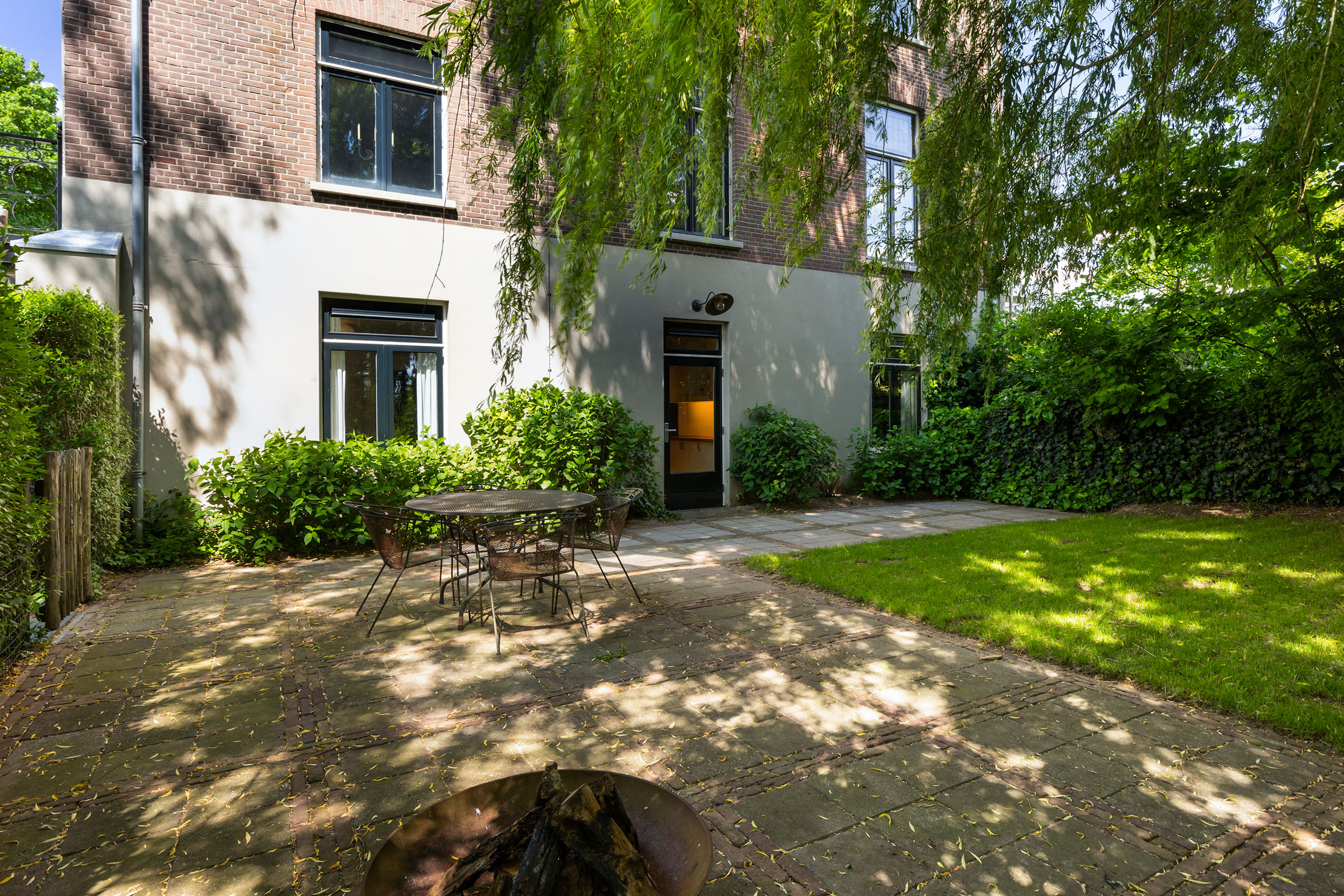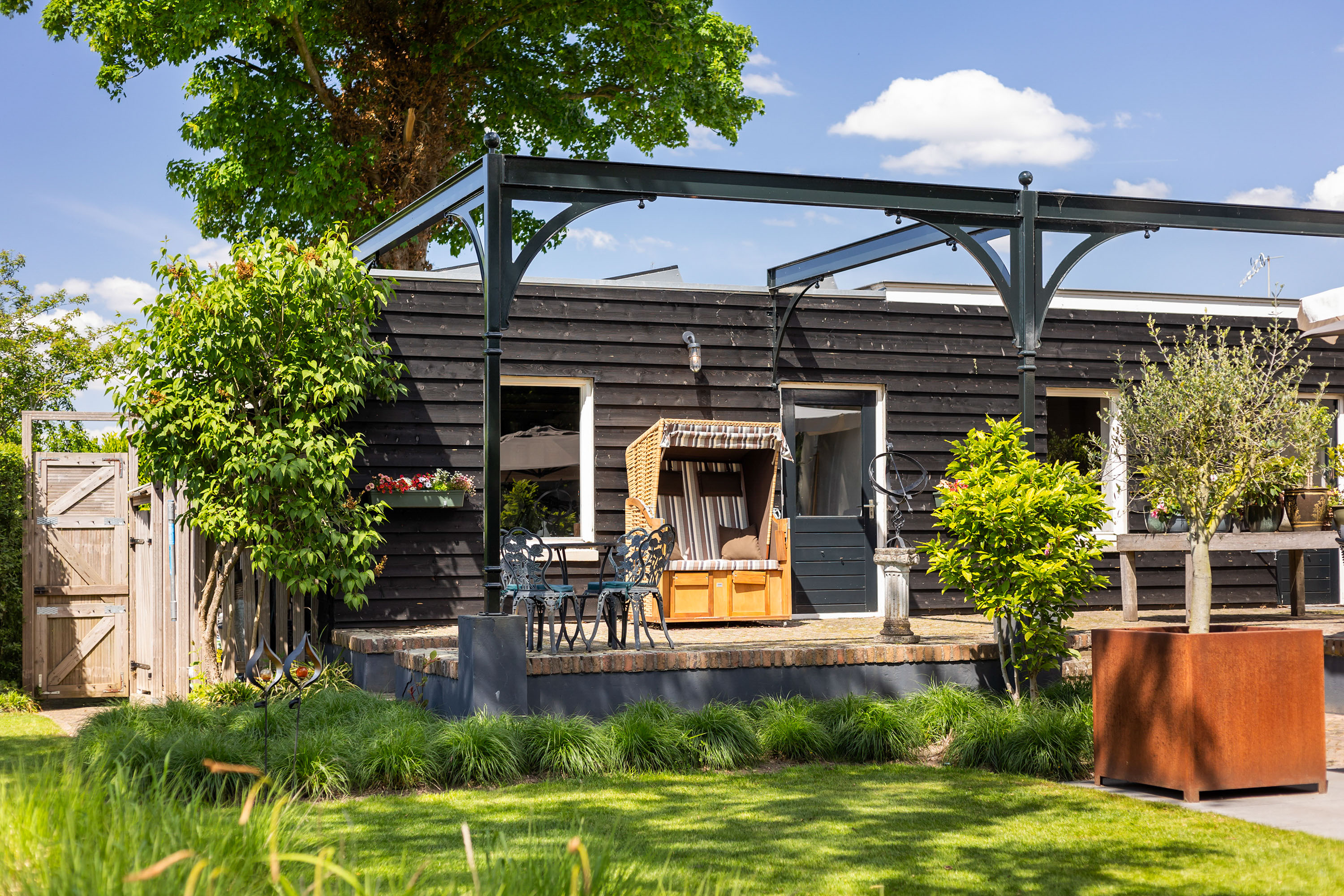 Het buitenterrein vormt een volwaardig verlengstuk van de woning. De tuin, opnieuw aangelegd in 2022, is ontworpen met oog voor rust en functionaliteit. Strakke lijnen worden afgewisseld met natuurlijke beplanting en meerdere terrassen bieden altijd een plek in zon of schaduw. De veranda met houten balkenplafond, voorbereid op buitenkeuken en wellness, maakt het buitenleven bijzonder aangenaam. Aan de zijkant van het perceel ligt een tweede tuin met gazon en een karakteristieke treurwilg, wat bijdraagt aan de groene beleving.