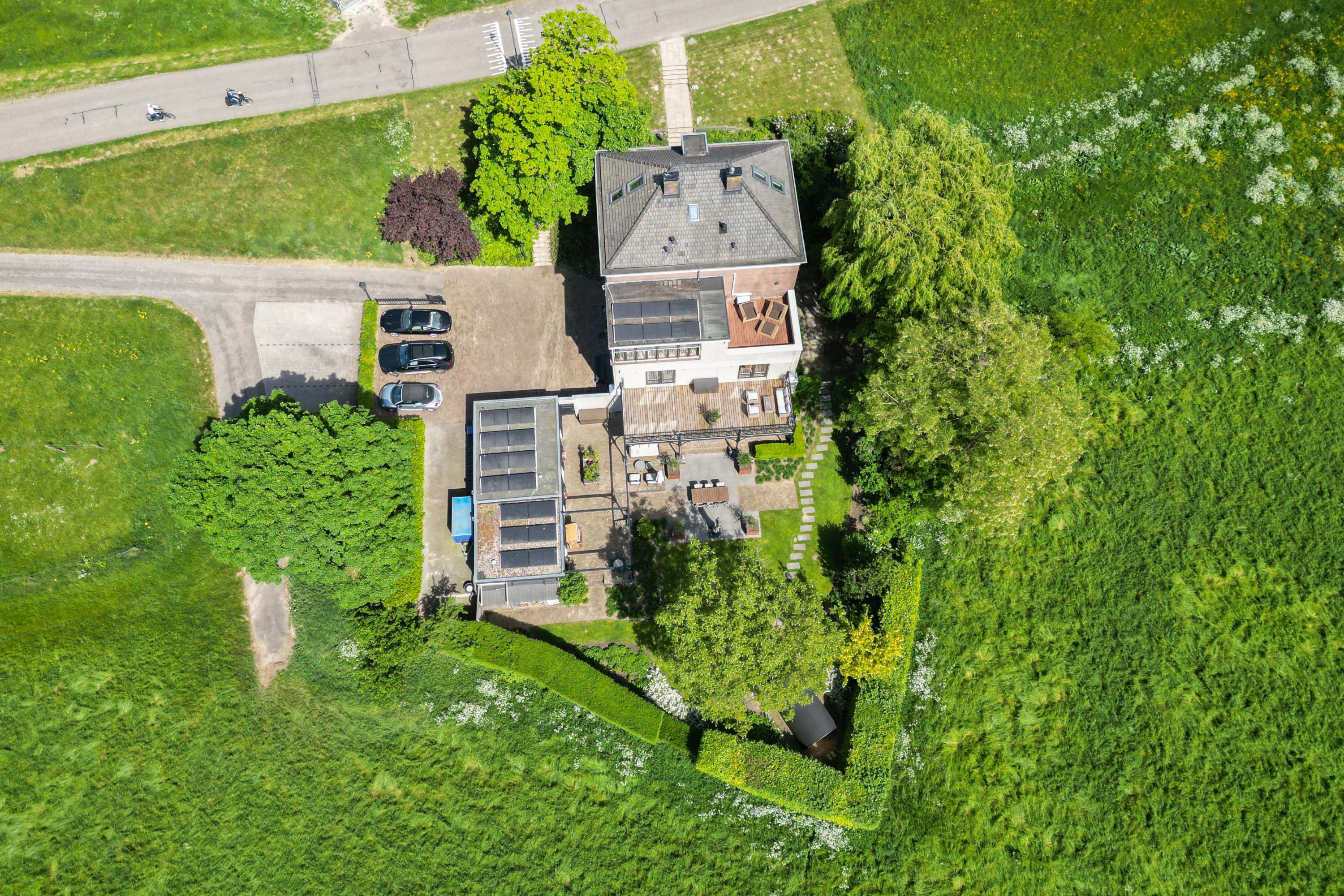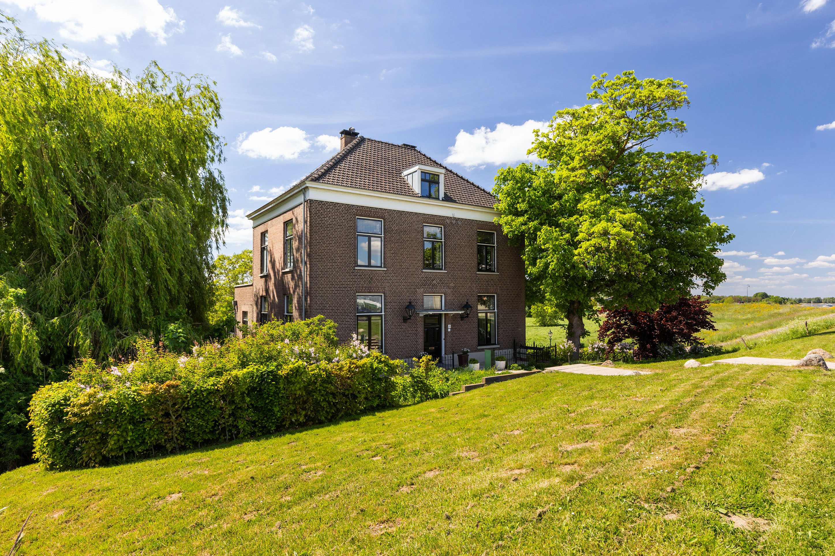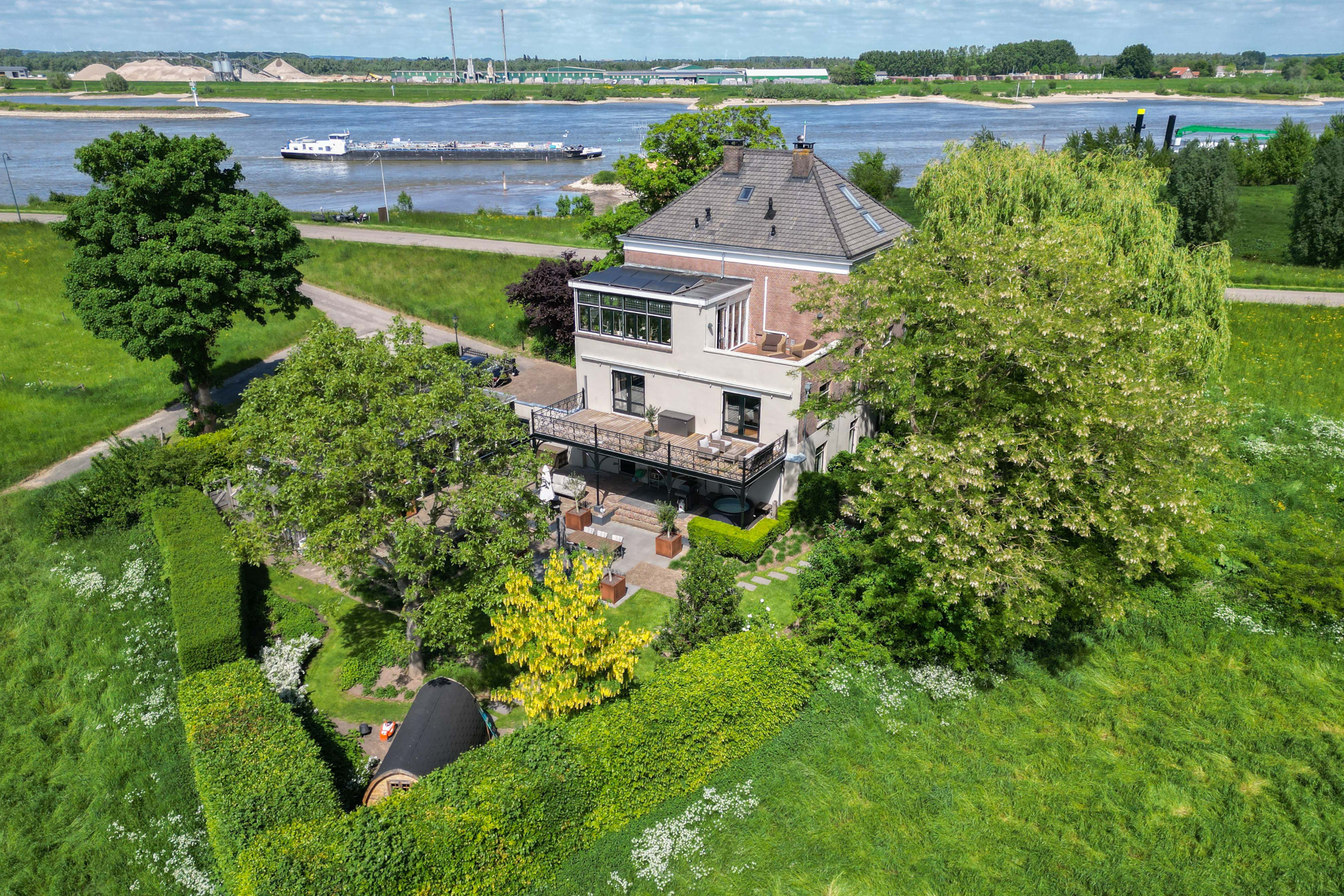 Op een markante plek waar water, natuur en historie samenkomen, bevindt zich deze karaktervolle villa met een uitzonderlijke uitstraling. Hoog gelegen aan de Rijndijk en uitkijkend over de samenvloeiing van Rijn en Waal, biedt deze voormalige rentmeesterswoning een zeldzame combinatie van privacy, ruimte en panoramisch uitzicht. Het geheel is gelegen op een volledig omsloten perceel, omgeven door een zorgvuldig aangelegde tuin die naadloos aansluit op de kwaliteit van de woning.
