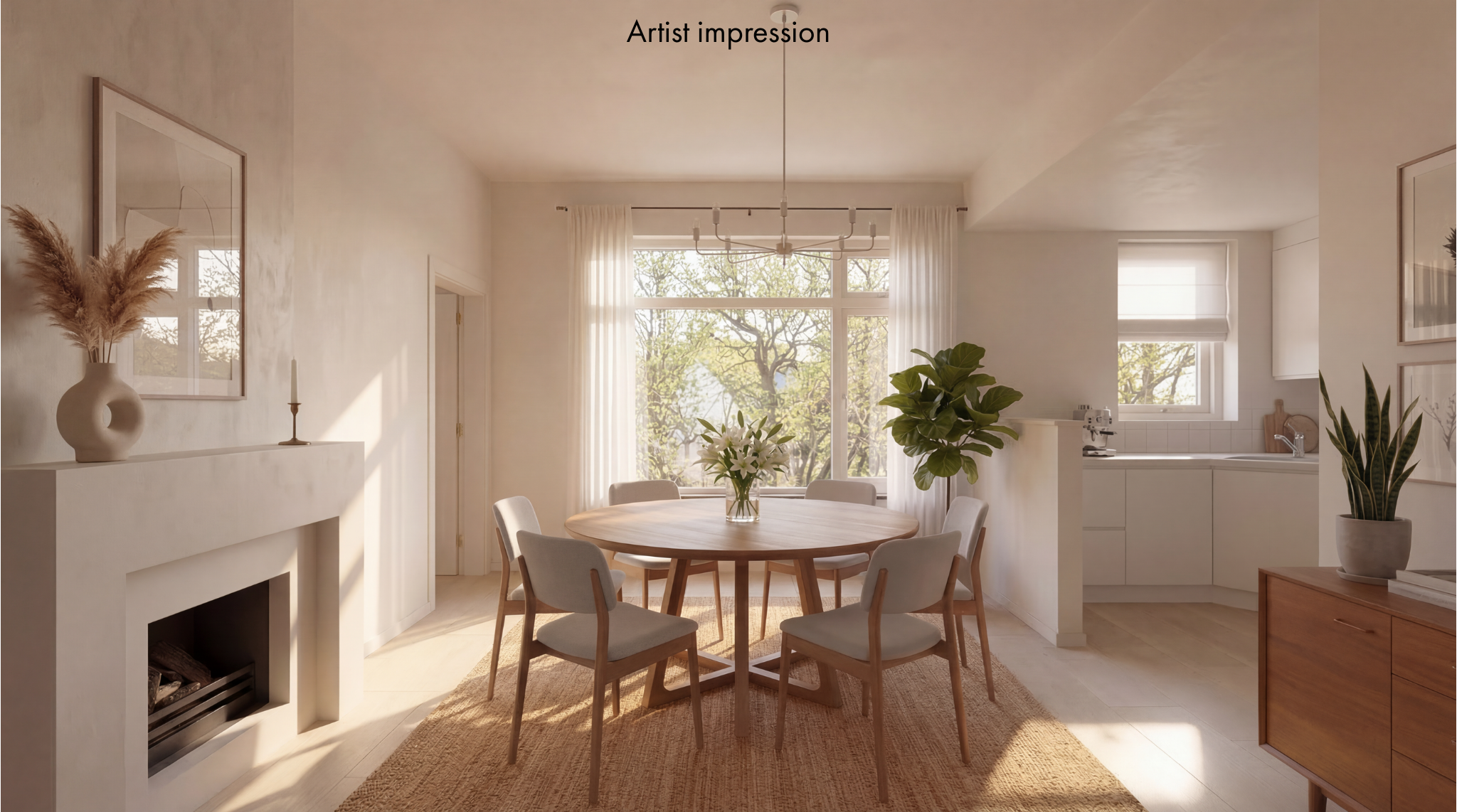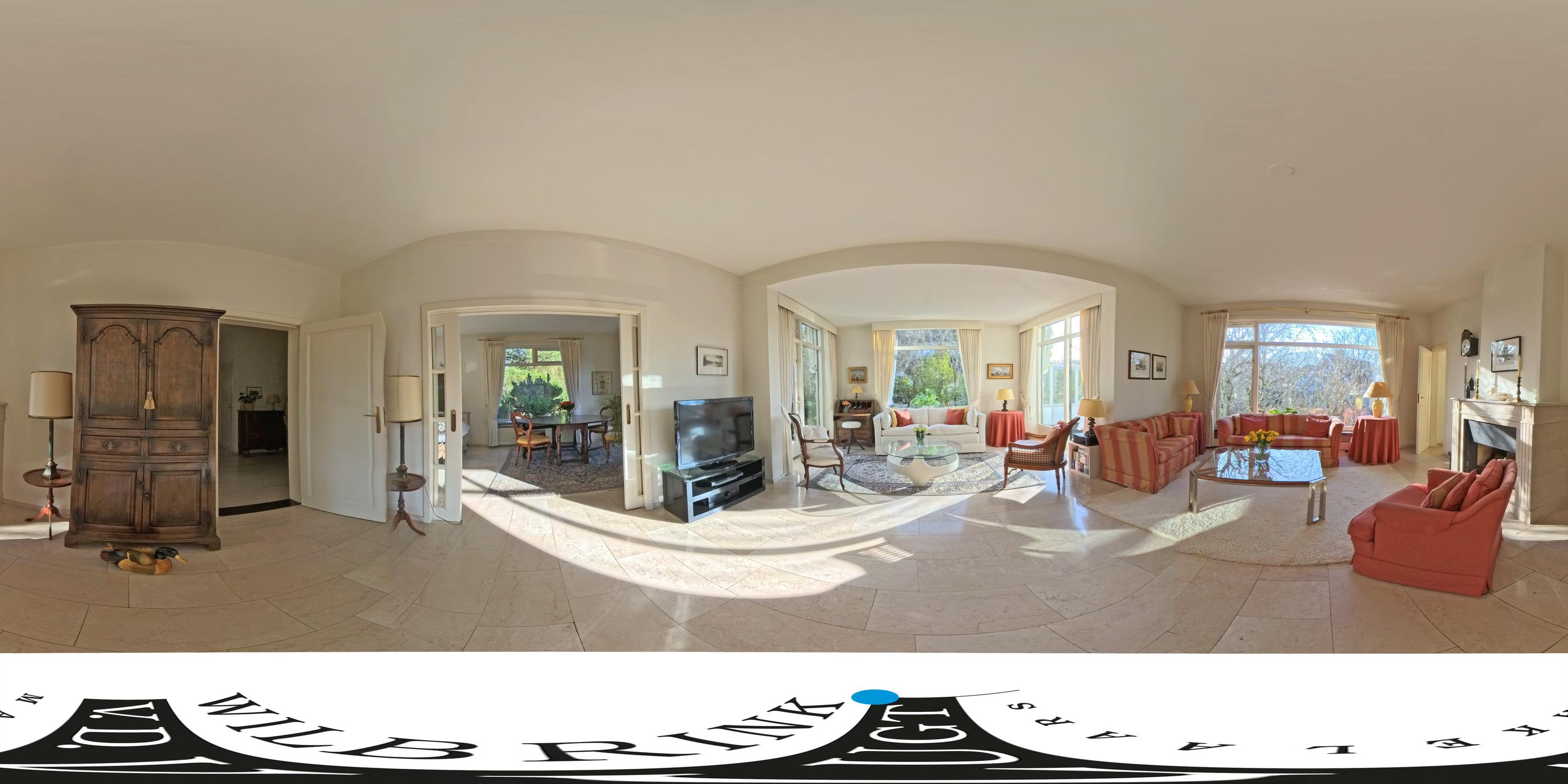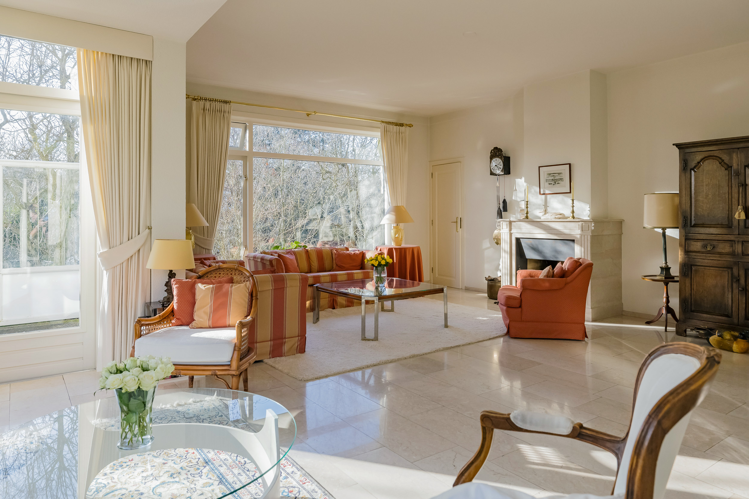De royale woonkamer is een heerlijke leefruimte met een warme, uitnodigende sfeer. De open haard en de elegante marmeren vloer geven de ruimte karakter, terwijl de deuren vanuit de woonkamer zorgen voor een directe verbinding met de tuin. De zon draait van ’s-ochtends tot ’s-avonds om het huis wat voor een prachtige lichtinval zorgt.