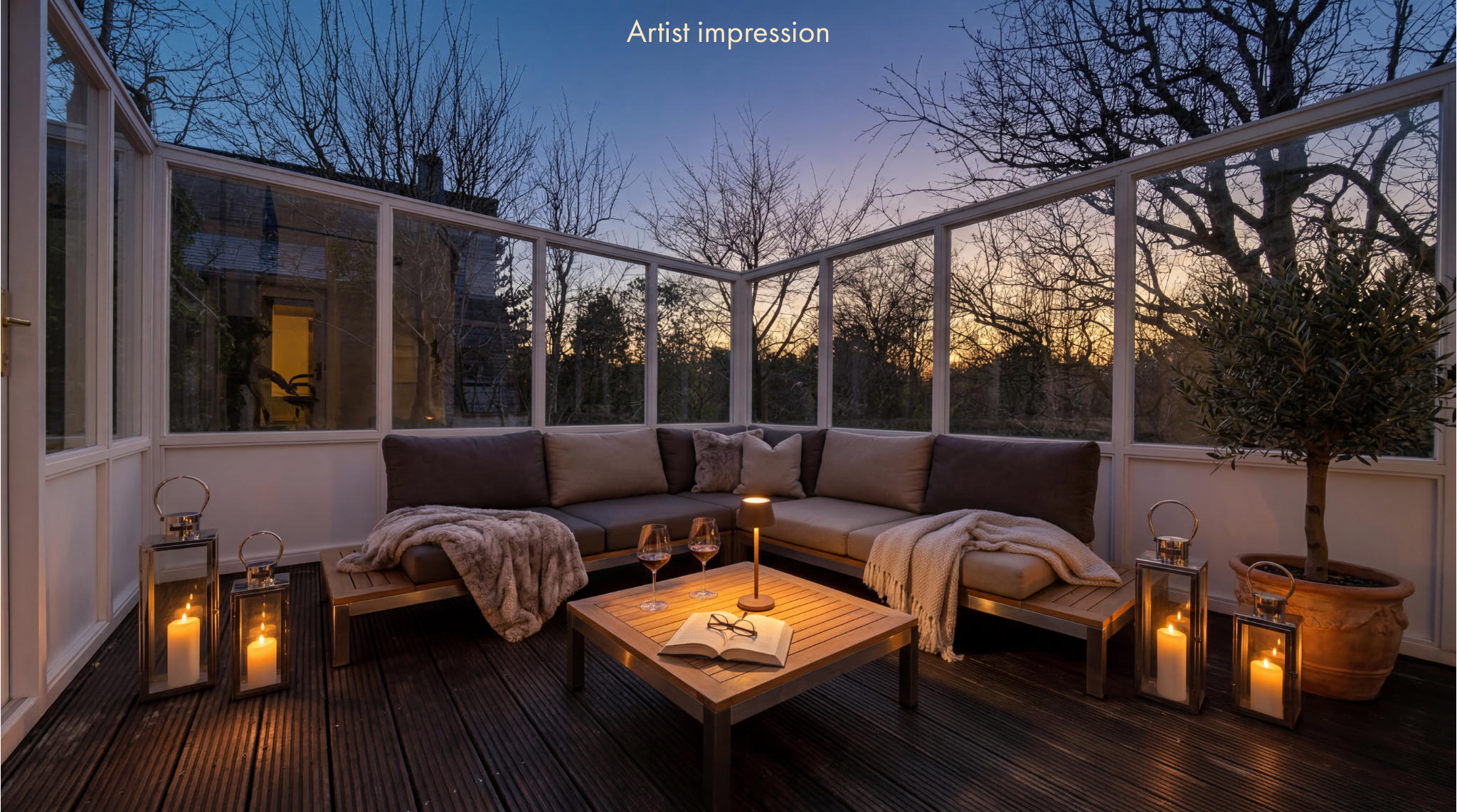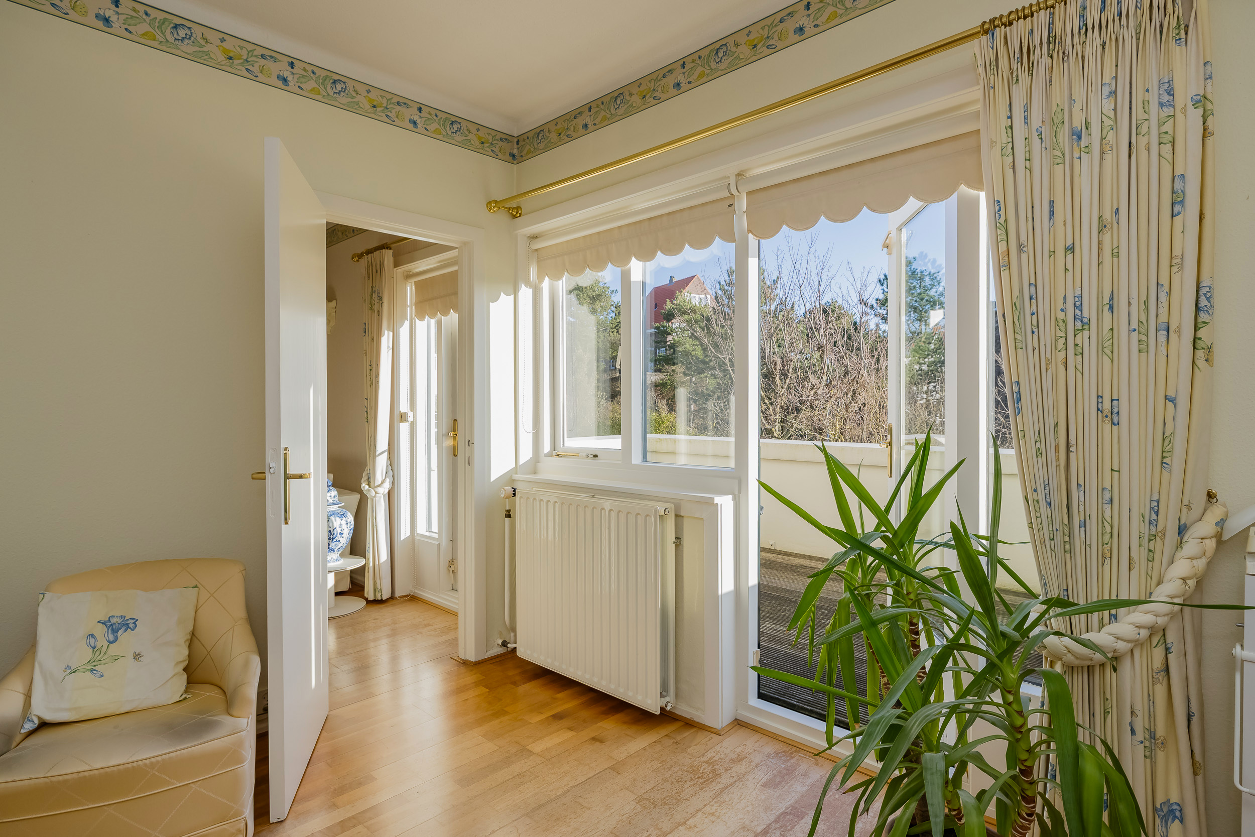 De eetkamer en-suite is met schuifdeuren handig af te sluiten van de woonkamer. Op het zonnige, met glas afgeschermde terras, geniet je al vroeg in het seizoen van de eerste zonnestralen, terwijl de deur op het terras directe toegang geeft tot de tuin.