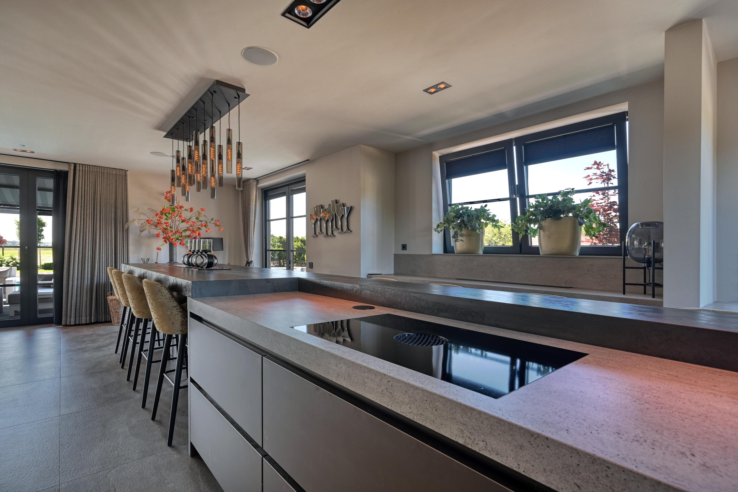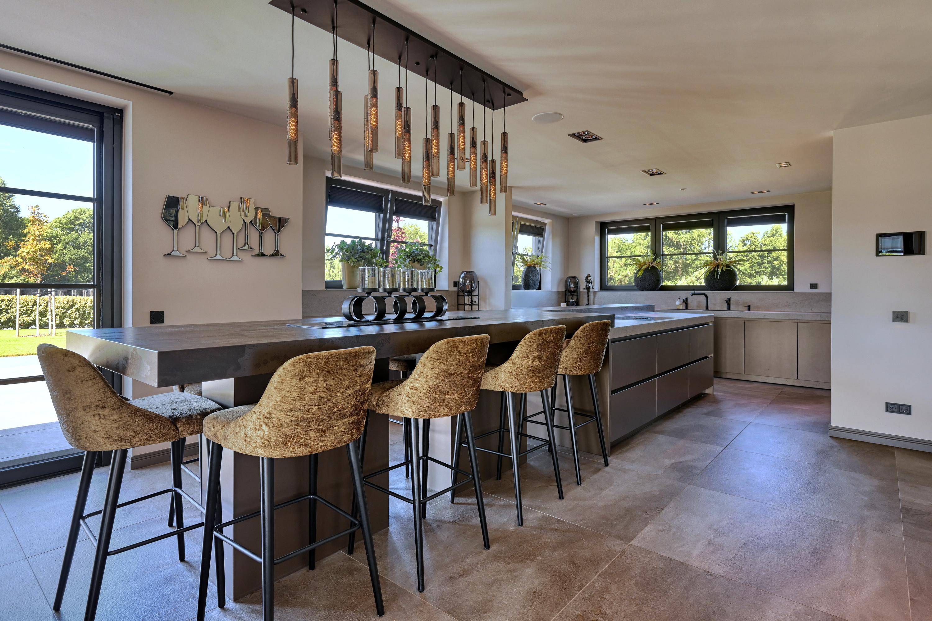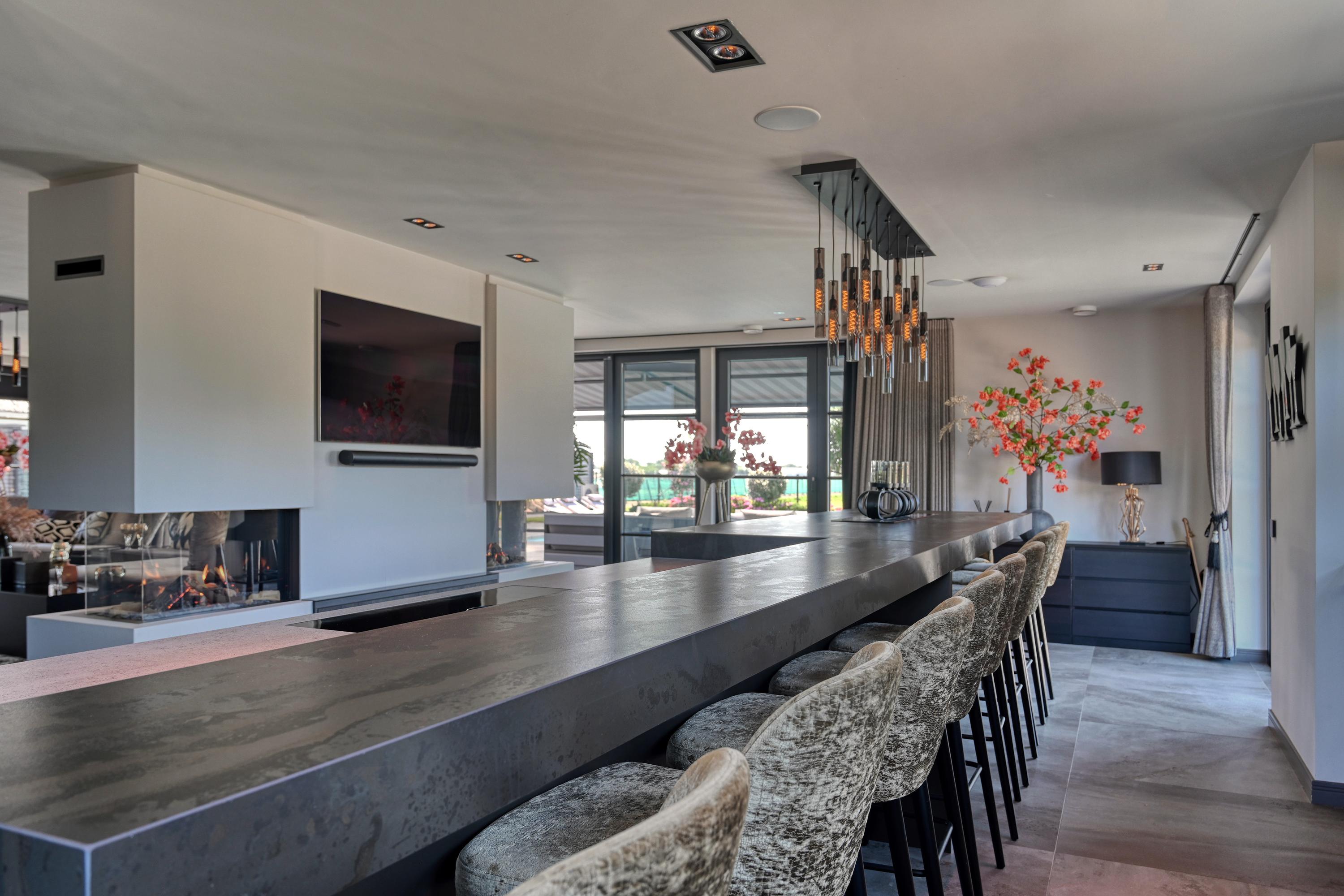 De aangrenzende woonkeuken is zeer royaal opgezet met een groot kookeiland met lange eetbar en vormt een fijne plek voor gezellig samenzijn. Ingericht met professionele apparatuur als; twee koel-/vrieskasten, twee ovens, twee combi magnetron/ovens, een ruime inductiekookplaat met geïntegreerd Bora afzuigsysteem, twee vaatwasmachines en een Quooker voor kokend, gezuiverd en bruisend water is deze keuken werkelijk van alle gemakken voorzien.