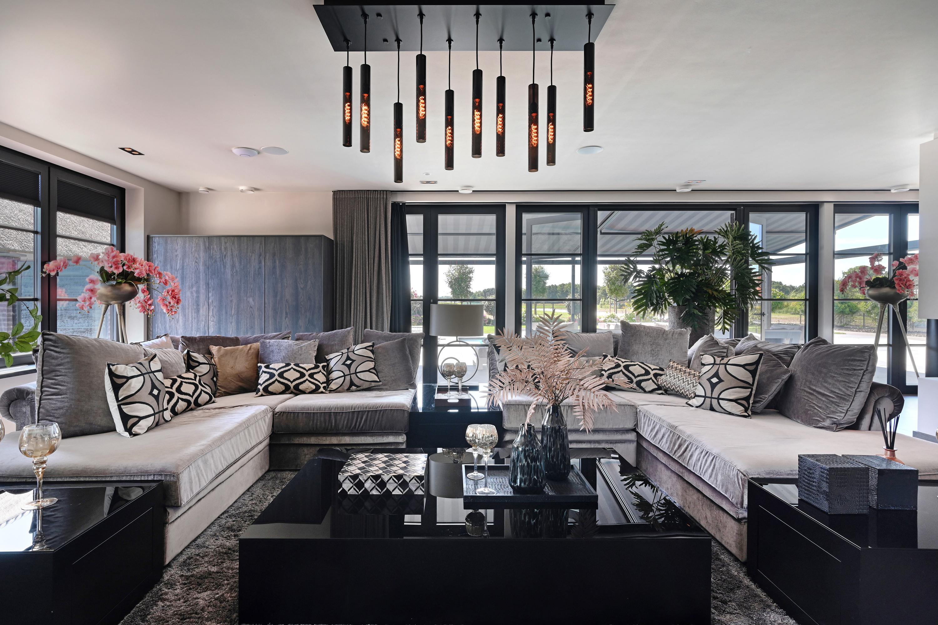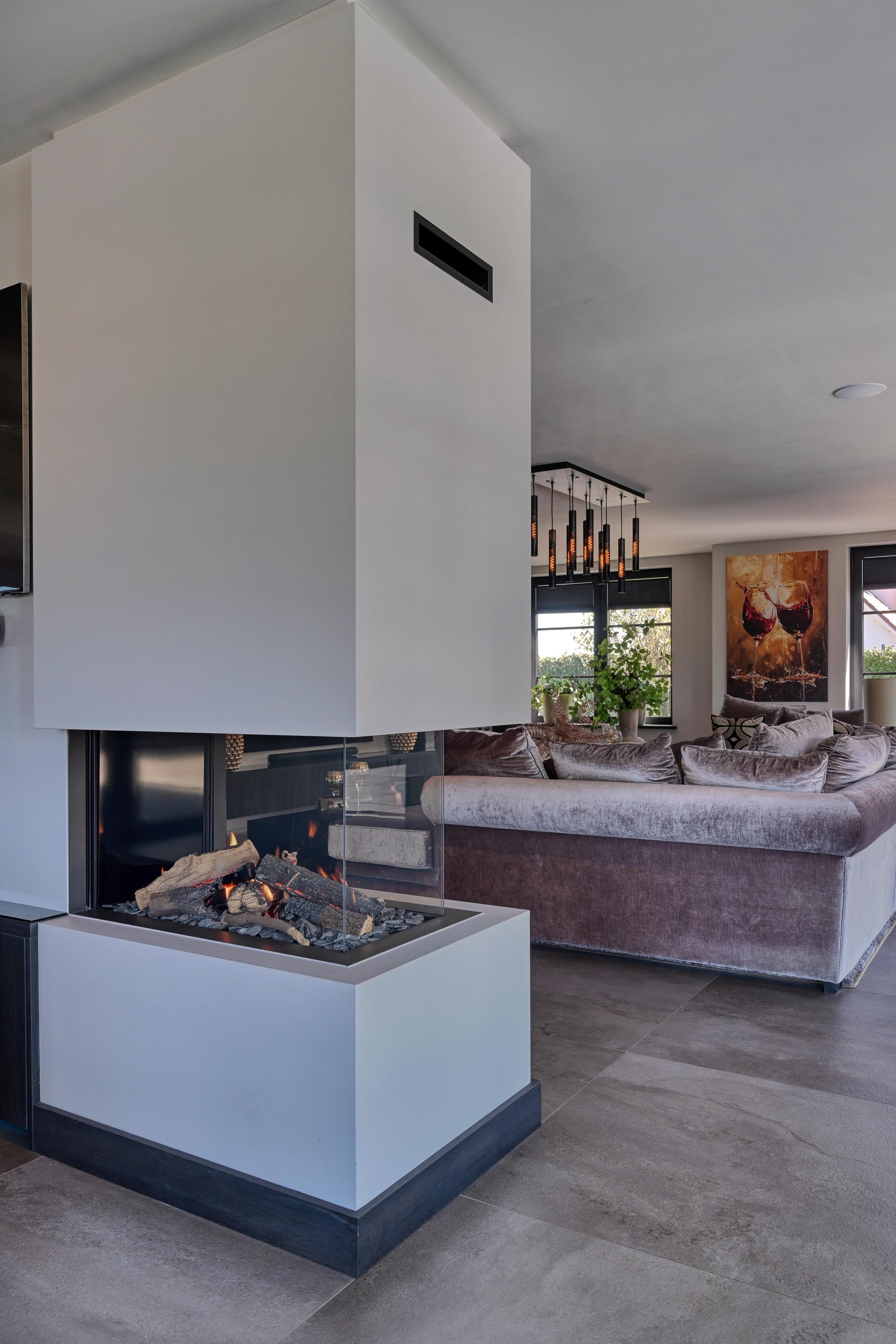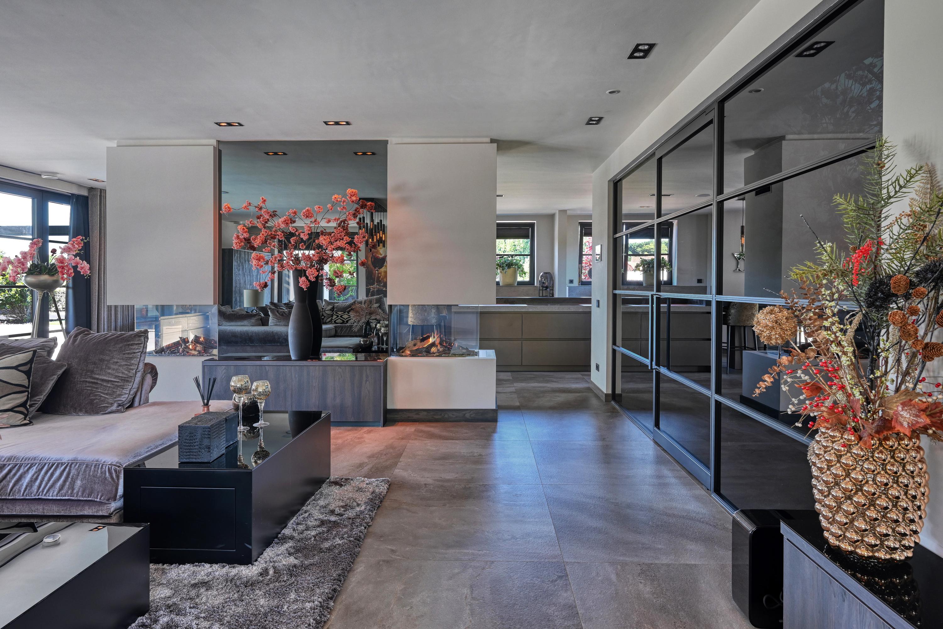 De riante living, met roomdevider voorzien van twee gashaarden, heeft een warme en uitnodigende sfeer en directe toegang tot de tuin.