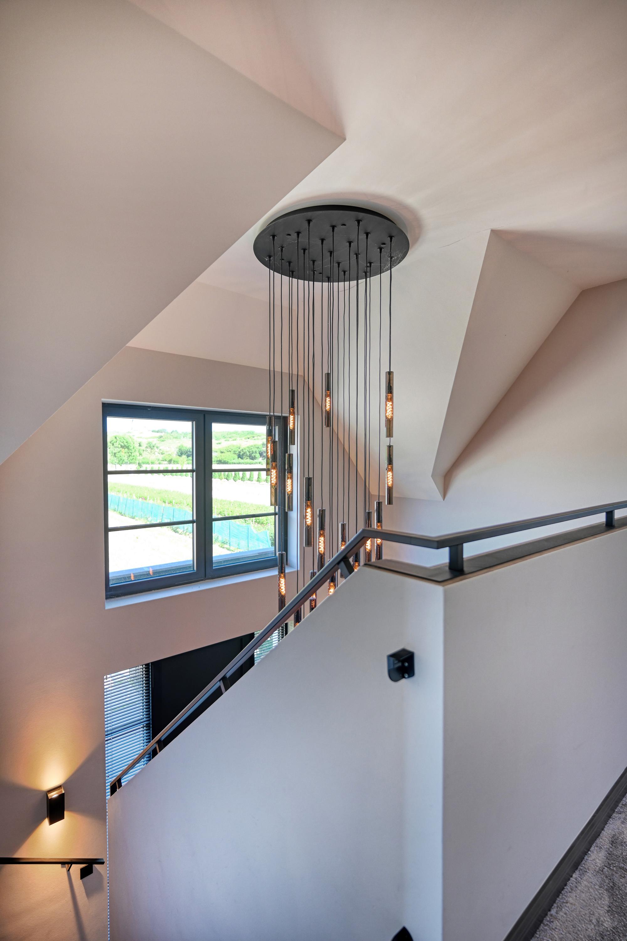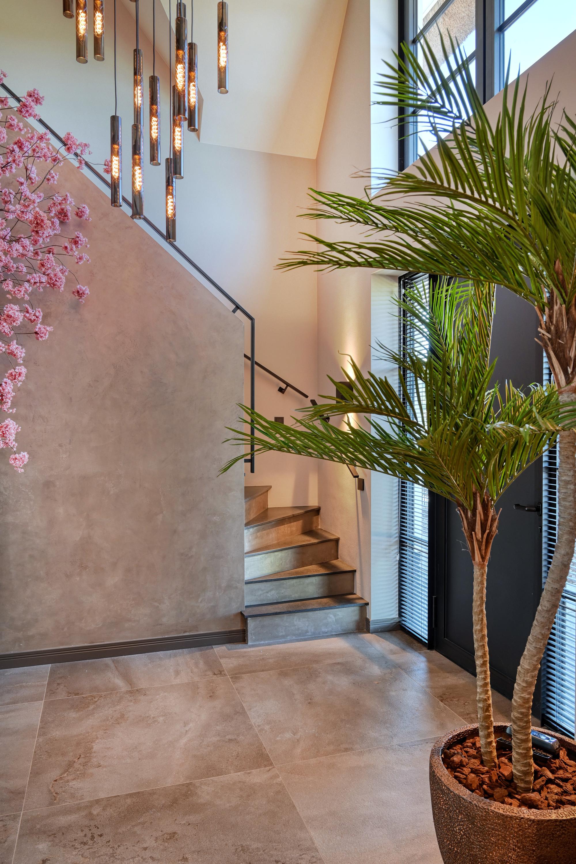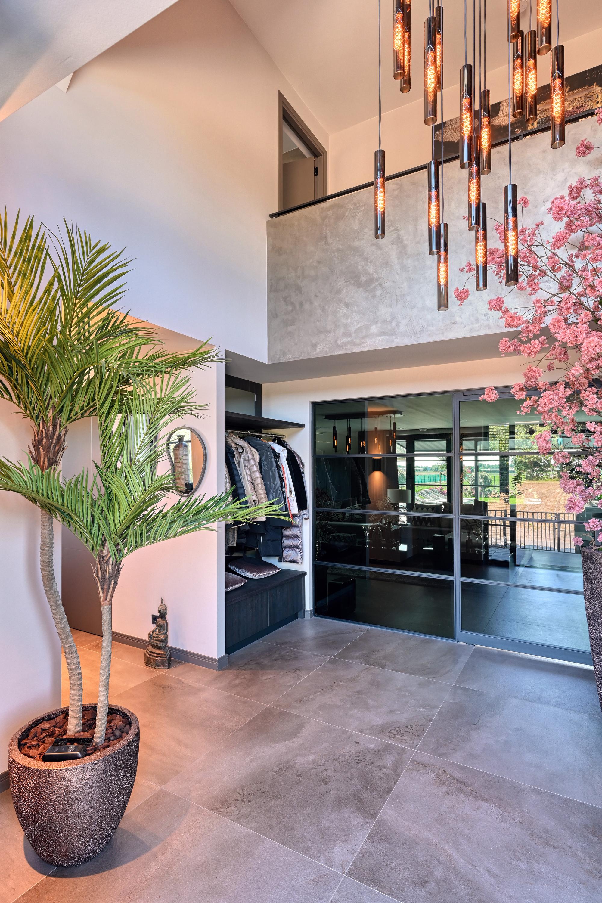 Bij binnenkomst een grote hal met vide en fraaie trapopgang, hier wordt direct duidelijk dat deze villa is ontworpen met gevoel voor ruimte en elegantie. Via stalen deuren met rookglas is er toegang tot de living.