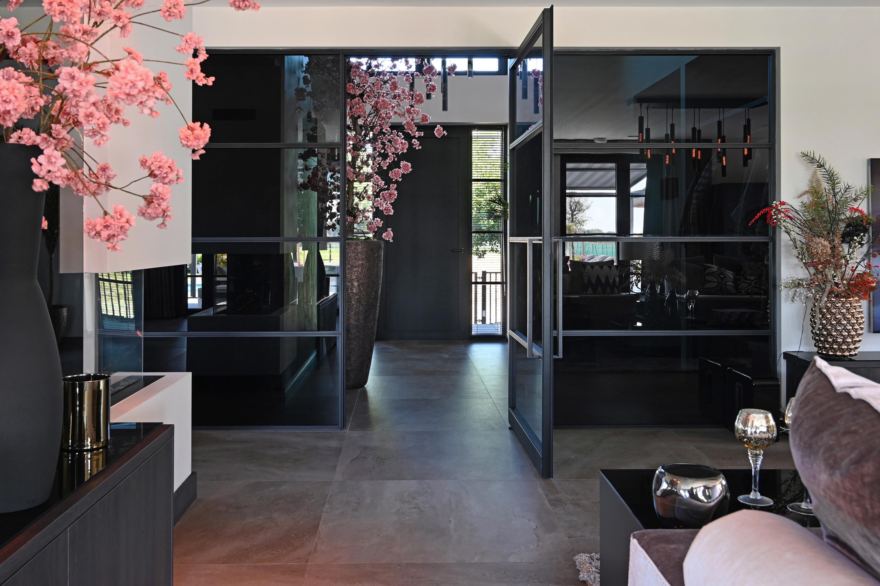 Grote raampartijen zorgen voor een overvloed aan lichtinval en de roomdevider zorgt voor een speelse verbinding met de living.