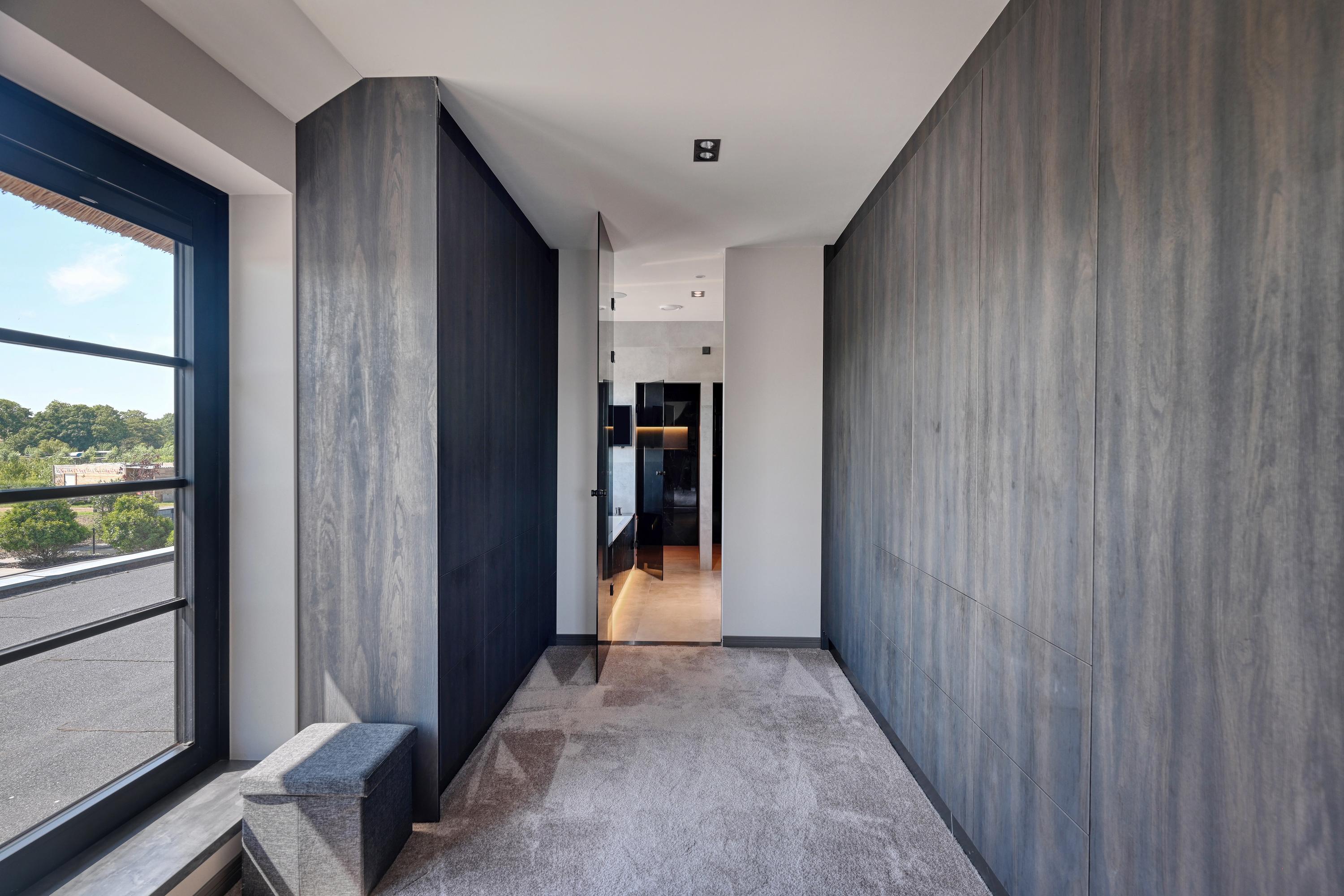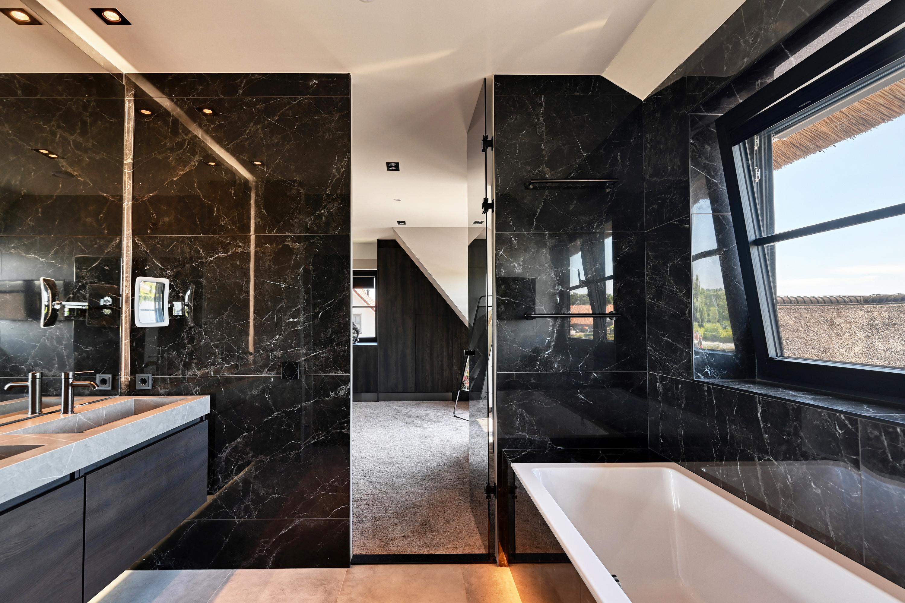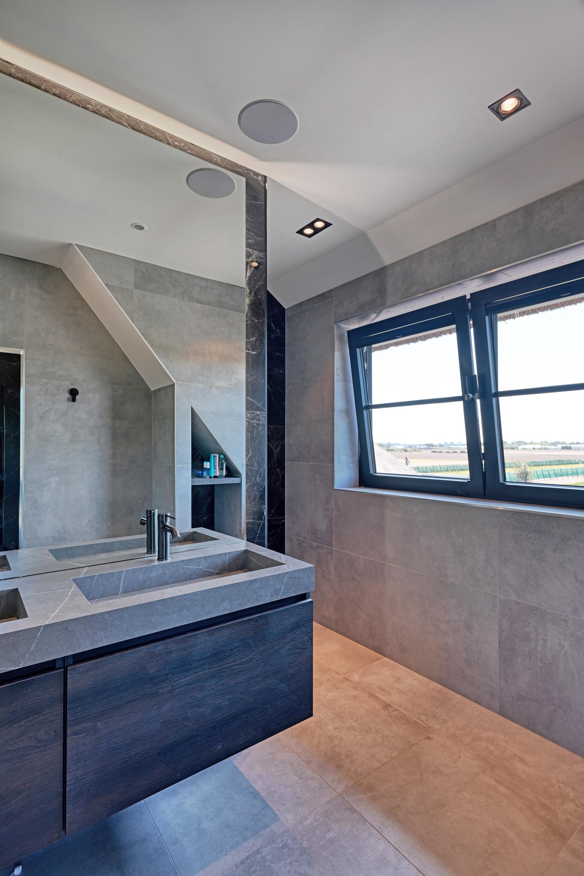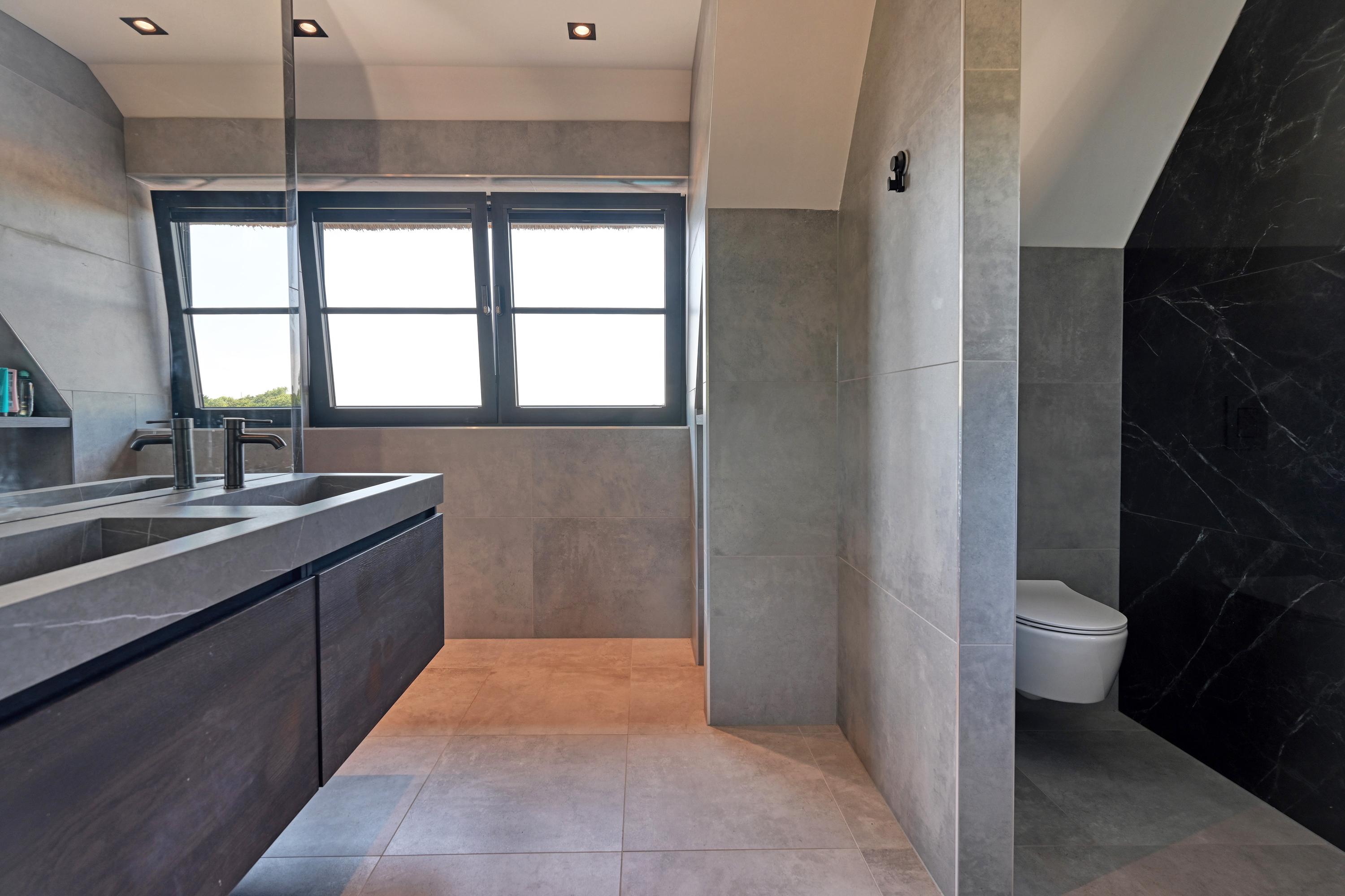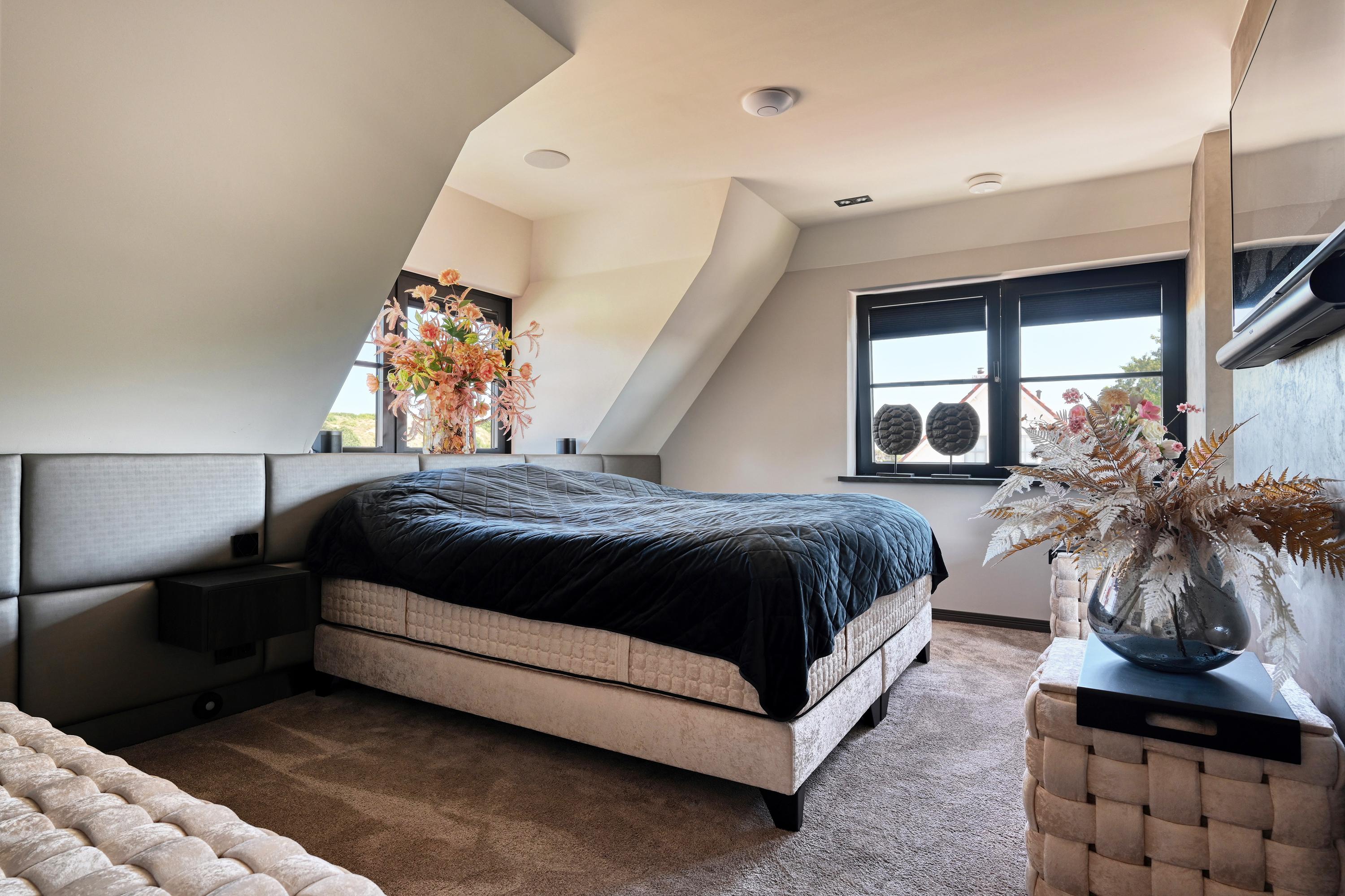 Op de verdieping bevinden zich twee ruime slaapkamers en twee luxe badkamers met dezelfde warme sfeer maar met wisselend uitzicht over bollenvelden en duinen. De hoofdslaapkamer heeft een eigen fraaie kleedkamer met aansluitend een en-suite badkamer welke is voorzien van een ligbad, luxe dubbel wastafelmeubel, doucheruimte en toiletruimte.