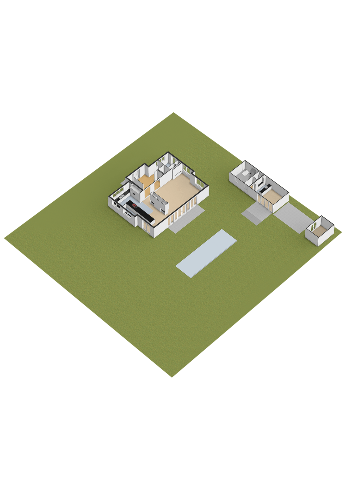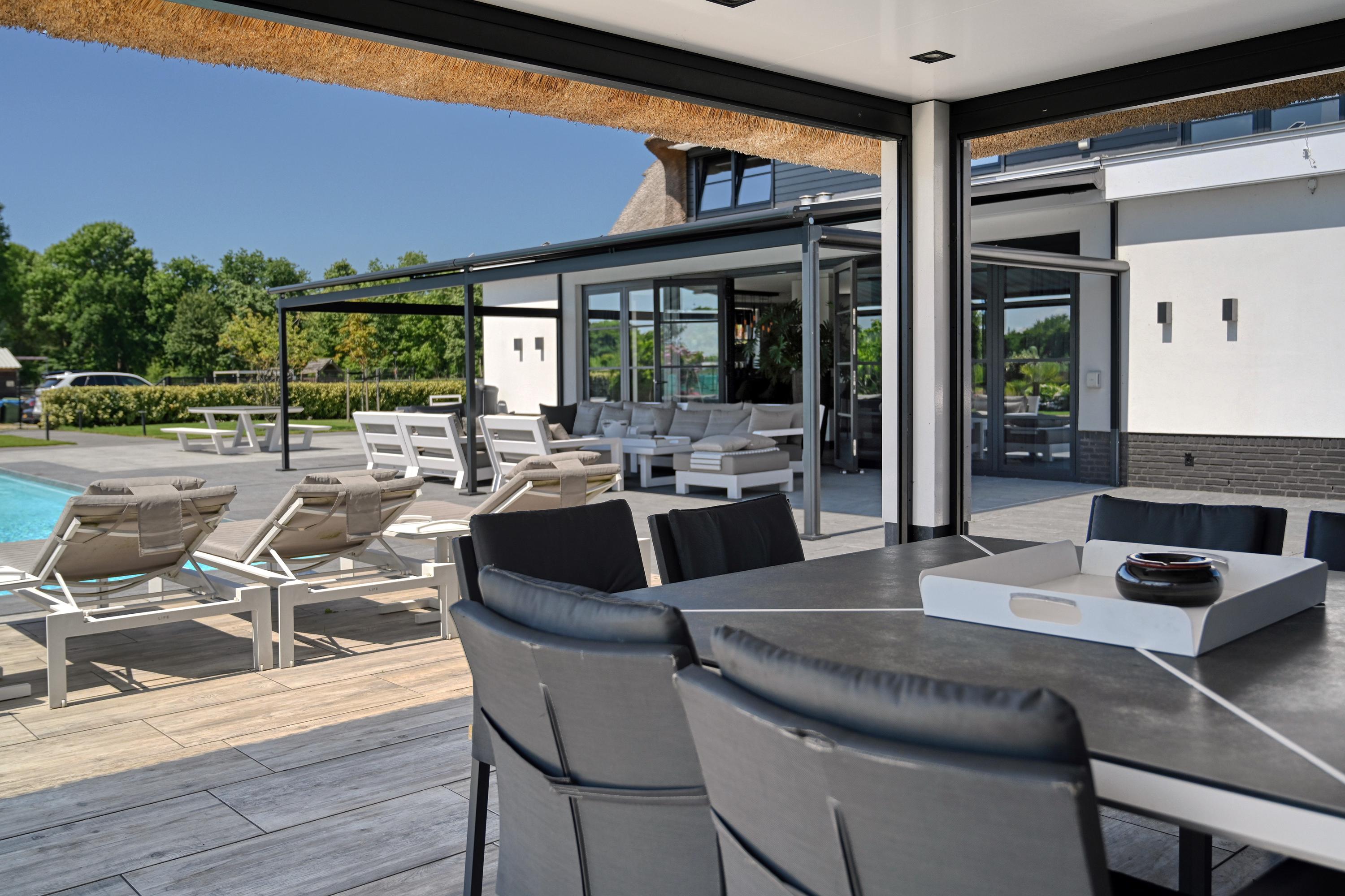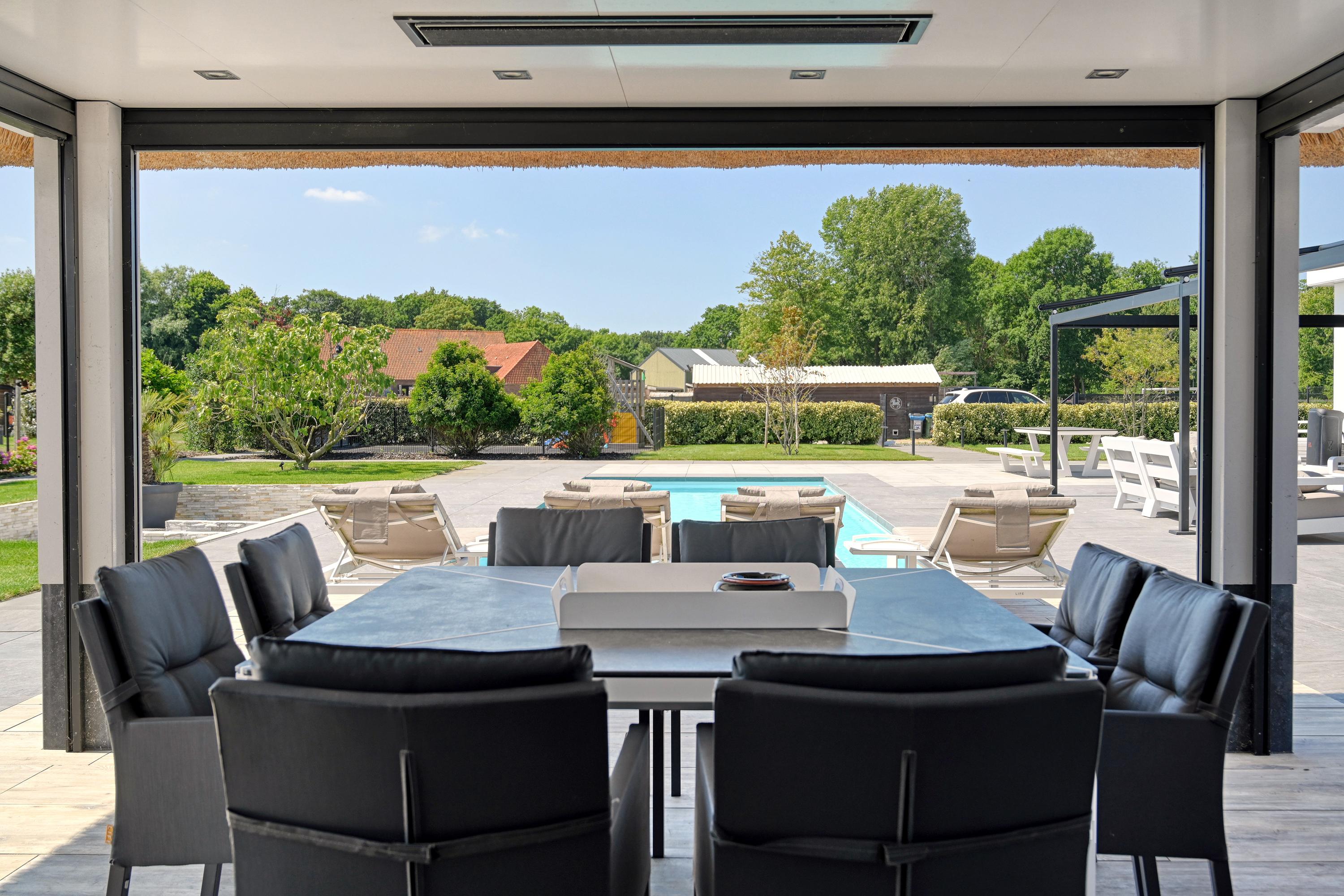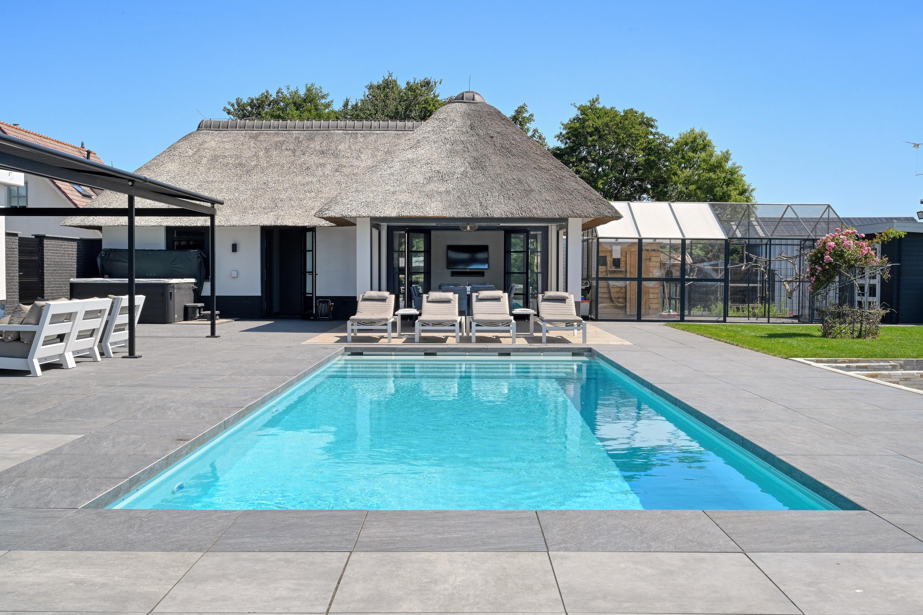 Het poolhouse is voorzien van een fraaie veranda met heaters en screens. Over dit hele gebouw een bergzolder bereikbaar via een vlizotrap.
