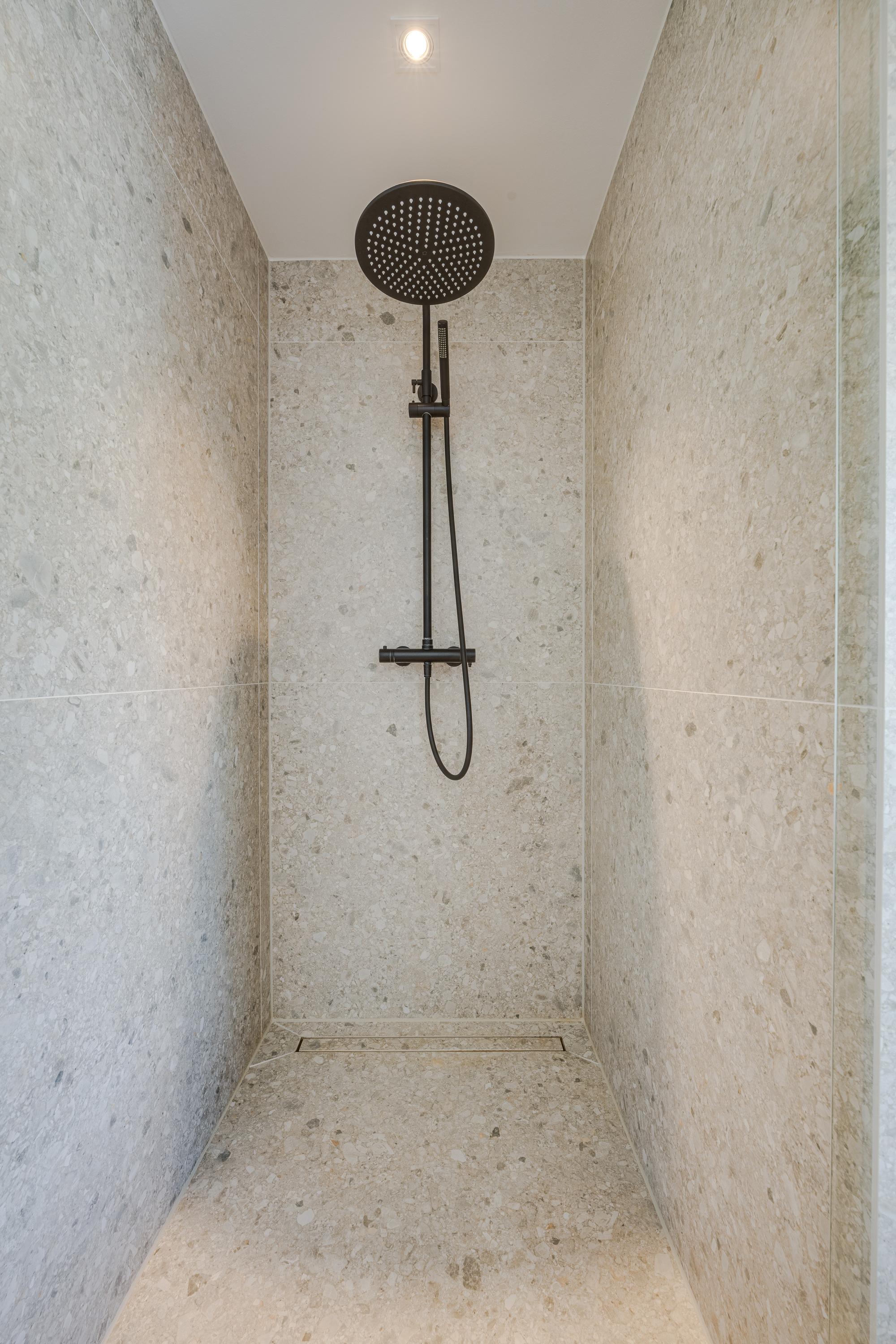 Aan de achterzijde van de woning ligt een royale slaapkamer met deur naar de tuin en een moderne badkamer en-suite met wastafel, douche en toilet; ideaal voor gasten of een au-pair.