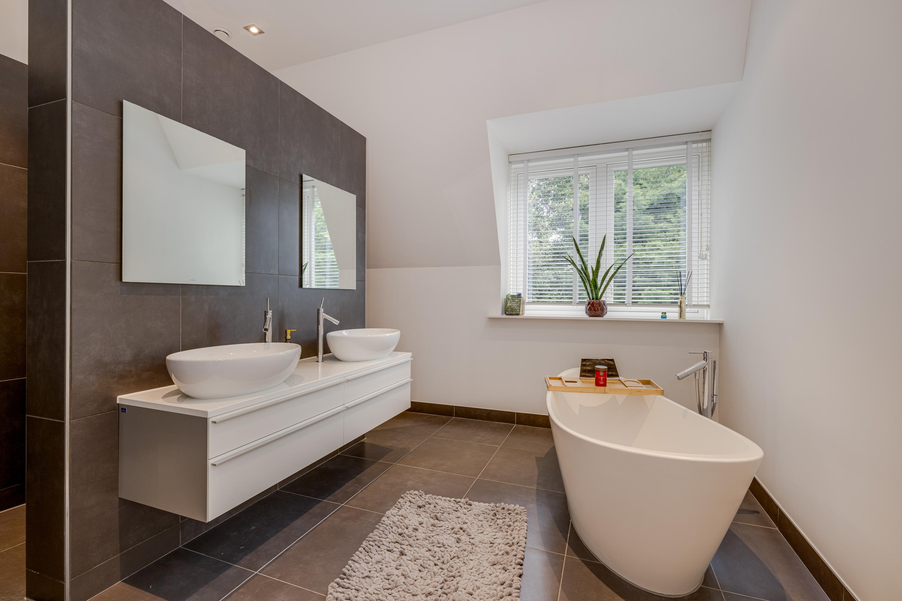 De master bedroom is voorzien van airconditioning en heeft een eigen zithoek, kleedkamer en luxe uitgevoerde badkamer met vrijstaand ligbad, dubbele wastafel, toilet, grote inloopdouche met regen- en handdouche en design handdoek radiator. Beide badkamers en de gang zijn voorzien van vloerverwarming.