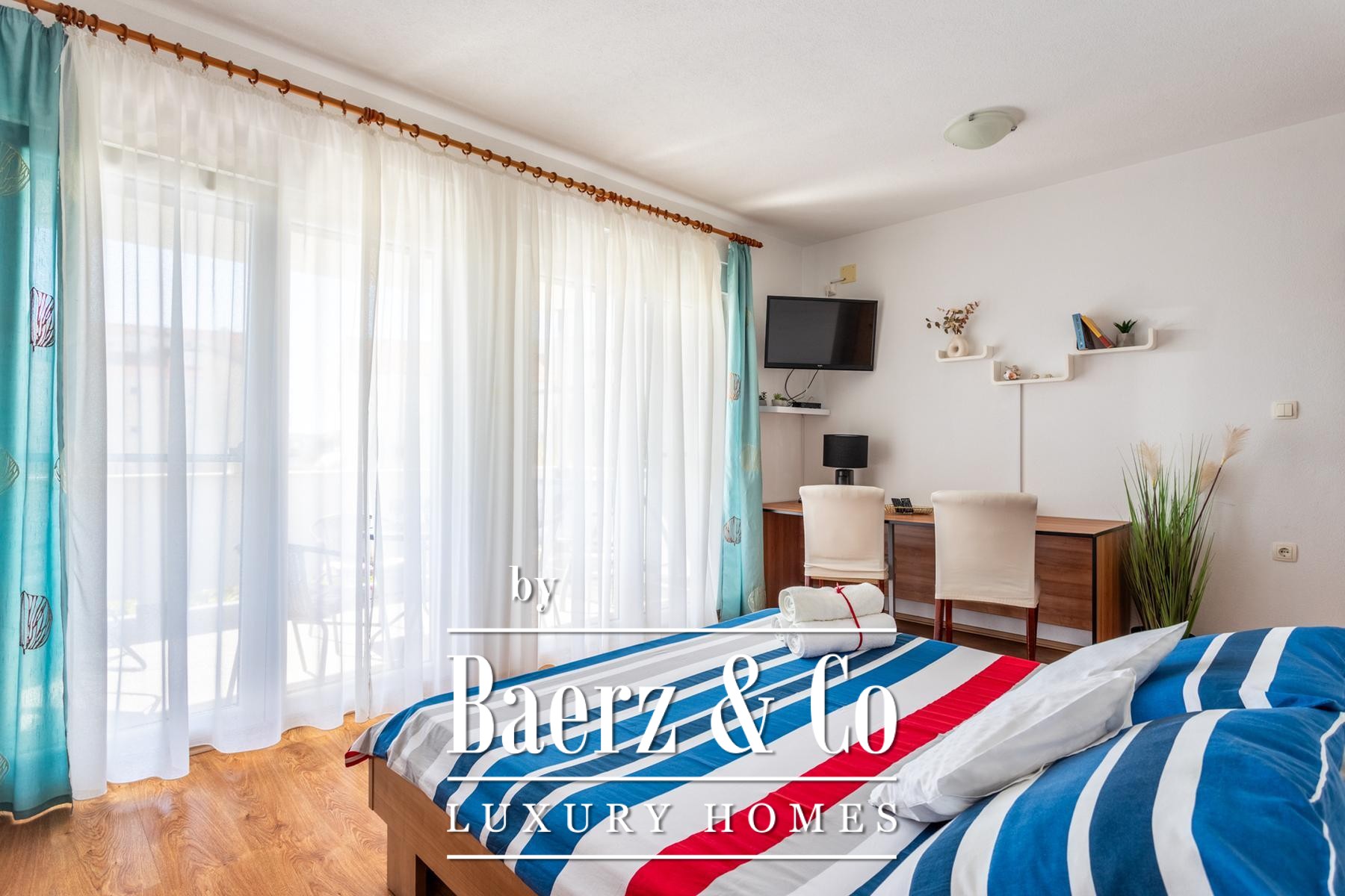 • Outdoor space features a well-maintained Mediterranean garden with olive trees, rosemary, grapevines, palms, and a variety of flowers, creating an ideal setting for relaxation. There is also an outdoor kitchen equipped with a fireplace, sink, and oven - perfect for gatherings in the shade of the grapevine.The apartments face east, south, and west, ensuring plenty of sunlight throughout the day, while the higher floors offer beautiful sea views.Five parking spaces are available directly next to the house.Further information available upon request.