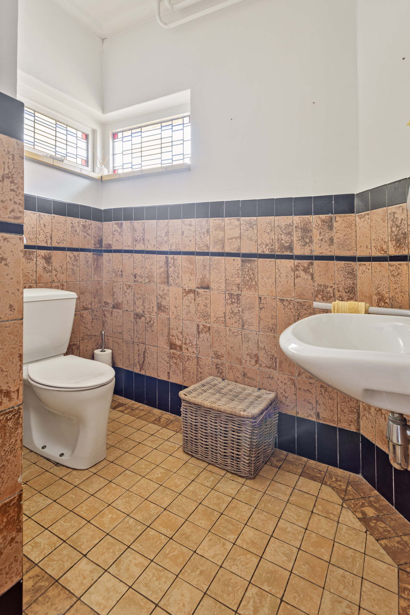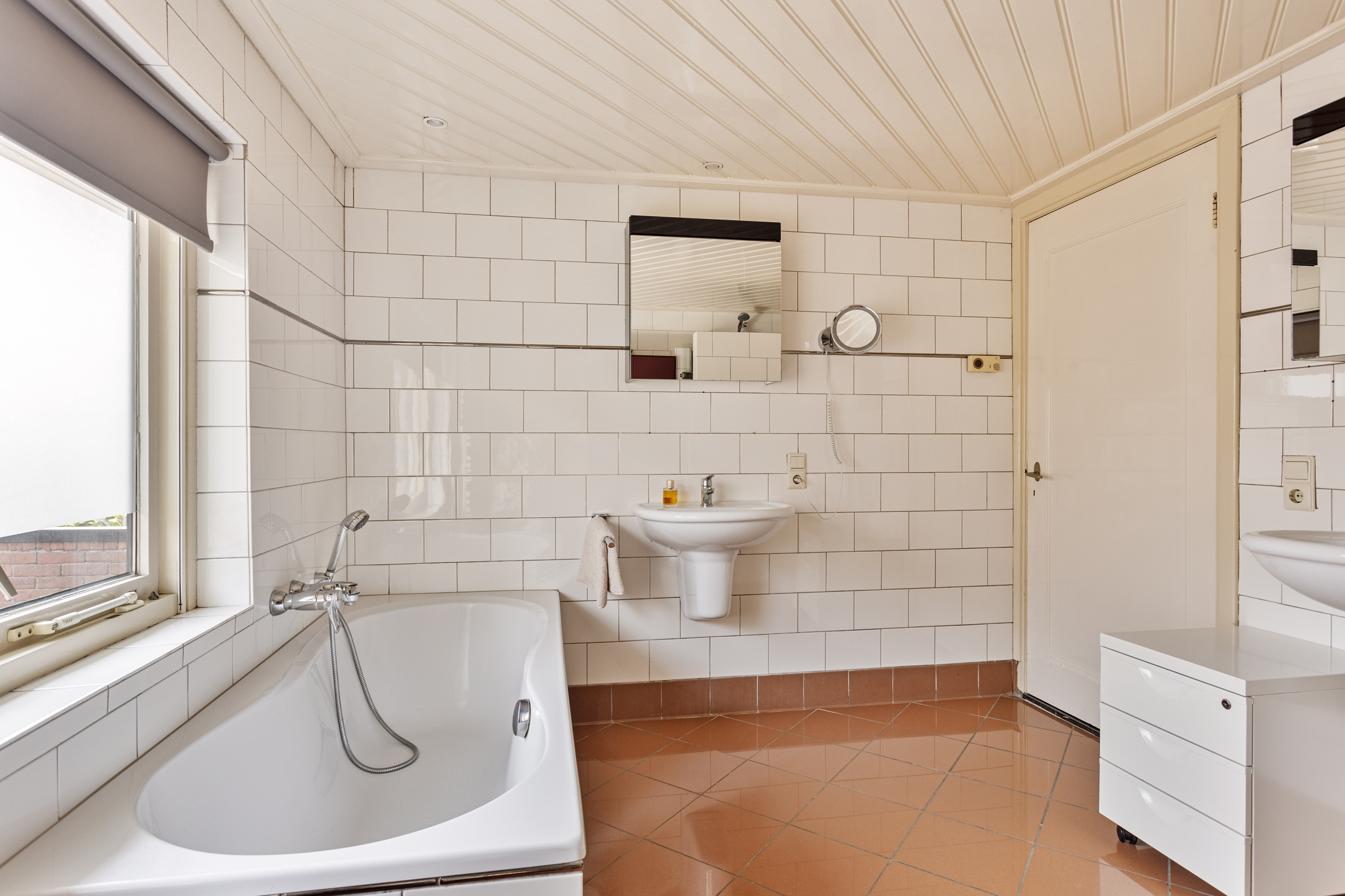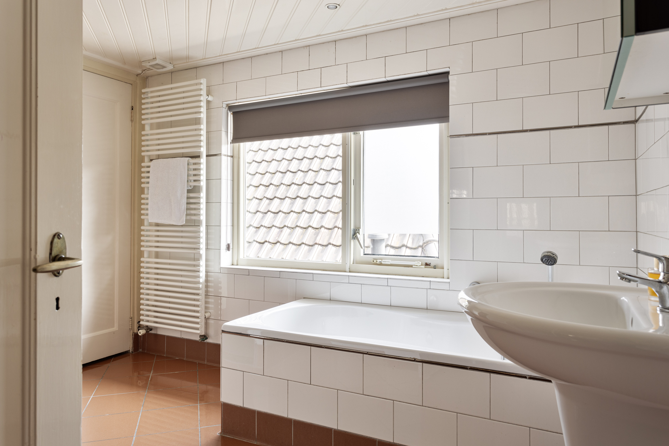 Eerste verdieping: grote overloop met vide welke toegang verleend aan 4 slaapkamers waarvan 2 v.v. vaste kast. De volledig betegelde badkamer is ingericht met een douche, dubbele wastafel, ligbad en vaste kast met Cv-ketel. Een separaat toilet met fonteintje op de overloop.