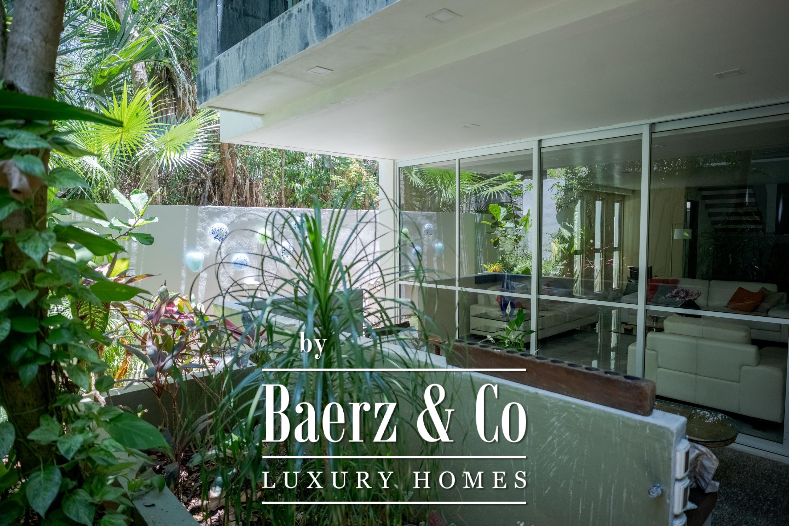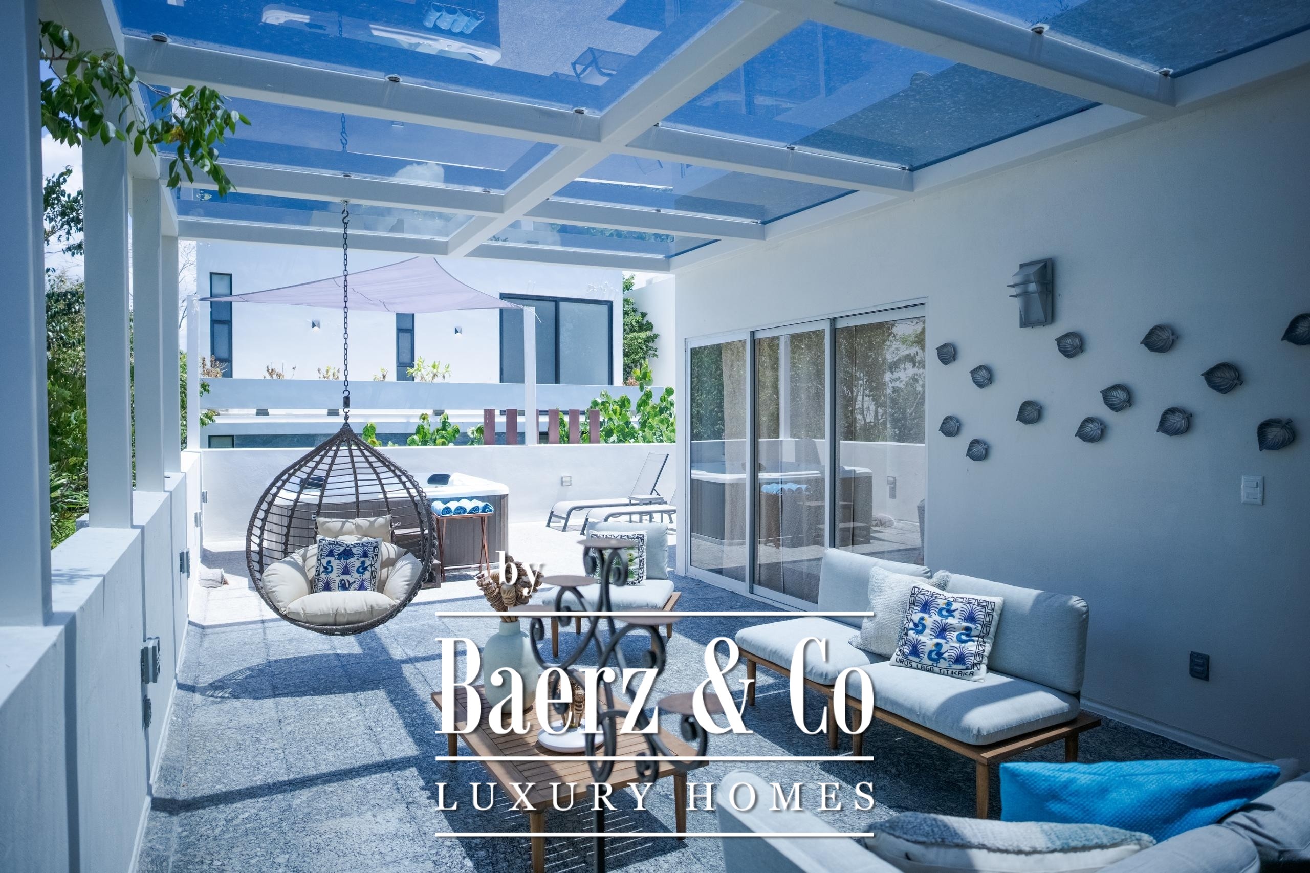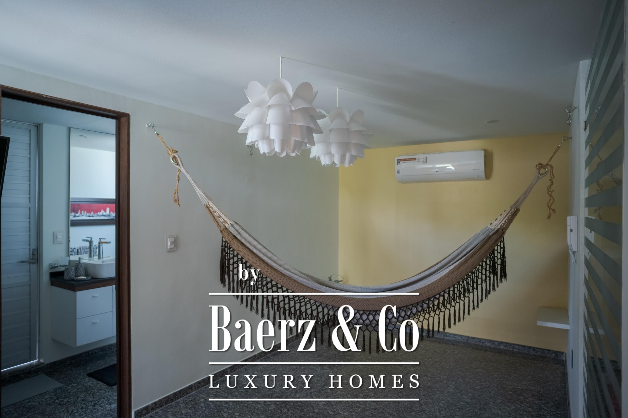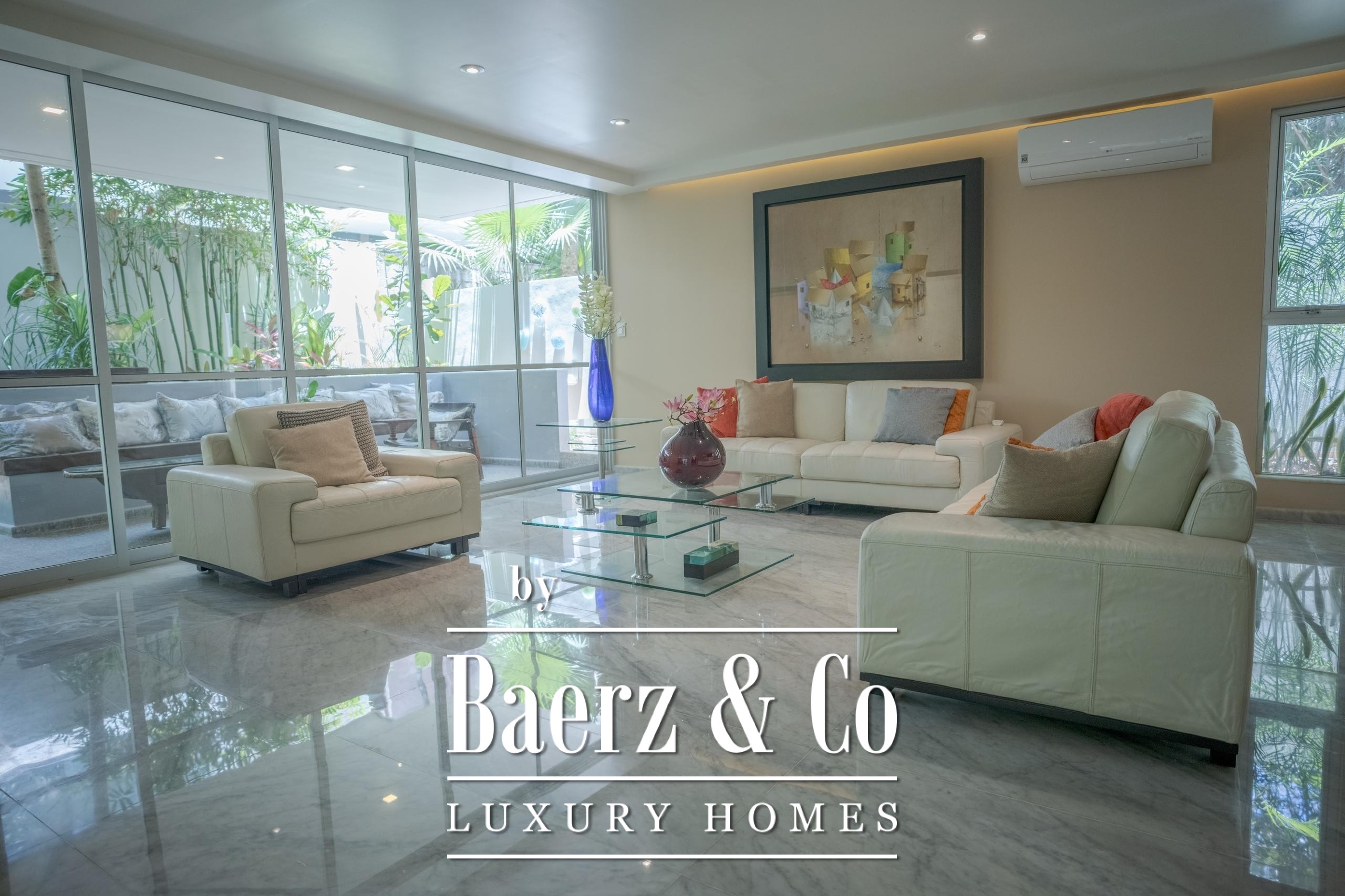 En planta baja, disfruta de una sala-comedor amplia con ventanales corredizos que se abren completamente hacia una terraza integrada con un hermoso jardín tropical, creando un ambiente ideal para el descanso o la convivencia. La cocina equipada cuenta con barra integrada al comedor, cubierta de granito negro y carpintería en madera, perfecta para quienes aman cocinar o recibir invitados.