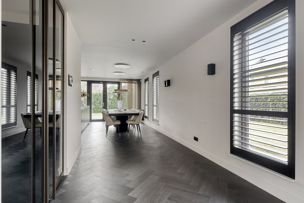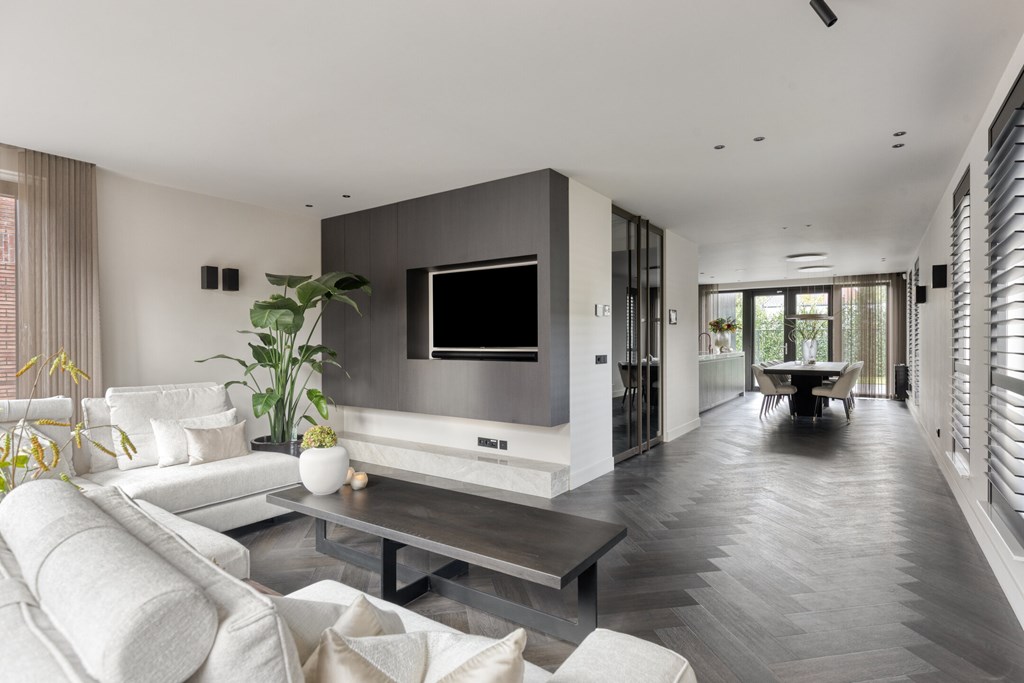 Via elegante taatsdeuren betreedt u de lichte en ruime woonkamer. De royale opzet biedt volop mogelijkheden voor een comfortabele zithoek. Een op maat gemaakt wandmeubel benadrukt de luxe uitstraling en biedt praktische bergruimte. De grote raampartijen rondom zorgen voor een overvloed aan daglicht en een vloeiende verbinding tussen binnen en buiten.