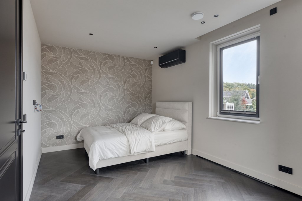 De trap in de hal leidt naar de eerste verdieping, waar u drie ruime slaapkamers en een hoogwaardig ingerichte badkamer aantreft. De gehele verdieping beschikt over vloerverwarming en vloerkoeling. Twee slaapkamers zijn voorzien van airconditioning en maatwerk kasten en bureaus. De derde slaapkamer is ingericht als kastenkamer. Bovendien zijn er screens geplaatst voor optimaal comfort in elk seizoen.