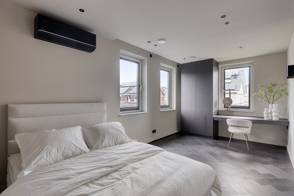 De moderne badkamer is volledig betegeld en voorzien van een inloopdouche met glazen wand, een dubbele wastafel met spiegel en Sonos-speaker. Op de overloop bevindt zich een separate toiletruimte met zwevend toilet. Alles straalt kwaliteit en comfort uit.