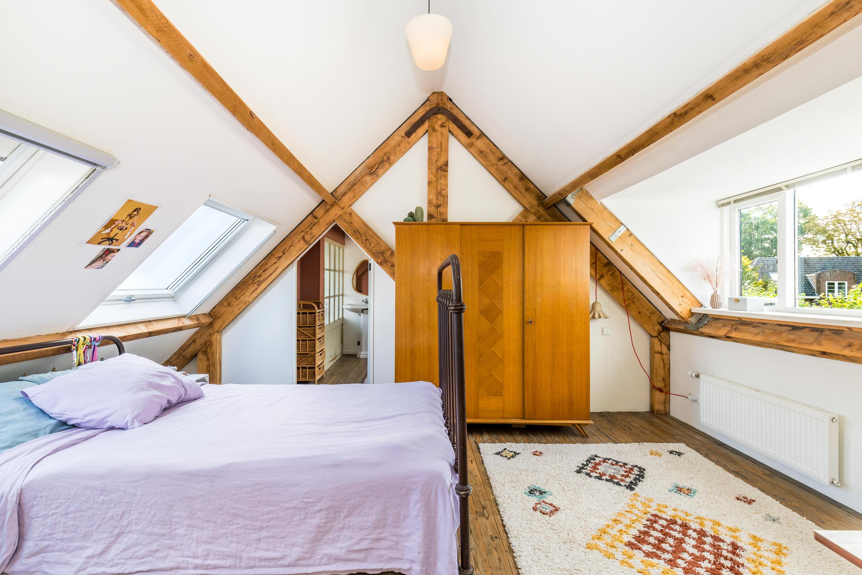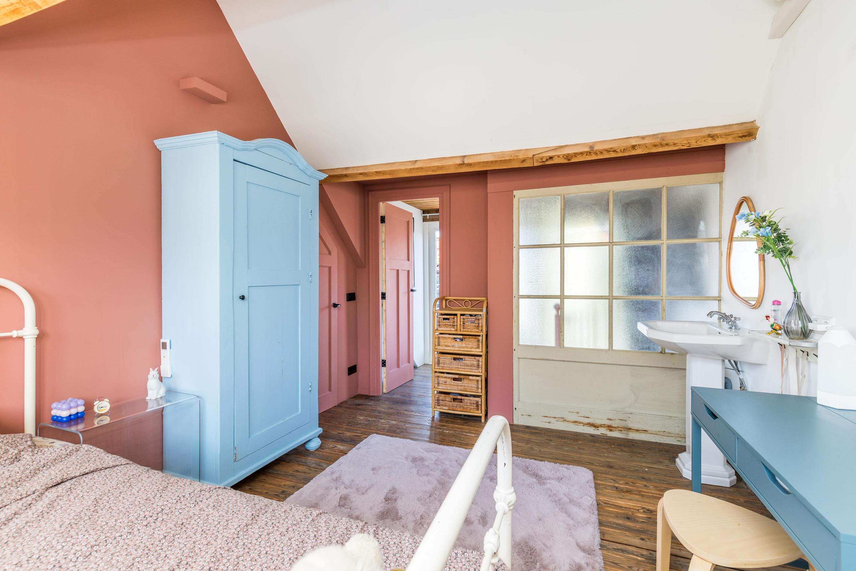 Op de eerste verdieping bevindt zich een royale slaapkamer met grote kasten, een apart toilet en een comfortabele badkamer met ligbad en dubbele douche.