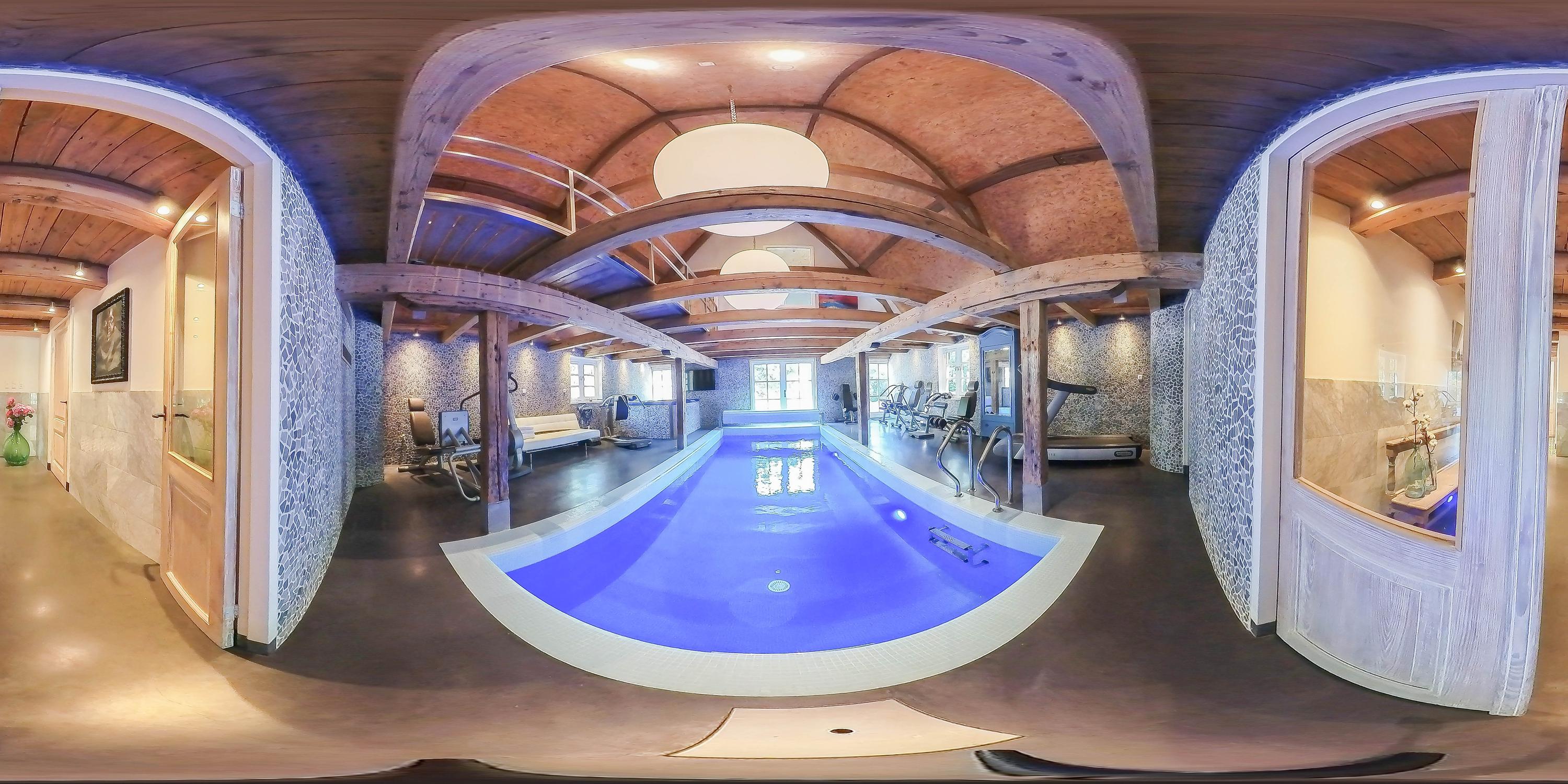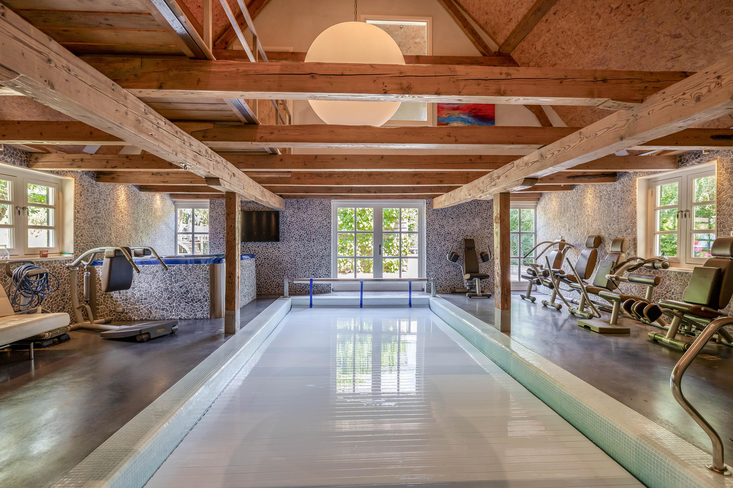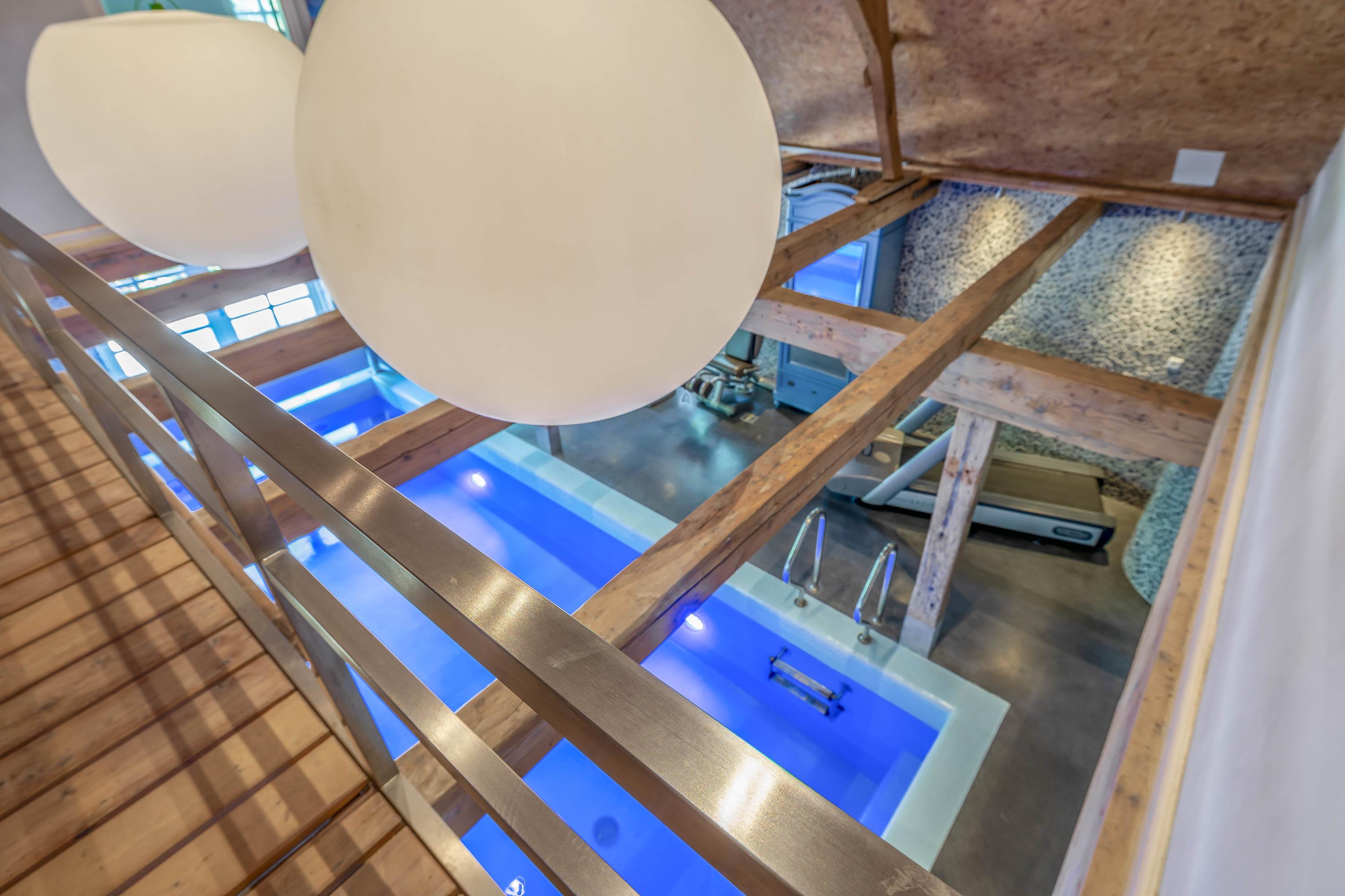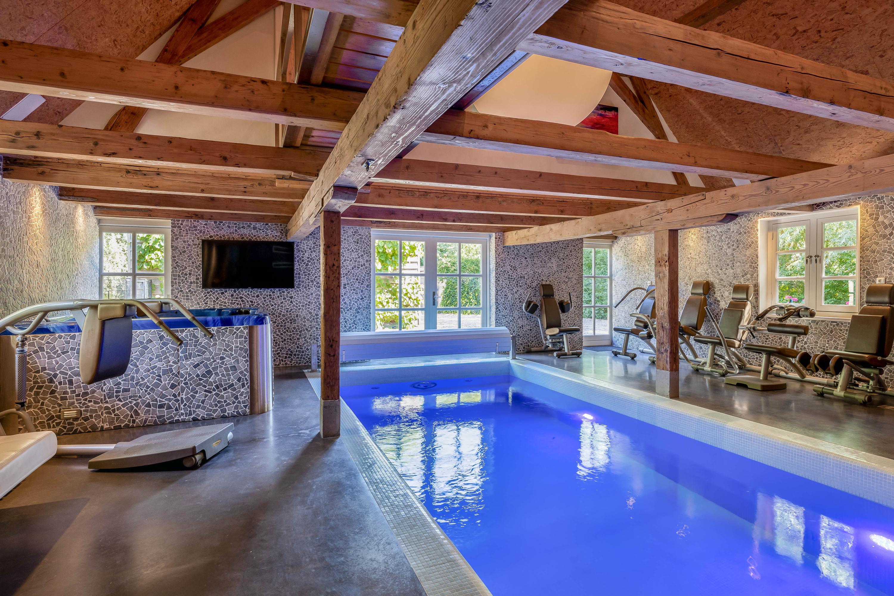 De absolute blikvanger is de wellnessruimte in de voormalige stal. Hier is een luxe binnenzwembad gerealiseerd met automatisch roldek, grote jacuzzi, fitnessruimte en voorbereidingen voor een sauna – alles omgeven door originele stalramen en robuuste houten spanten.