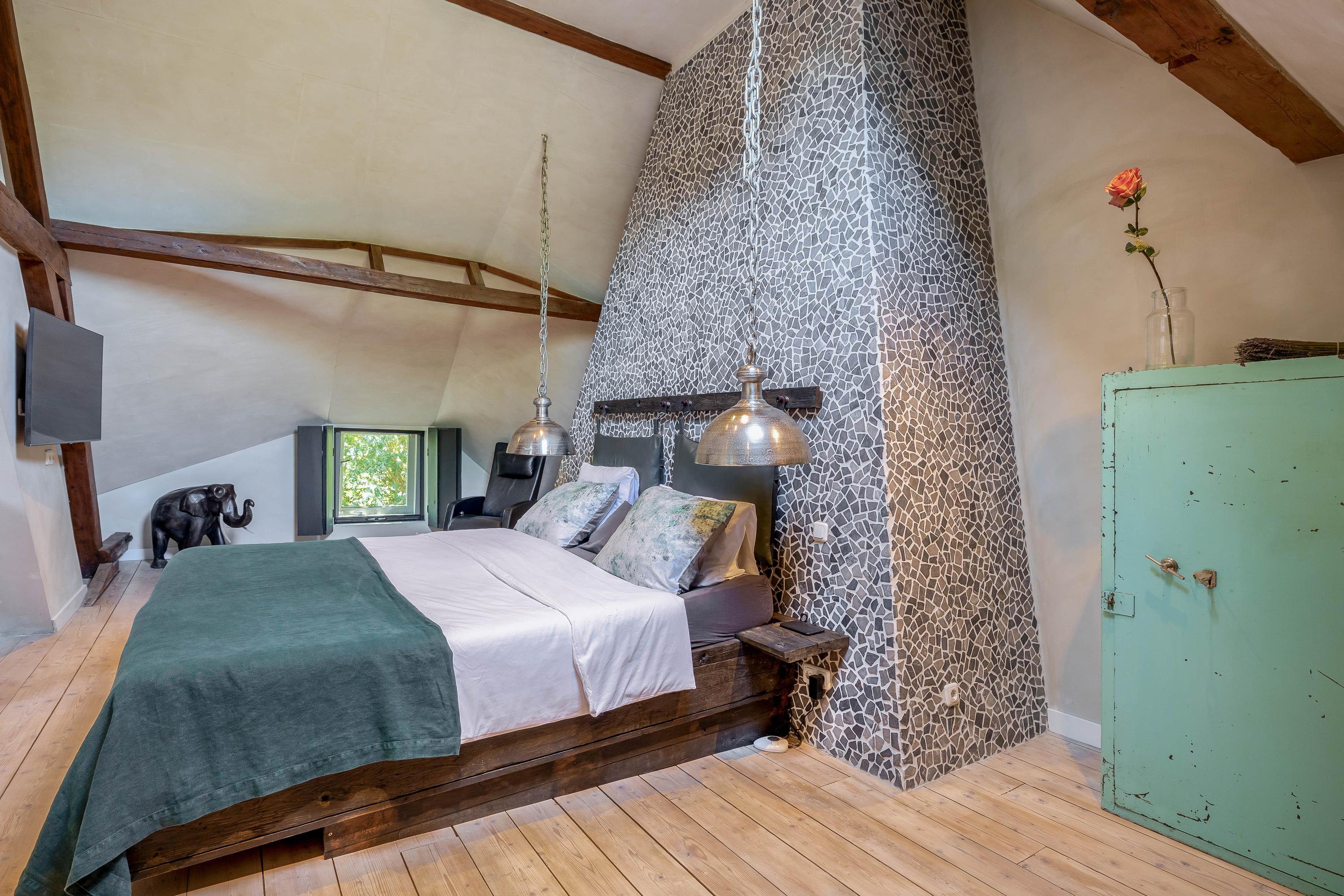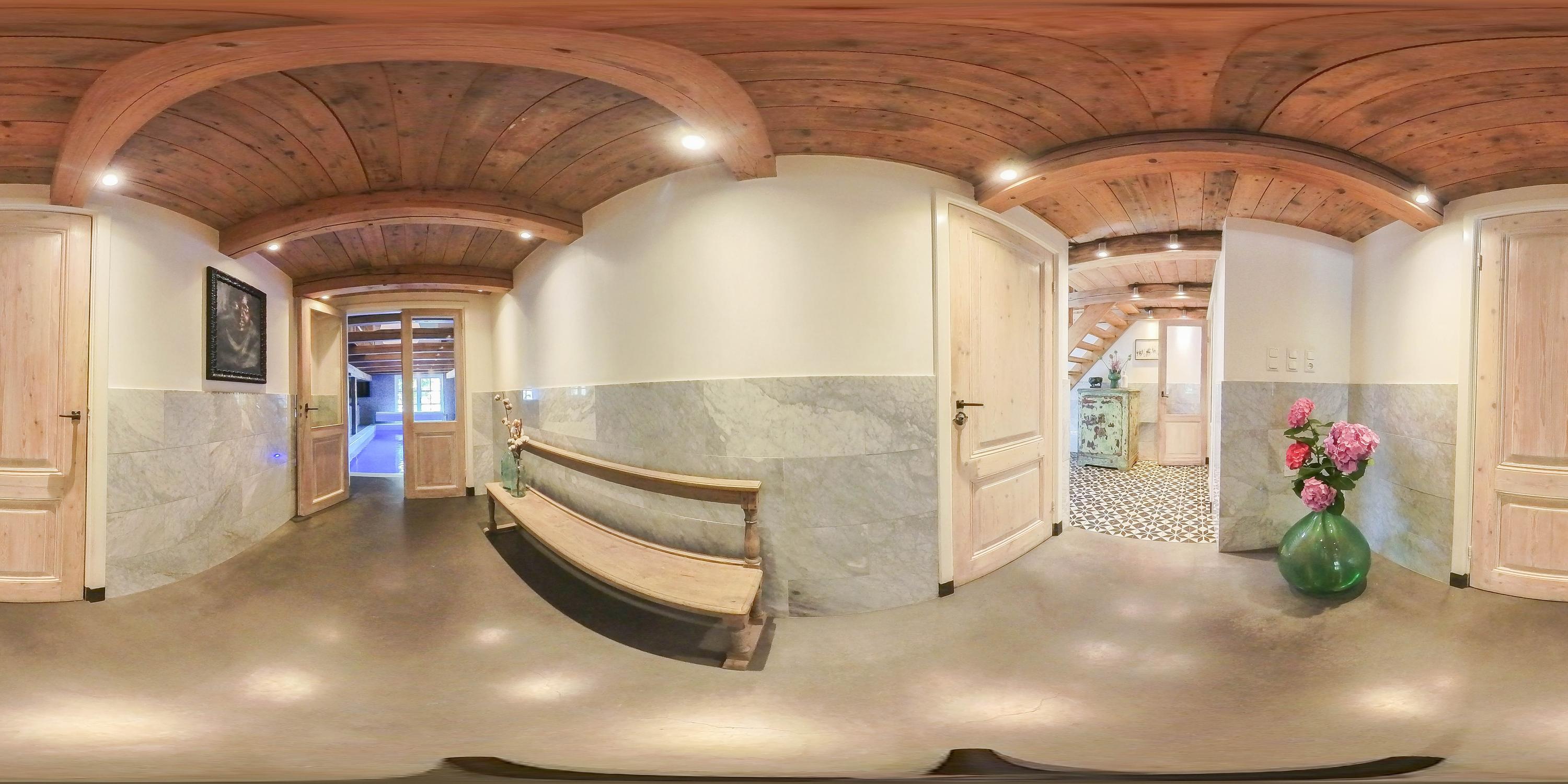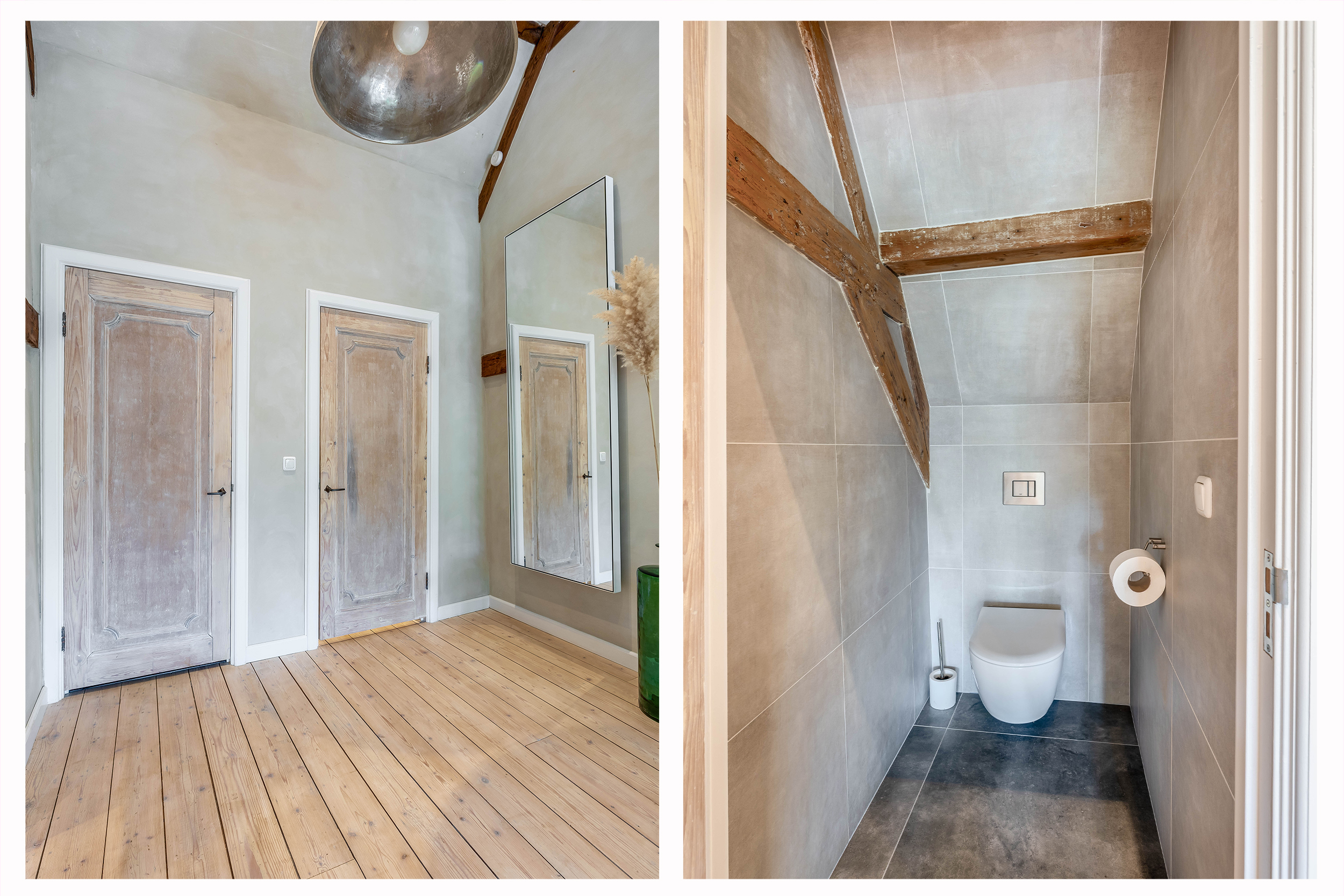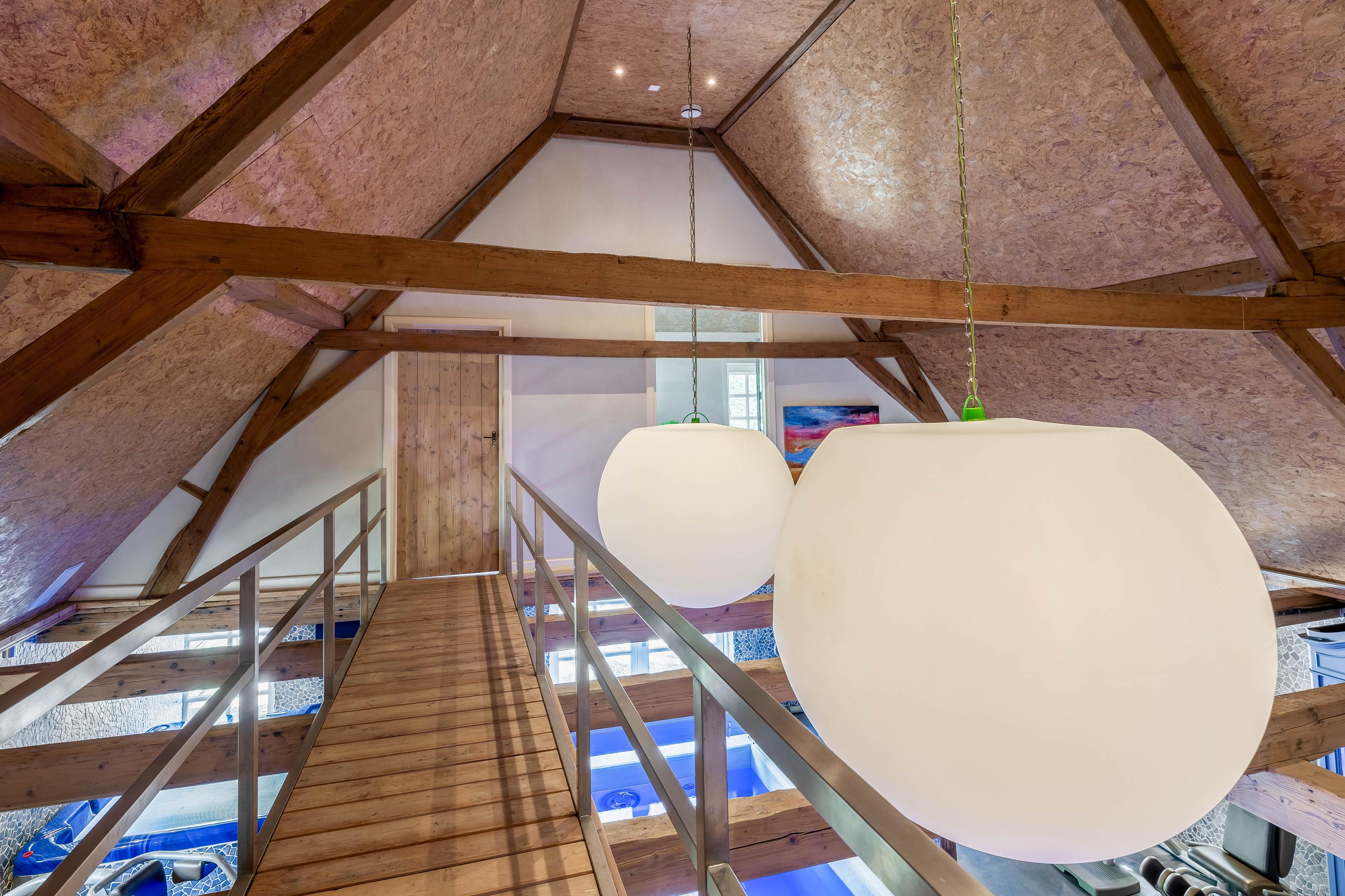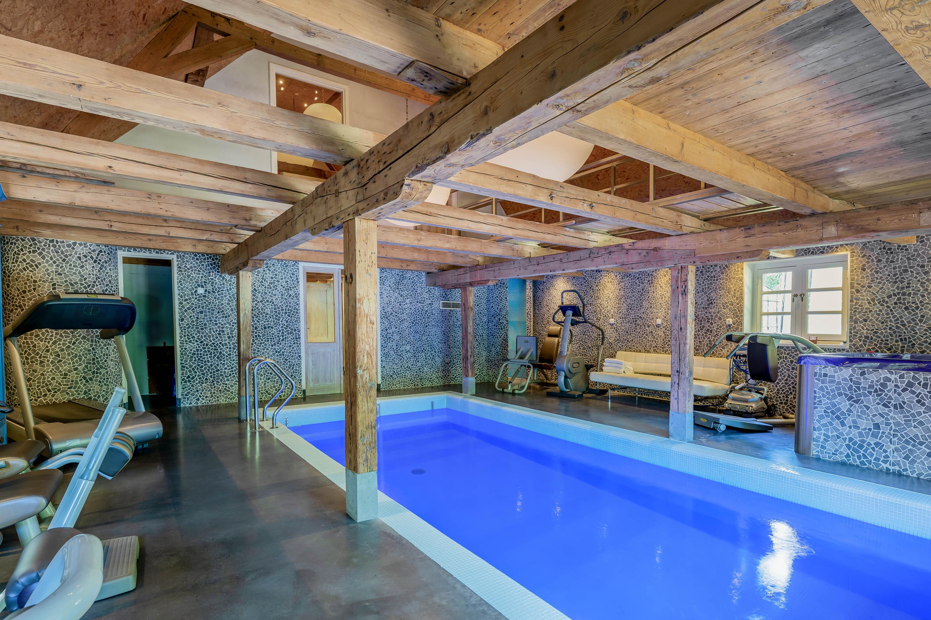 De absolute blikvanger is de wellnessruimte in de voormalige stal. Hier is een luxe binnenzwembad gerealiseerd met automatisch roldek, grote jacuzzi, fitnessruimte en voorbereidingen voor een sauna – alles omgeven door originele stalramen en robuuste houten spanten.