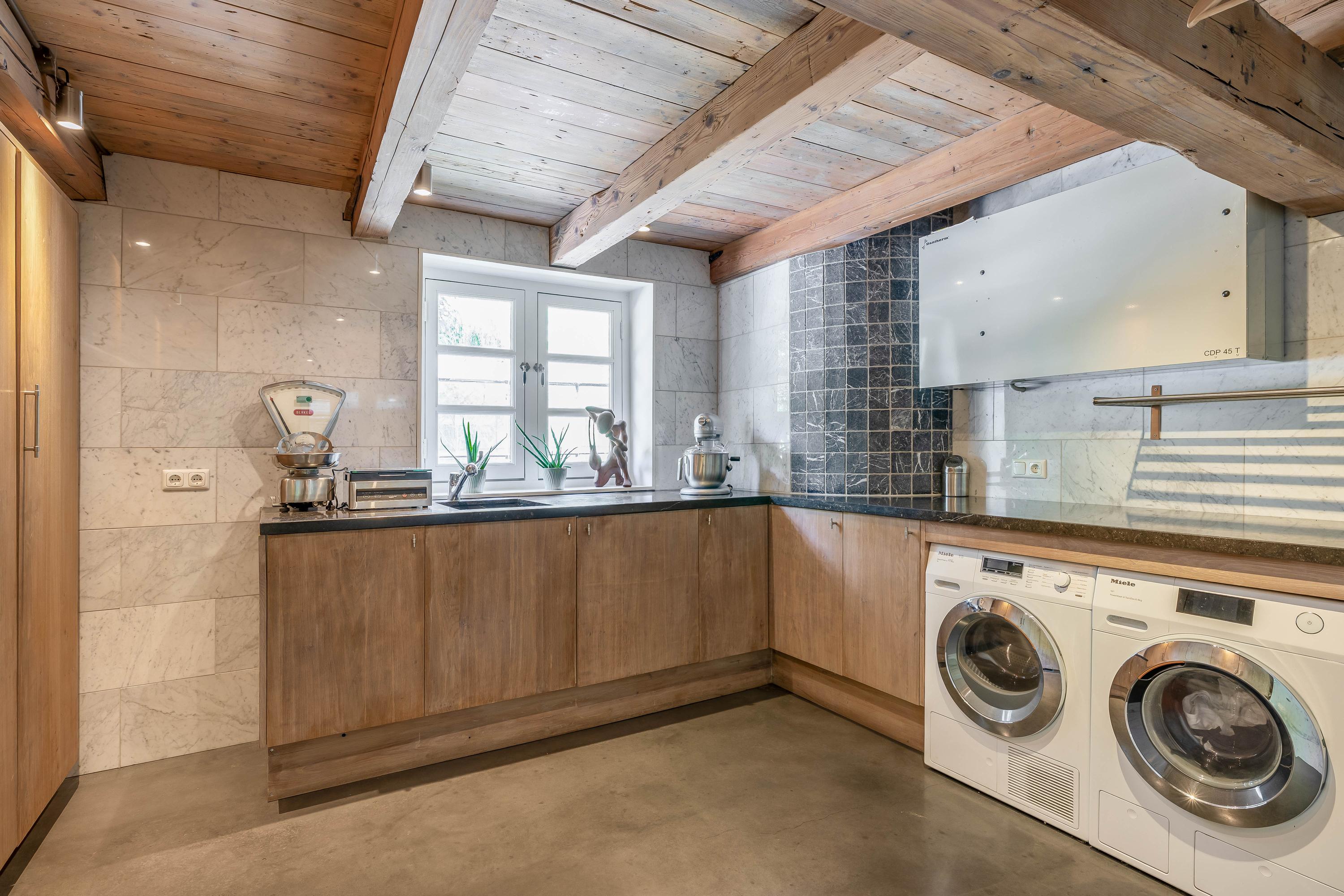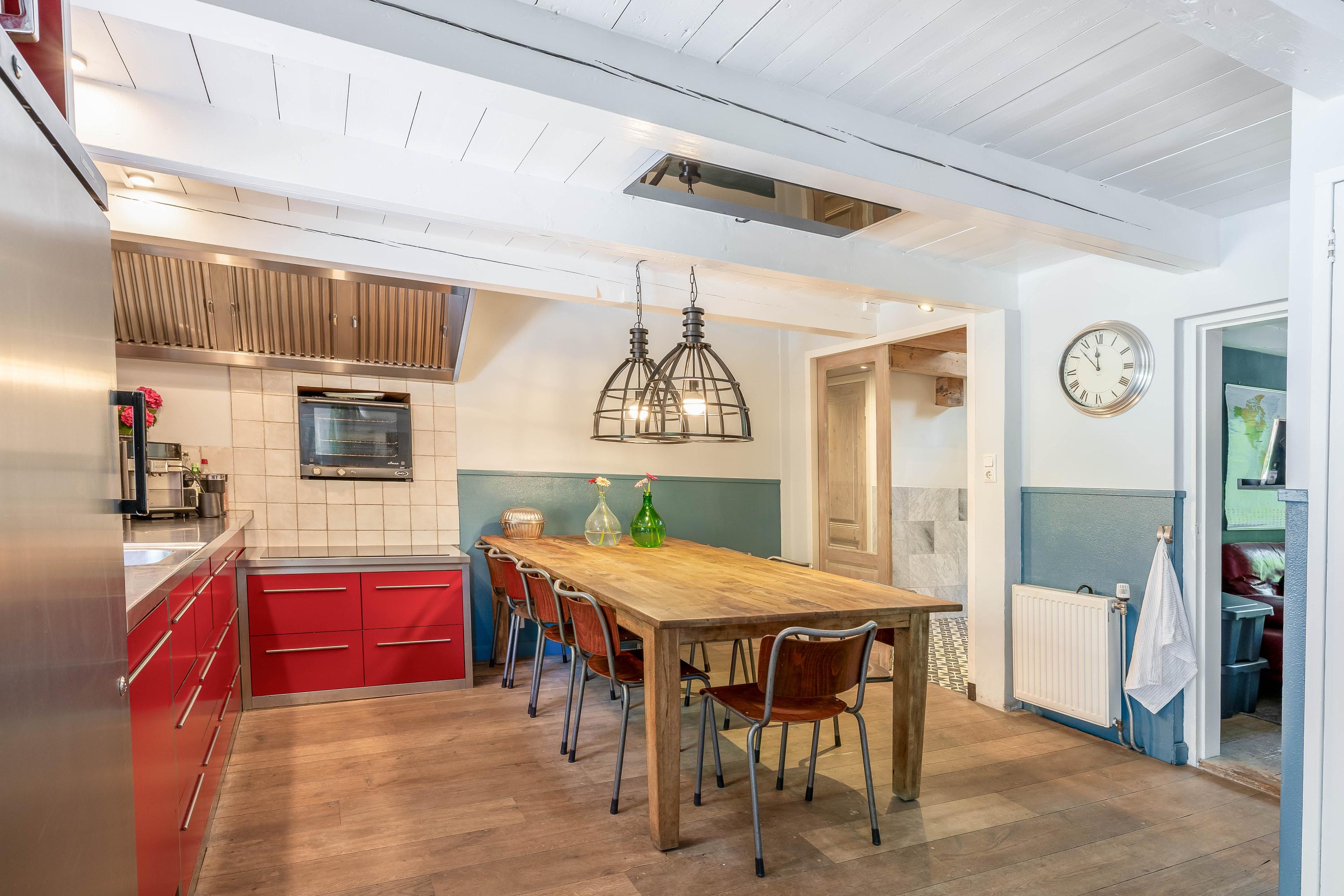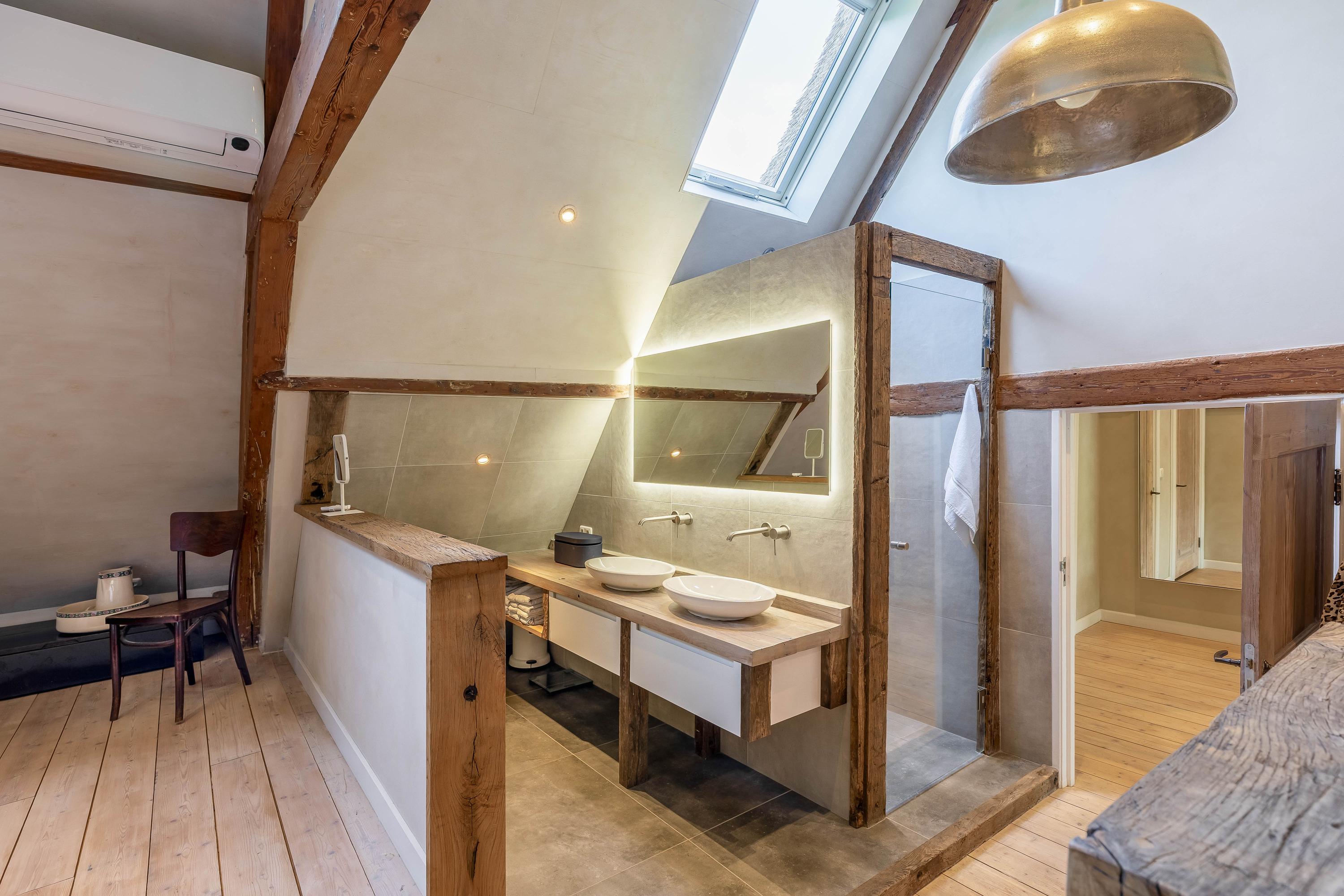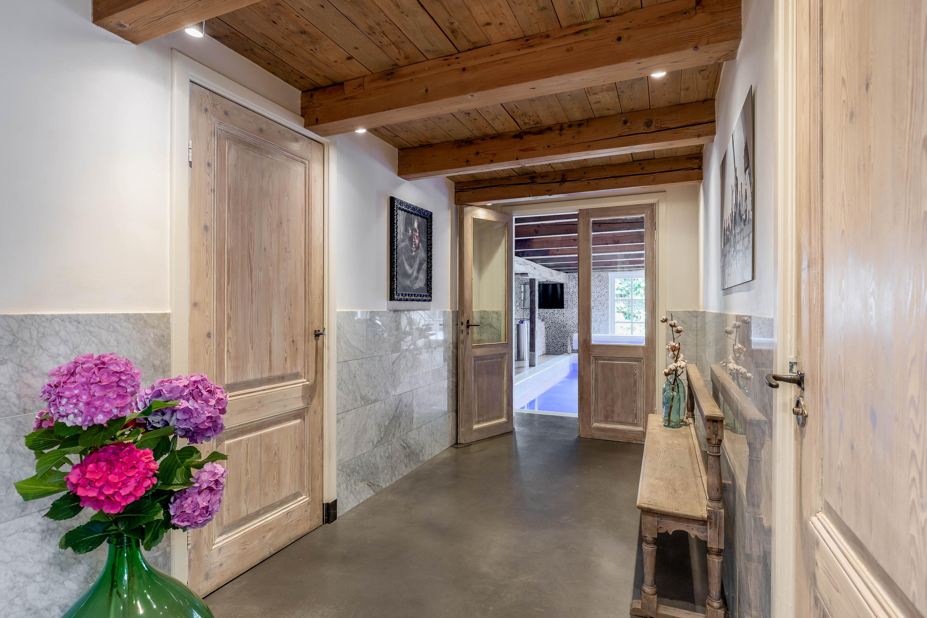 De absolute blikvanger is de wellnessruimte in de voormalige stal. Hier is een luxe binnenzwembad gerealiseerd met automatisch roldek, grote jacuzzi, fitnessruimte en voorbereidingen voor een sauna – alles omgeven door originele stalramen en robuuste houten spanten.