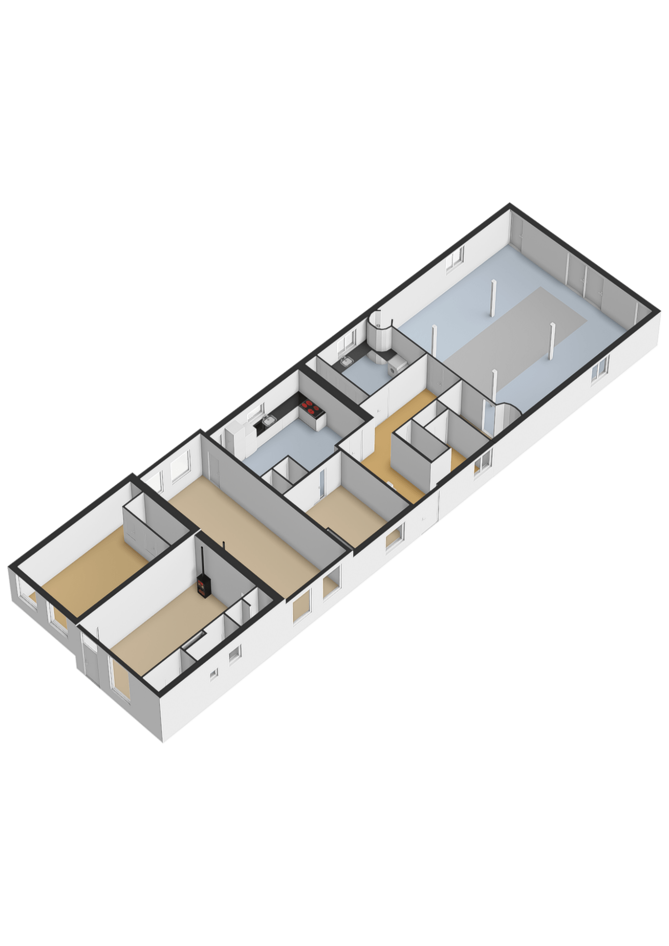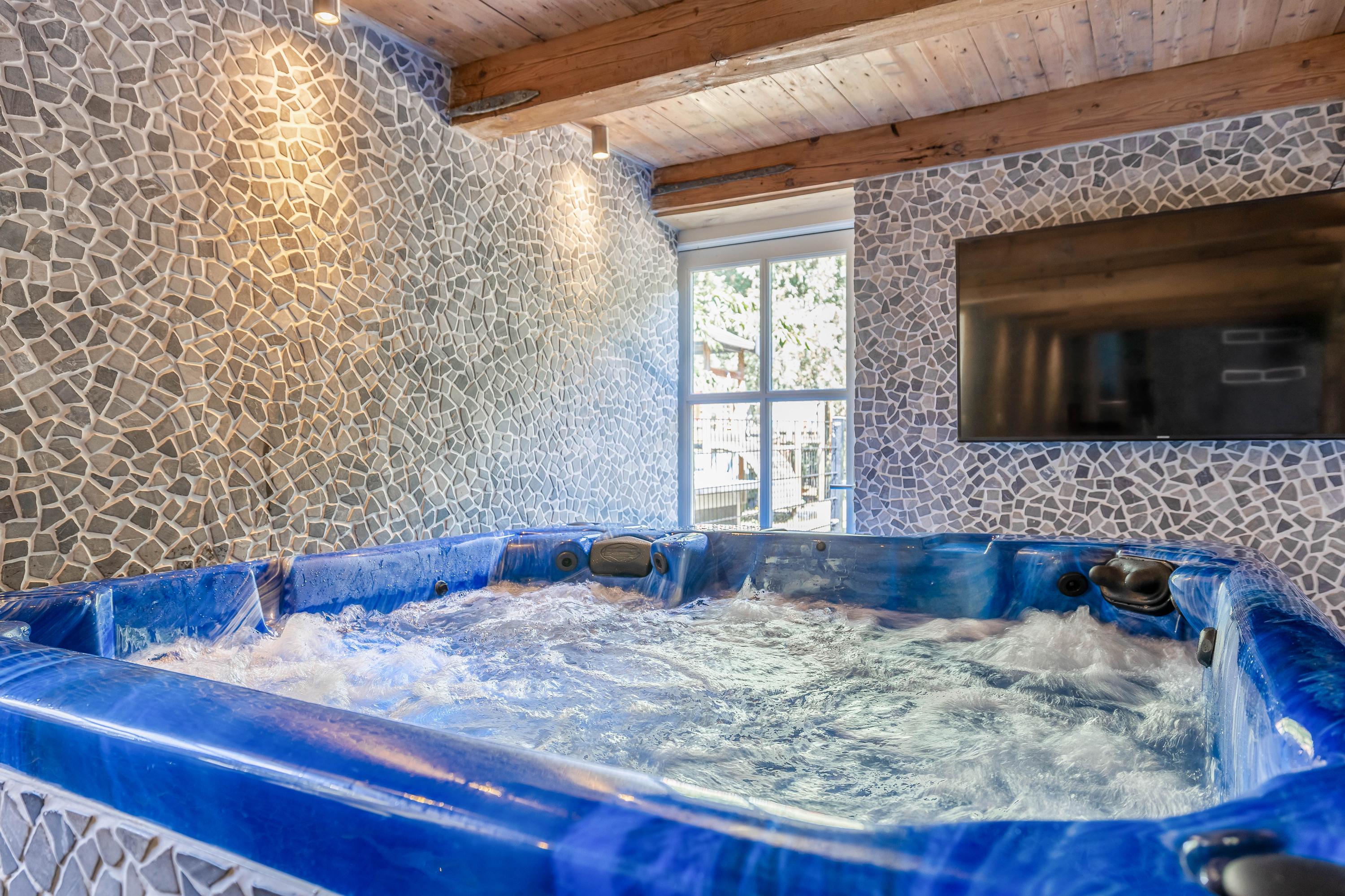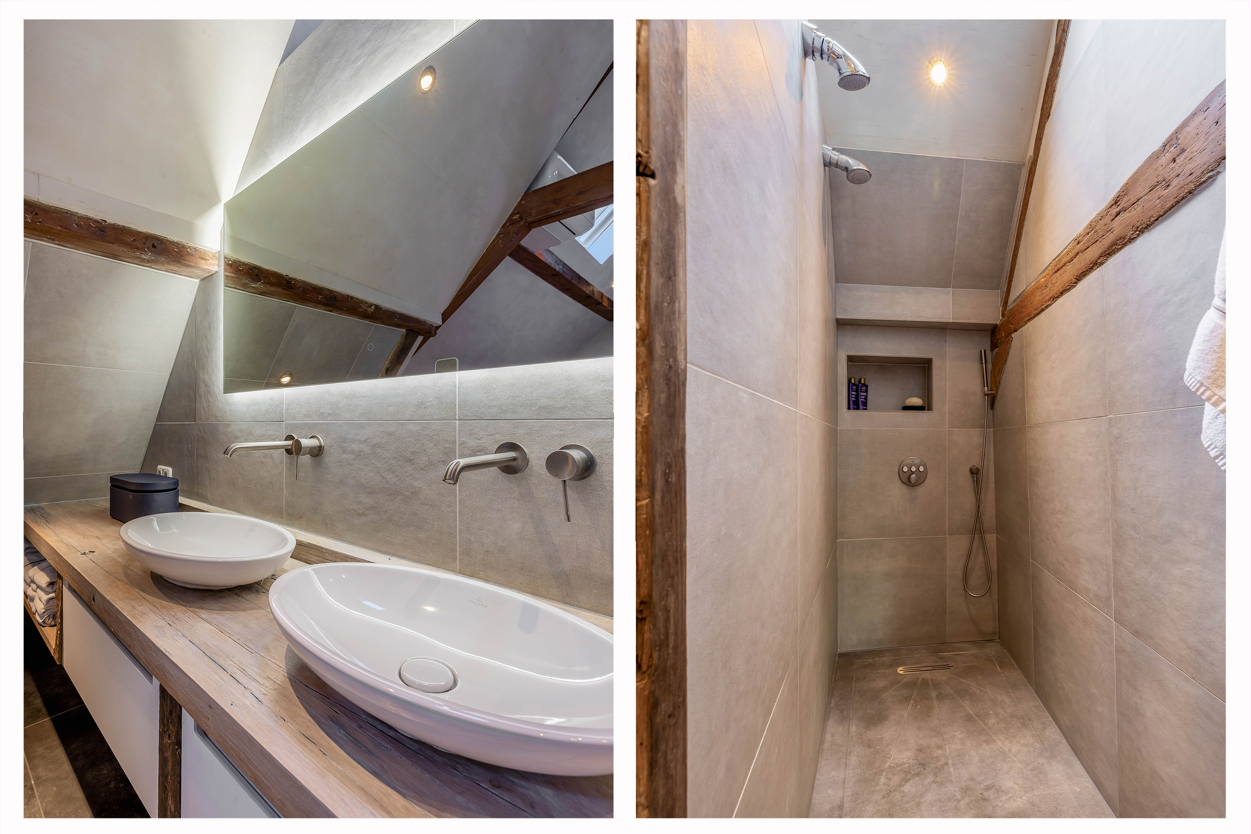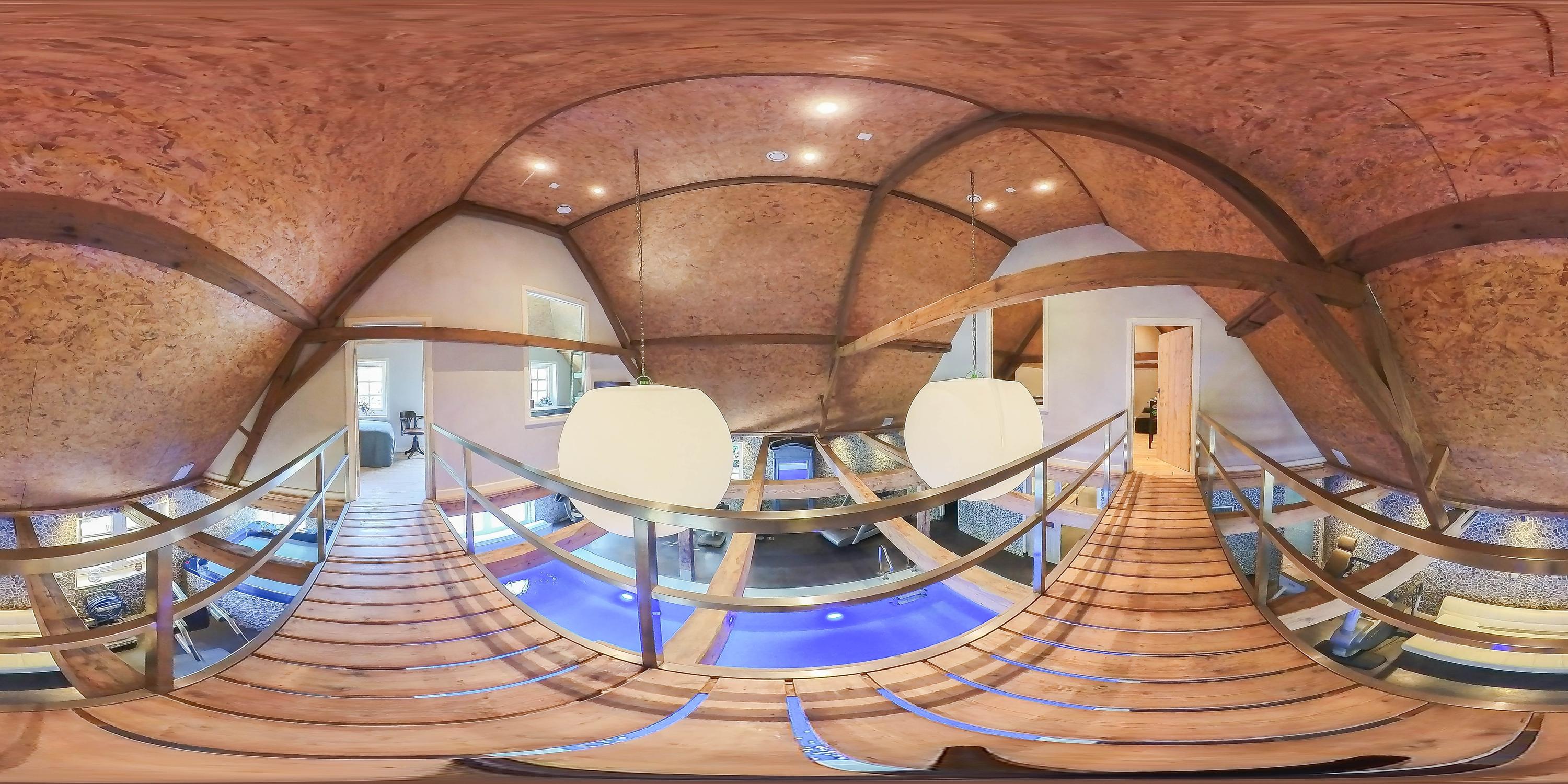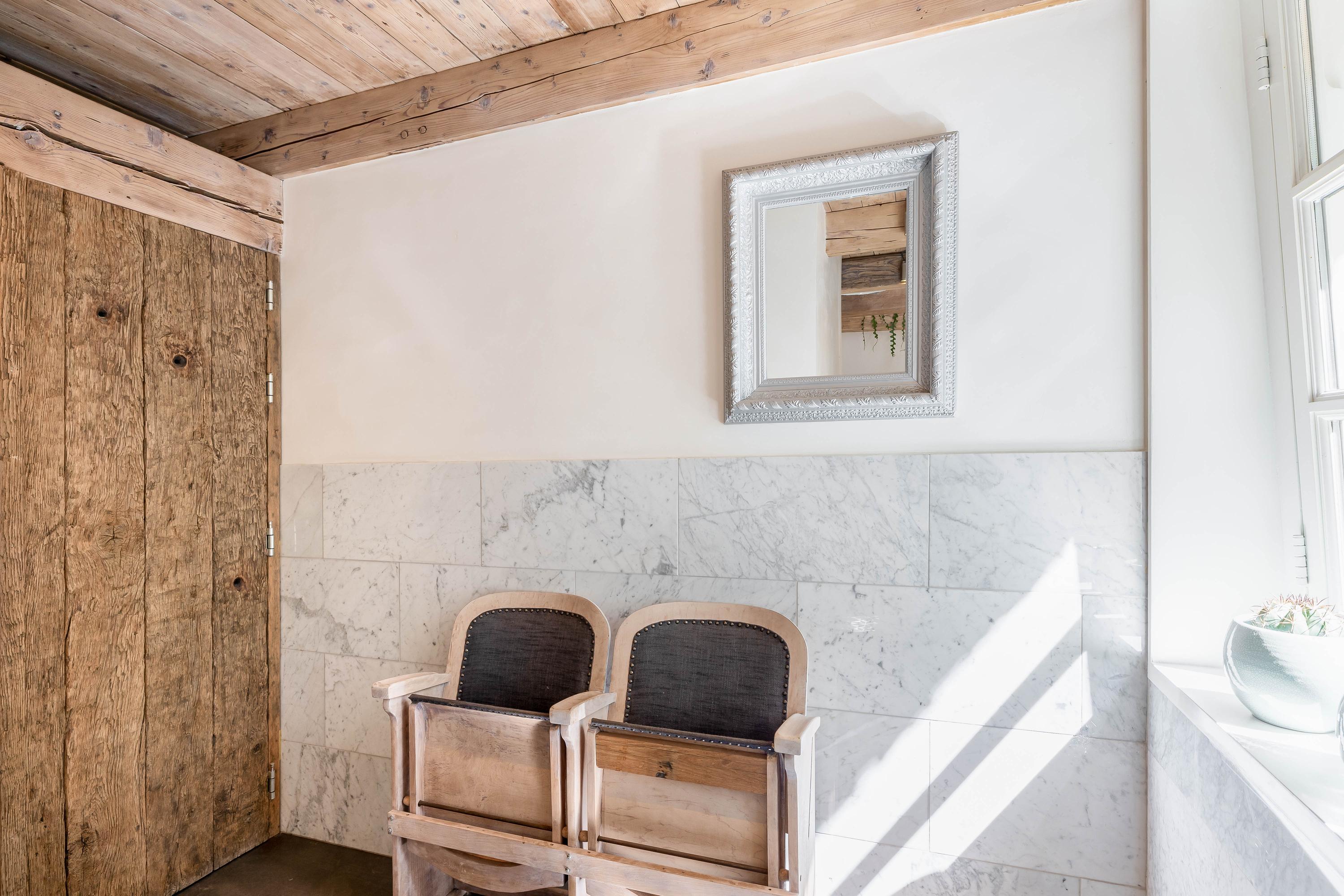De absolute blikvanger is de wellnessruimte in de voormalige stal. Hier is een luxe binnenzwembad gerealiseerd met automatisch roldek, grote jacuzzi, fitnessruimte en voorbereidingen voor een sauna – alles omgeven door originele stalramen en robuuste houten spanten.