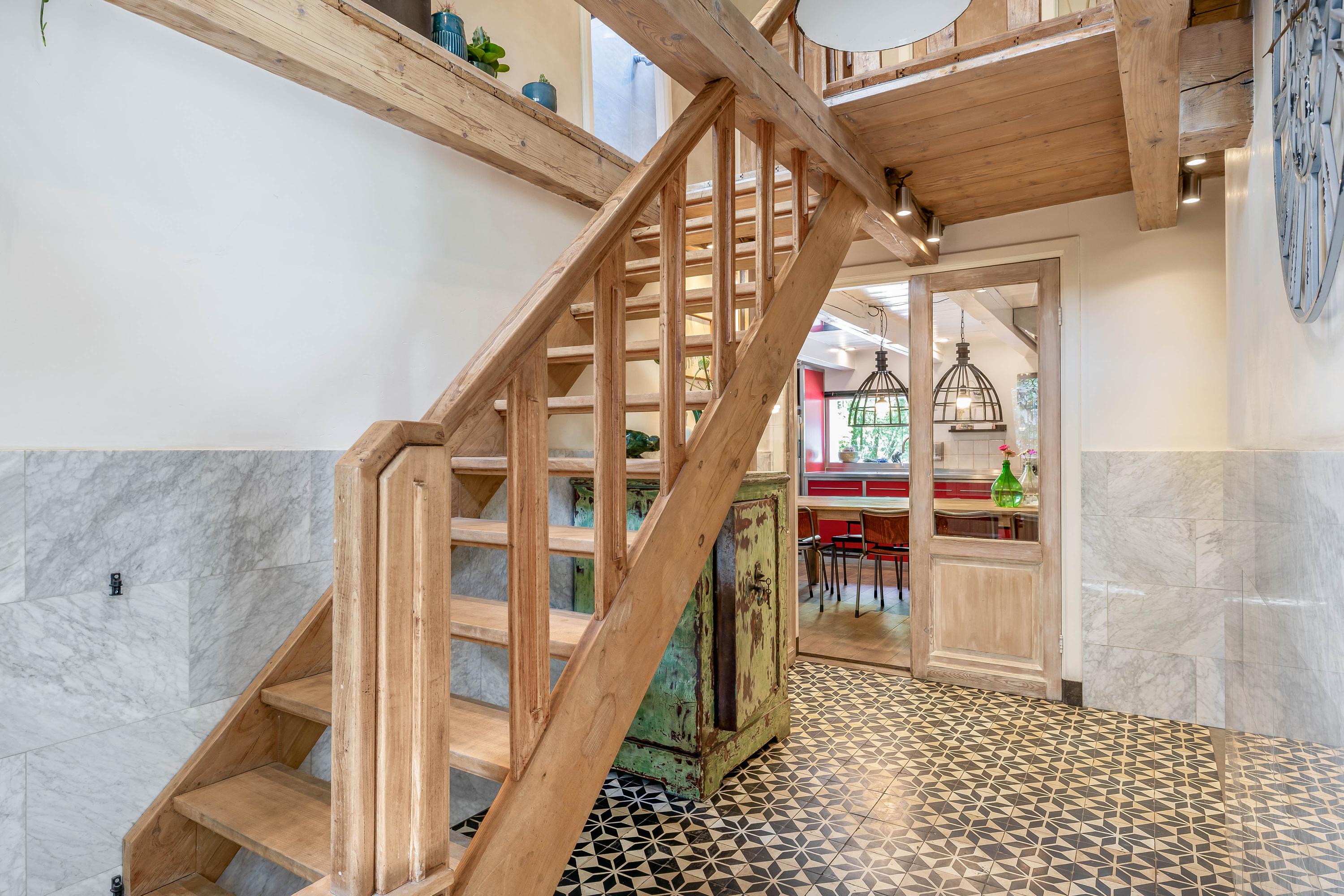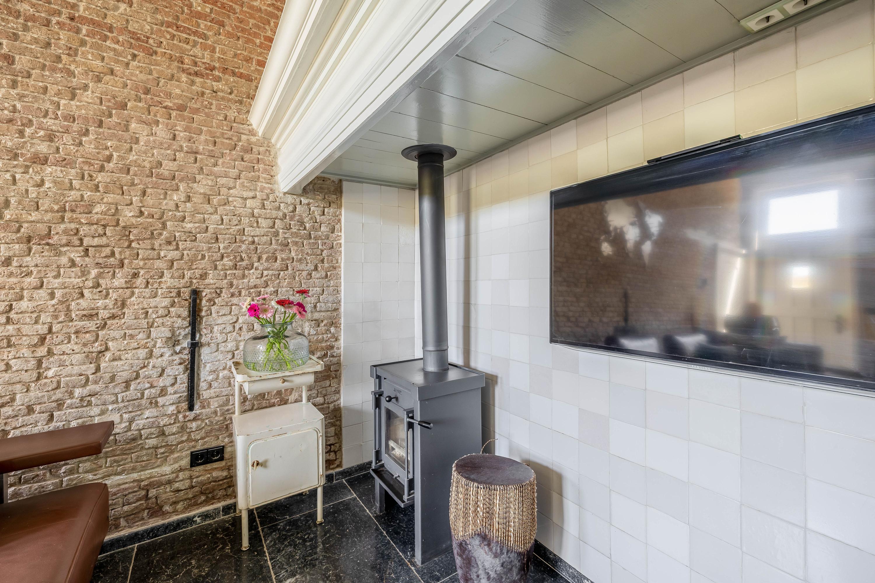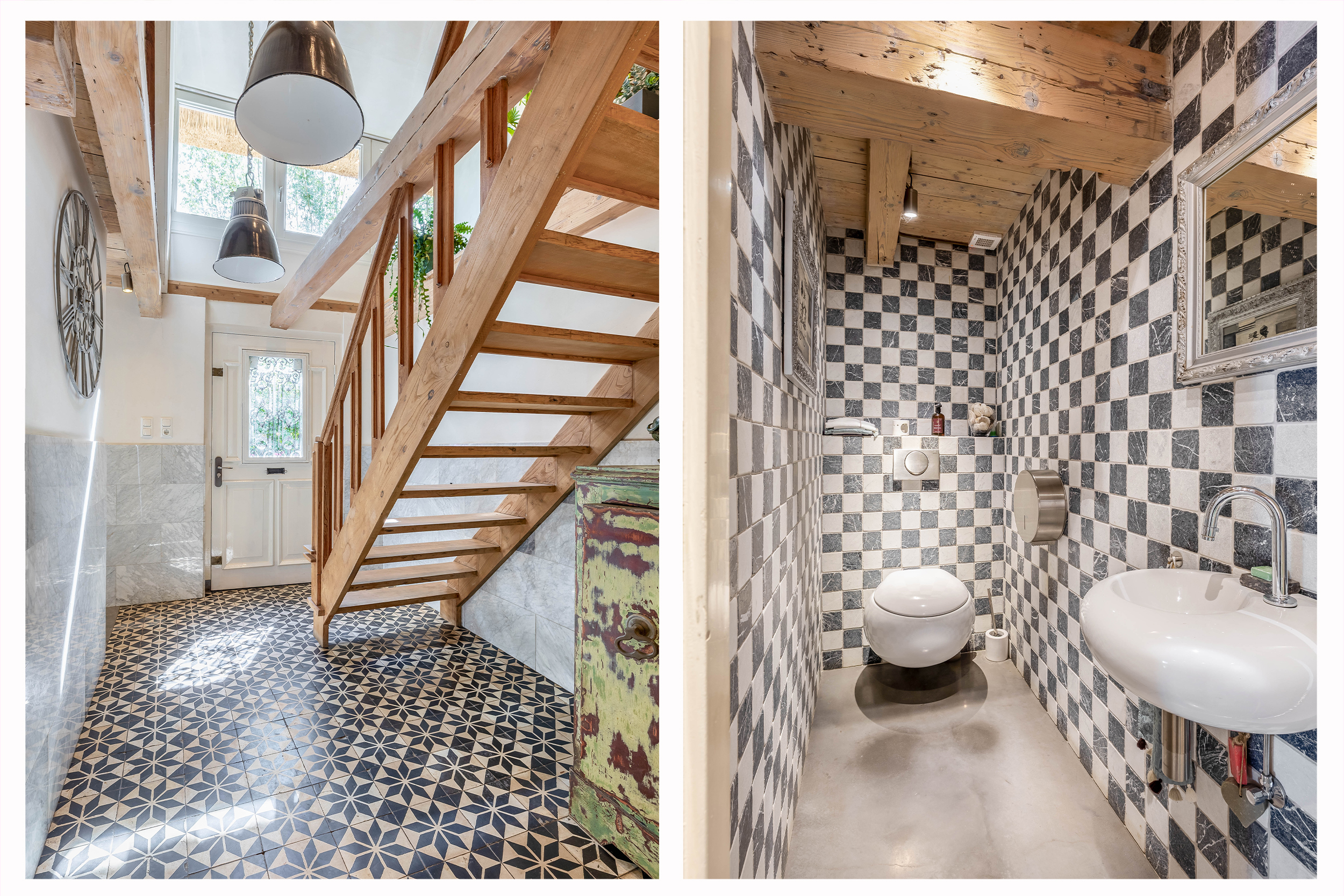 Het hele pand ademt karakter: van de ontvangsthal met antieke schouw, hardstenen vloer en verborgen doorgangen, de sfeervolle woonkamer met authentieke houten vloerdelen en houtkachel, tot en met de opkamer, nu in gebruik als werkkamer en de wijnkelder onder de opkamer.