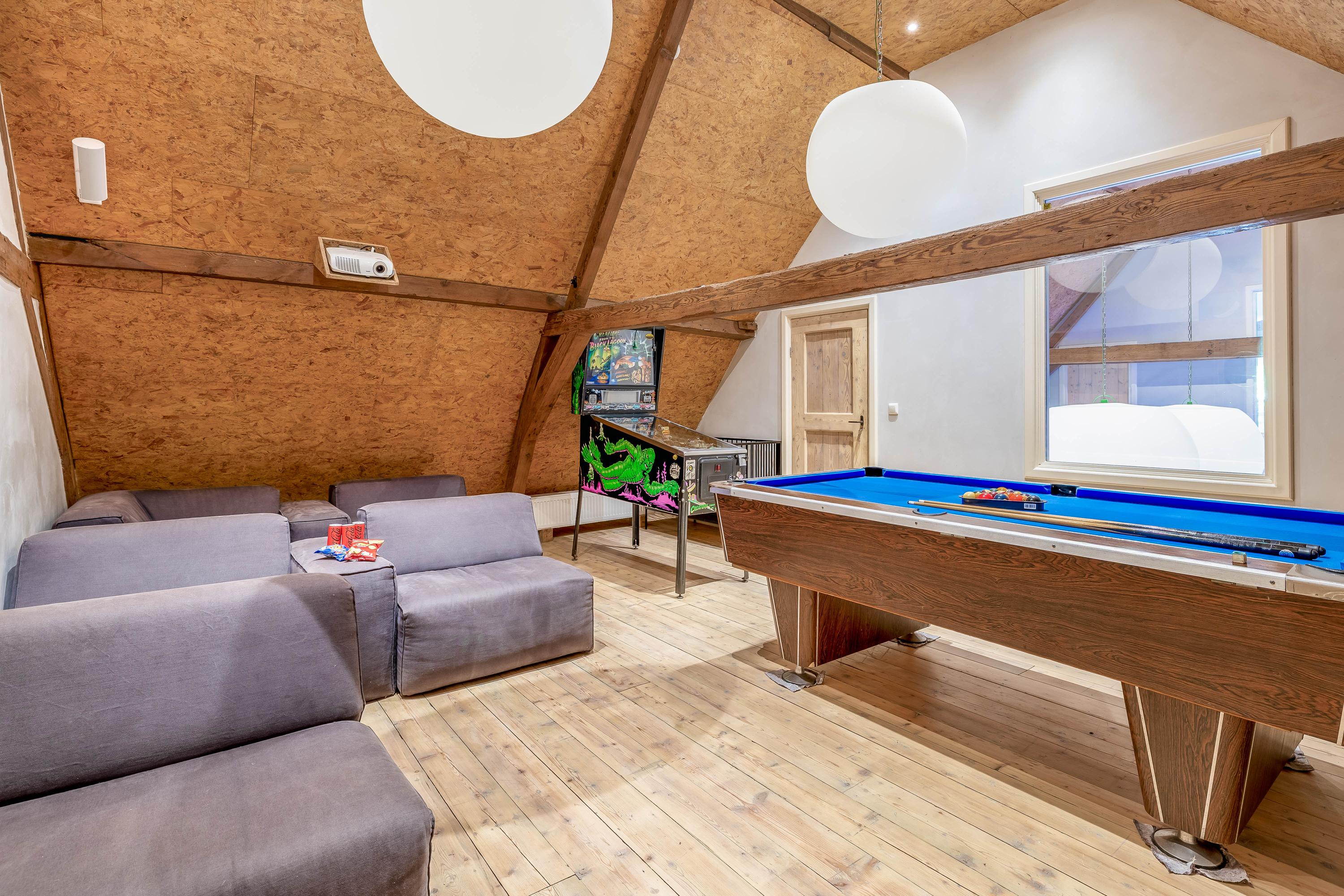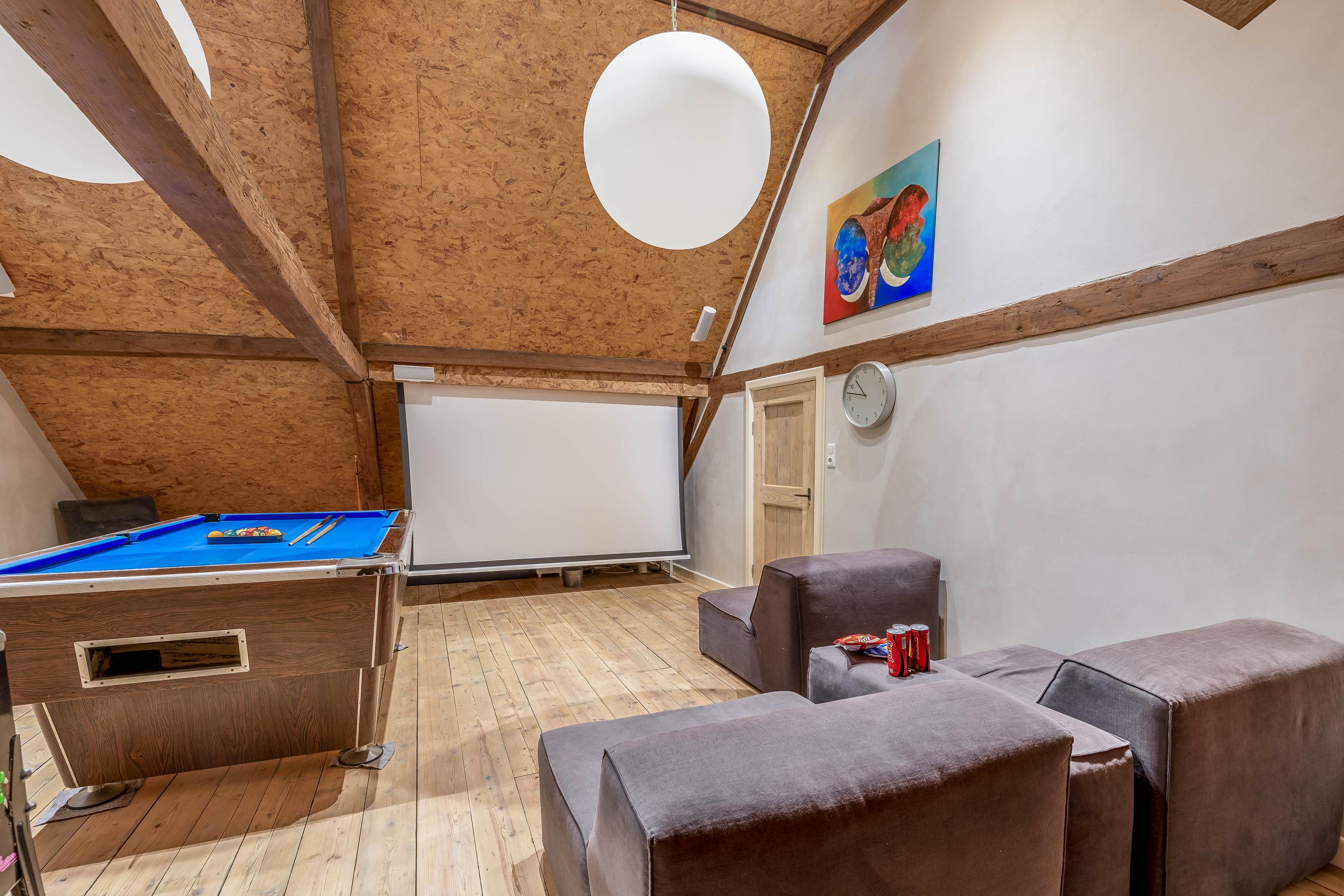 Een bijzondere toevoeging is de amusementsruimte op de verdieping met biljart en bioscoopopstelling, die ook eenvoudig kan worden ingezet als extra slaapkamer of gastenverblijf.