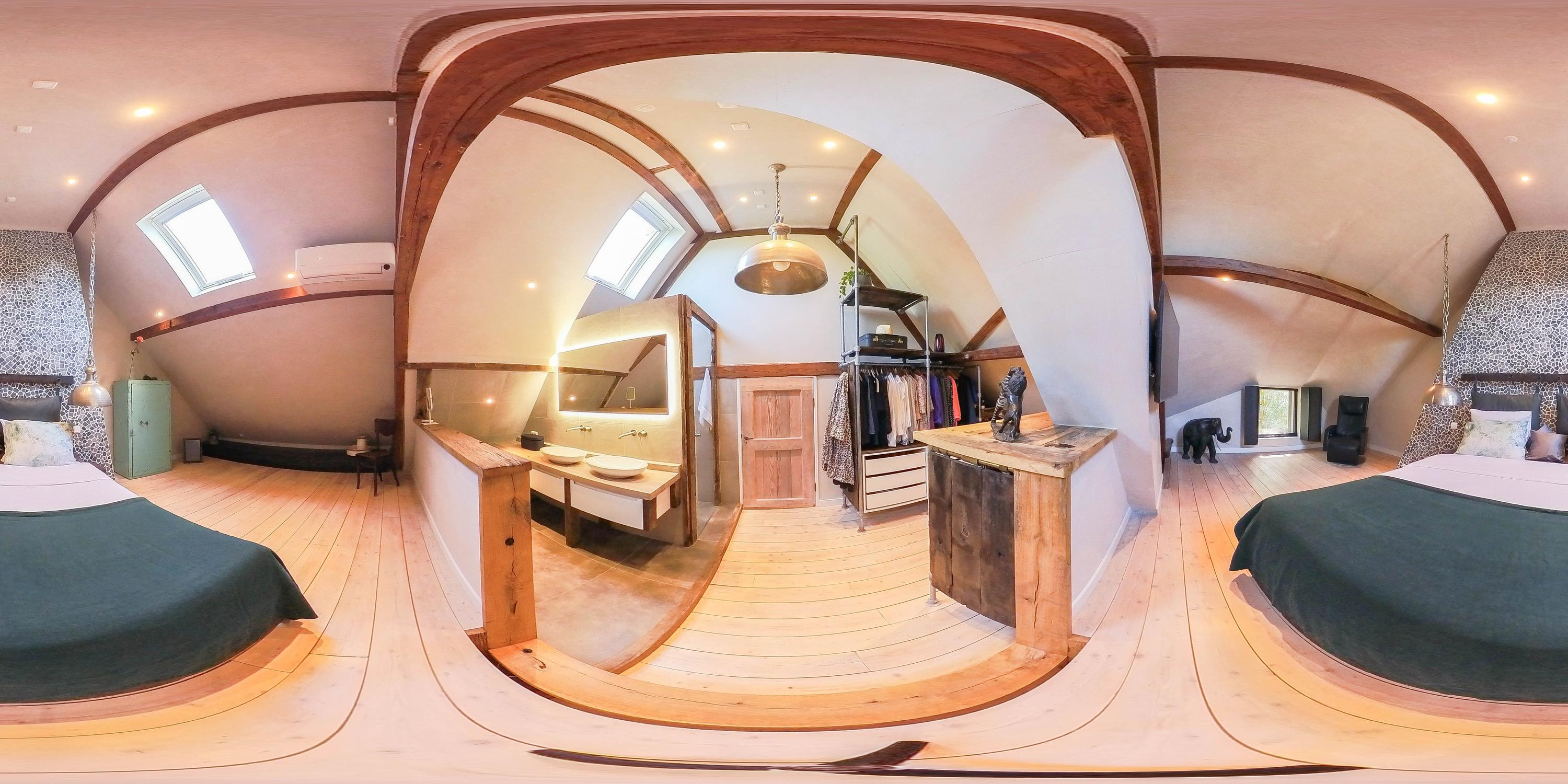 Fraaie trappartij, ruime overloop met dakkapel, apart toilet en inloopkast, riante slaapkamer met 2 nieuwe dakramen badkamer en suite uit 2020 met inloopdouche, 2 wastafels en vloerverwarming, amusementsruimte met biljart en bioscoop, die eventueel ook prima te gebruiken is als slaapkamer en doorgang met loopbrug over het zwembad naar de achterste slaapkamer met houten vloerdelen.