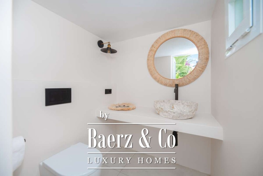 De omgevingGelegen in het populaire Sa Carroca, biedt deze property een unieke combinatie van rust en nabijheid tot het bruisende hart van Ibiza. De locatie is ideaal: op slechts 10 minuten rijden vindt u de schitterende stranden van Cala Olivera en Es Cavallet, terwijl Ibiza-stad met haar iconische Dalt Vila binnen 12 minuten te bereiken is. Hier geniet u van een breed scala aan restaurants, bars en winkels. De internationale luchthaven van Ibiza ligt tevens op slechts 10 minuten afstand, waardoor de woning ook uitstekend bereikbaar is. In de directe omgeving vindt u lokale eetgelegenheden, een ambachtelijke bakkerij en diverse boetieks. Sa Carroca staat bekend om de aangename woonomgeving en biedt daarnaast ook een prachtig groen decor dankzij de omliggende heuvels.De villaDe villa is een strakke moderne woning met een woonoppervlakte van maar liefst 318m2 en is volledig gerenoveerd naar de hoogste standaarden. Bij binnenkomst wordt u verwelkomd in een royale hal die toegang biedt tot een sfeervolle woonkamer met een modieuze sofa en een stijlvolle open haard. Grote ramen en schuifpuien laten een overvloed aan natuurlijk licht binnen en bieden een spectaculair uitzicht op de historische Dalt Vila. De open keuken is een lust voor het oog, met een centraal kookeiland en verfijnde houten accenten. De serene kleuren van wit, licht beige, hout en steen creëren een harmonieuze ambiance door de gehele woning. De villa beschikt over 4 ruime slaapkamers, waarvan drie op de bovenverdieping en één op de begane grond. Elke ruimte is smaakvol ingericht en voorzien van praktische inbouwkasten. De 3 luxe badkamers zijn uitgerust met hoogwaardige afwerkingen, waaronder een vrijstaand bad dat via een schuifpui direct toegang biedt tot het privé buitenterras met het comfortabele ligbad. De residentie is volledig instapklaar, maar biedt ook flexibiliteit en creativiteit dankzij de garage van 80m2, welke klaar is om naar wens van de koper te worden gerenoveerd.De buitenruimtesDe buitenruimtes van de woning zijn een oase van rust en luxe. Het ruime privé terras en het omliggende groen creëren een idyllische setting om optimaal van het buitenleven te genieten. Een stijlvolle loungeset en een eettafel nodigen uit tot ontspanning of gezellige diners. De overkapping biedt aangename schaduw tijdens de zonnige uren. De villa beschikt bovendien over een royaal dakterras met panoramisch uitzicht op Dalt Vila en de groene omgeving. Het aantrekkelijke zwembad met luxe loungebedden vormt een perfecte plek om te genieten van de zonnige, Spaanse dagen. Deze buitenruimte wordt omlijst door zorgvuldig aangelegde tuinen met een variëteit aan bomen en planten, wat bijdraagt aan de ontspannen sfeer van de woning. Deze property combineert moderne elegantie met tijdloze charme. Een werkelijk unieke kans om te wonen in een rustige, groene omgeving met alle luxe van Ibiza binnen handbereik.