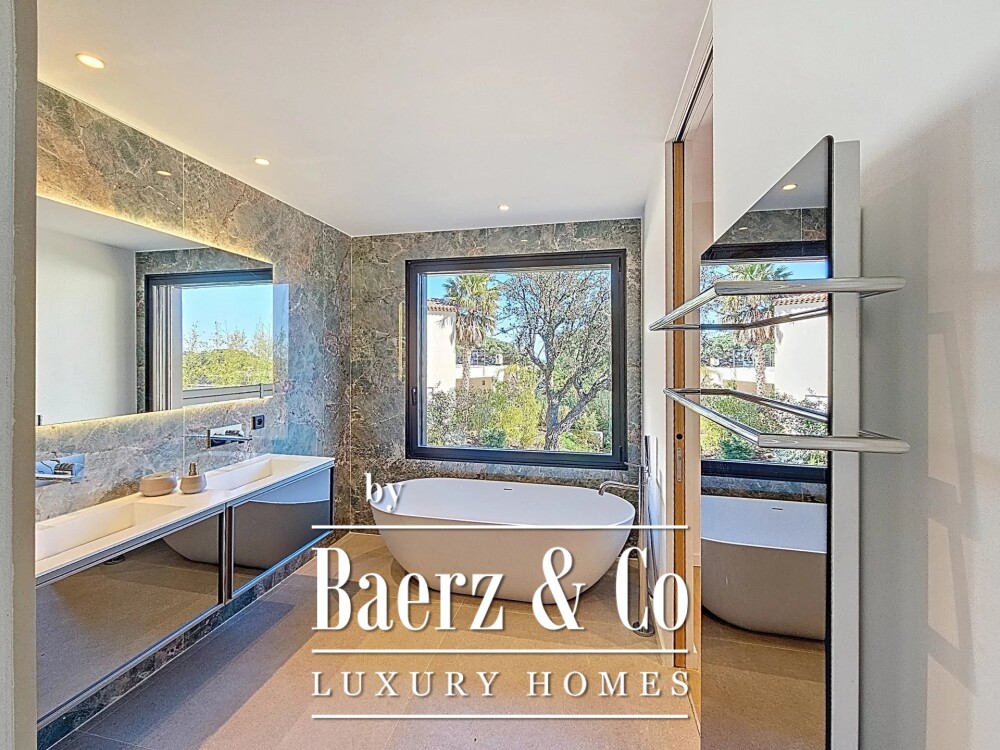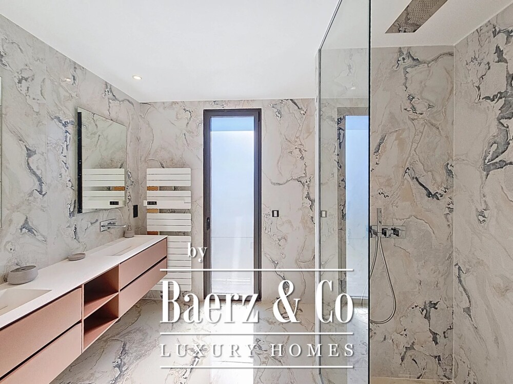 Drie slaapkamers met eigen badkamer op tuinniveau openen direct naar het spiegelzwembad en creëren een vloeiend samenspel tussen privévertrekken en zorgvuldig ontworpen tuinen. De bovenverdieping wordt gesierd door een mastersuite van 41 m² met eigen terras, jacuzzi en gedeeltelijk zeezicht, waardoor het gevoel van licht en geborgenheid verder wordt versterkt.