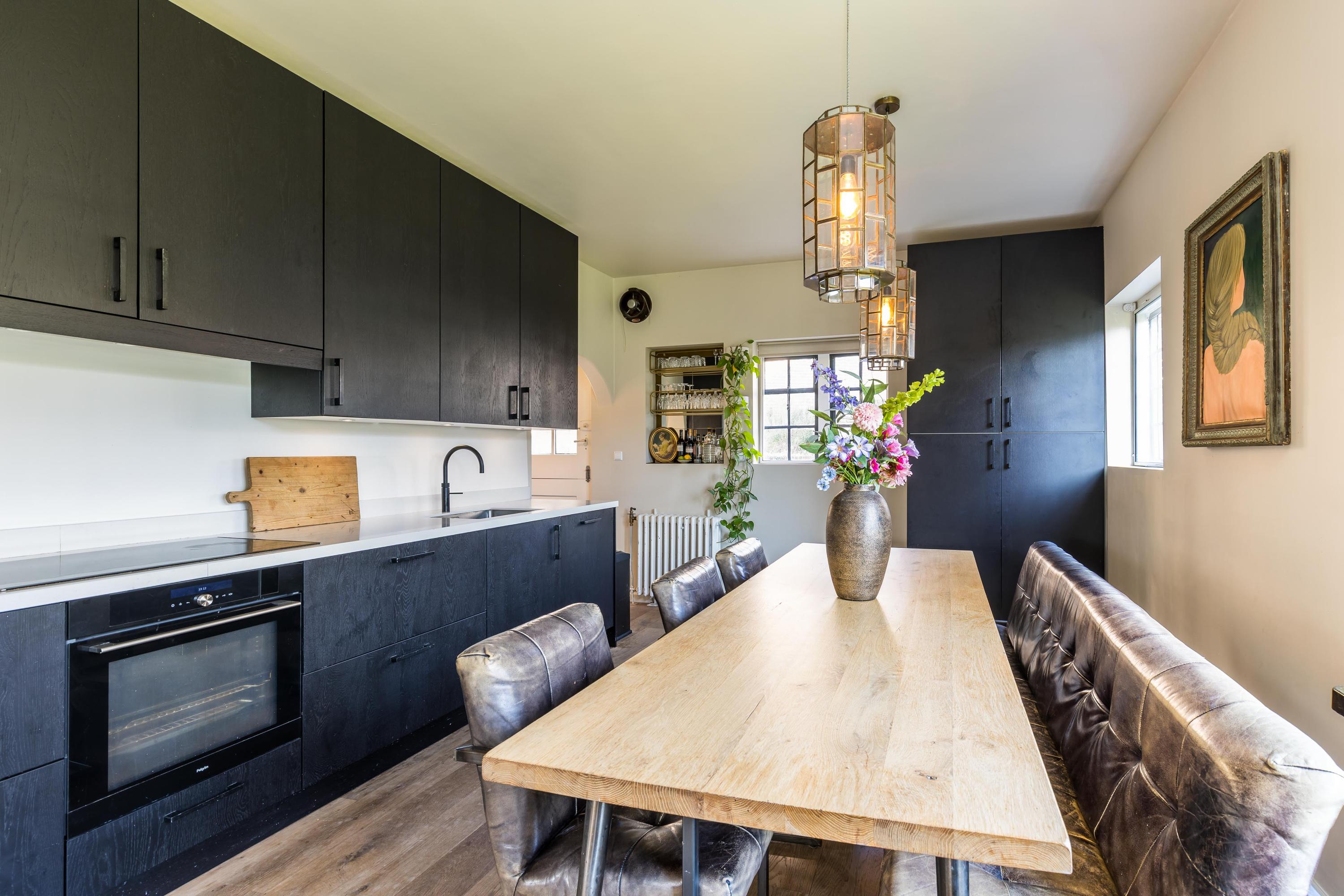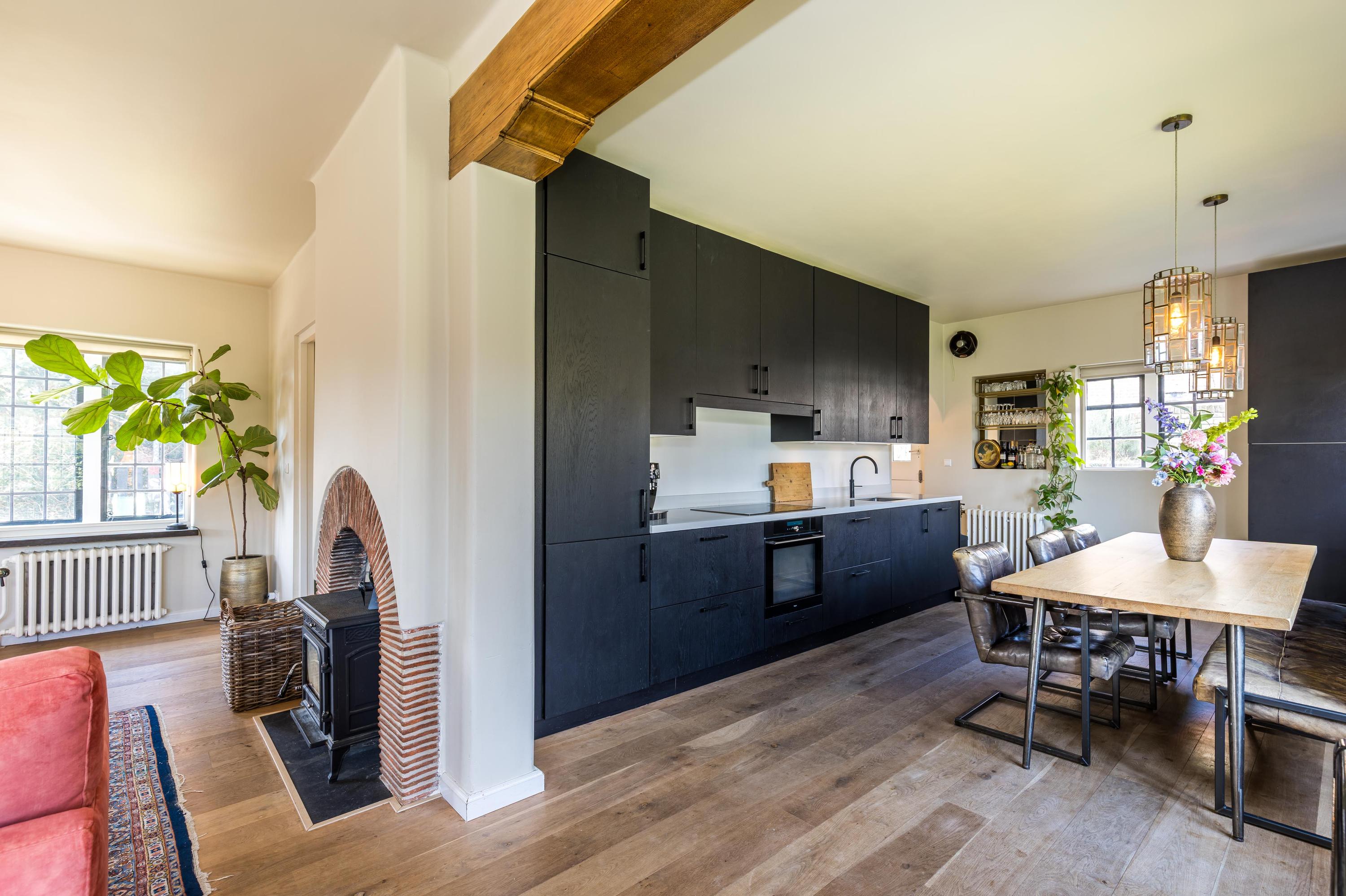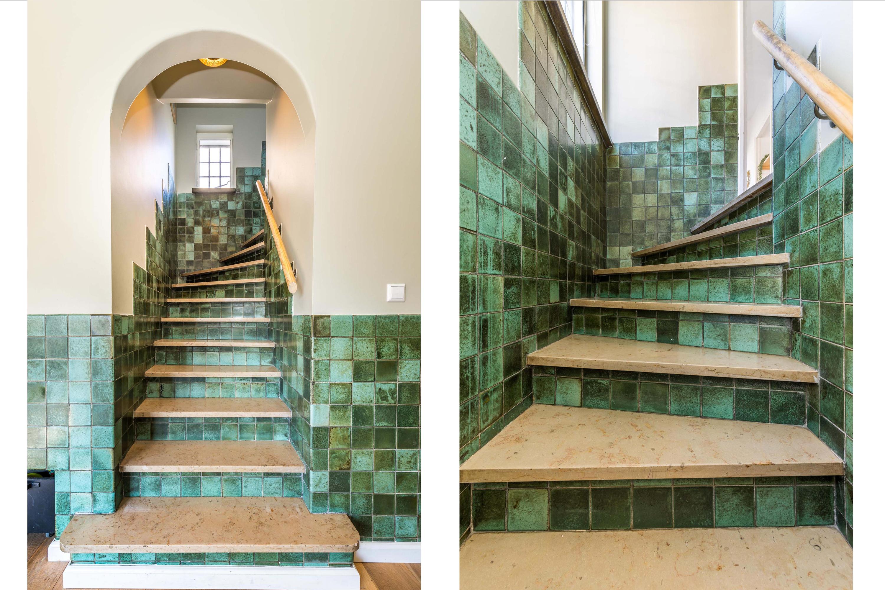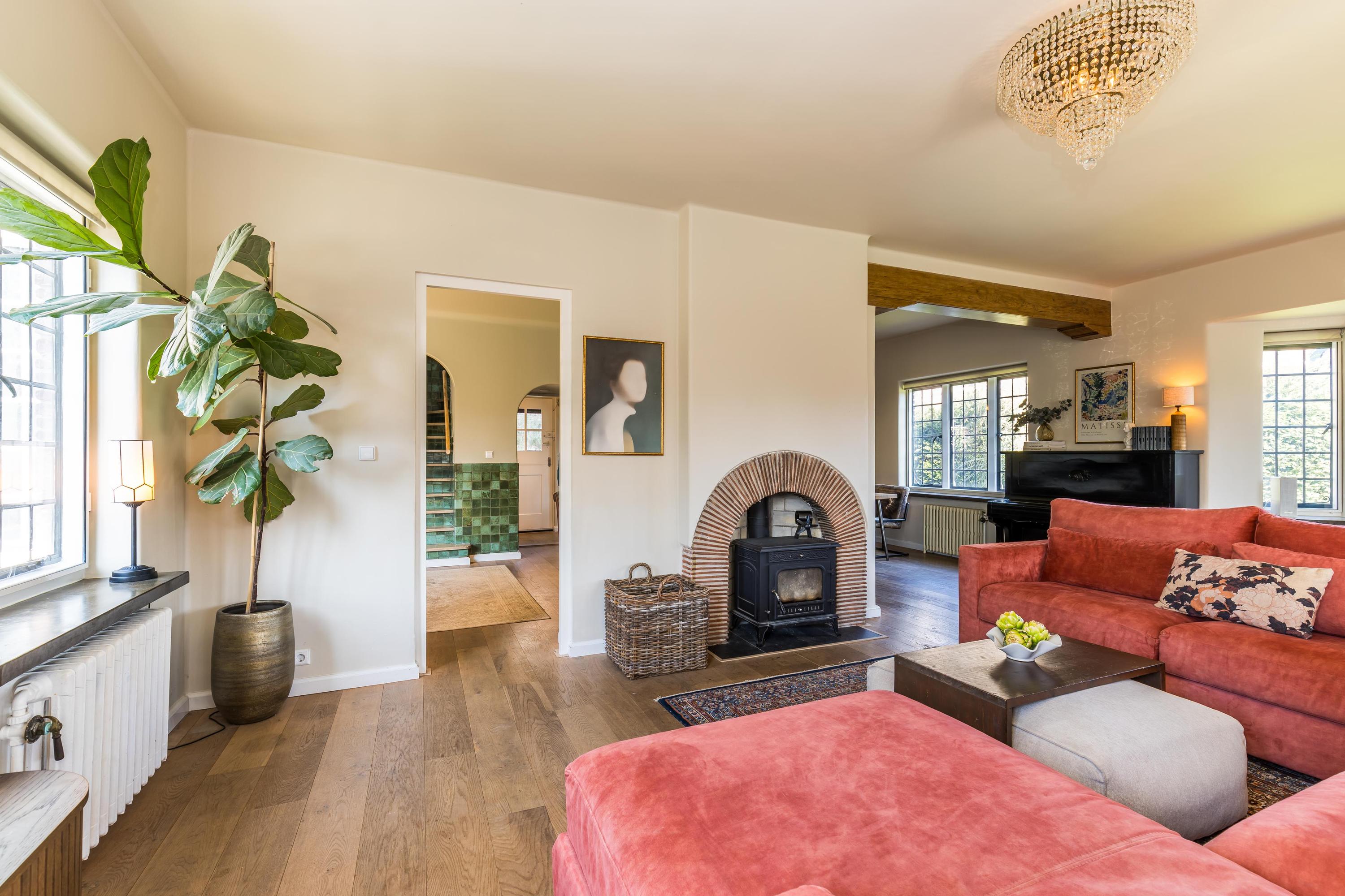 Begane grond: Entree middels een halfronde voordeur, bijzonder ruime hal waar je bij wijze van spreken zou kunnen rolschaatsen, maar van geluk zeker eens een dansje zal doen. De charmante woonkamer met houtkachel, karakteristieke erker en daglicht van 3 zijden met prachtige glas-in-lood-raampartijen, de open woonkeuken geeft een moderne twist. Het leuke aan de plattegrond op de begane grond is dat je een rondje kan lopen, via een deur in de keuken kom je via een kleine gang weer in de balzaal van een hal. Aan de hal grenst ook de toiletruimte en een vaste kast. De hal en trapopgang zijn voorzien van authentieke wandtegeltjes in verbluffend goede staat.