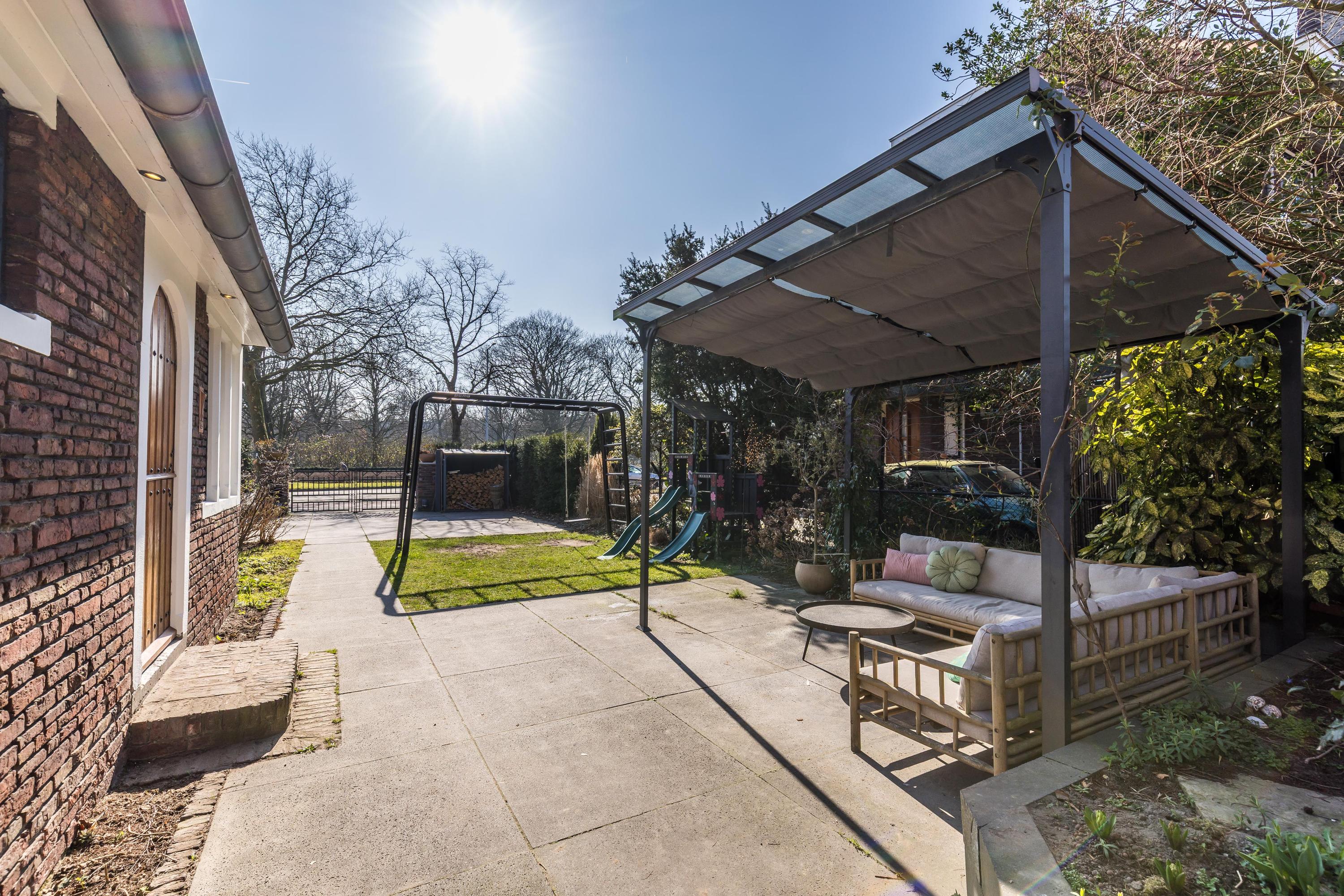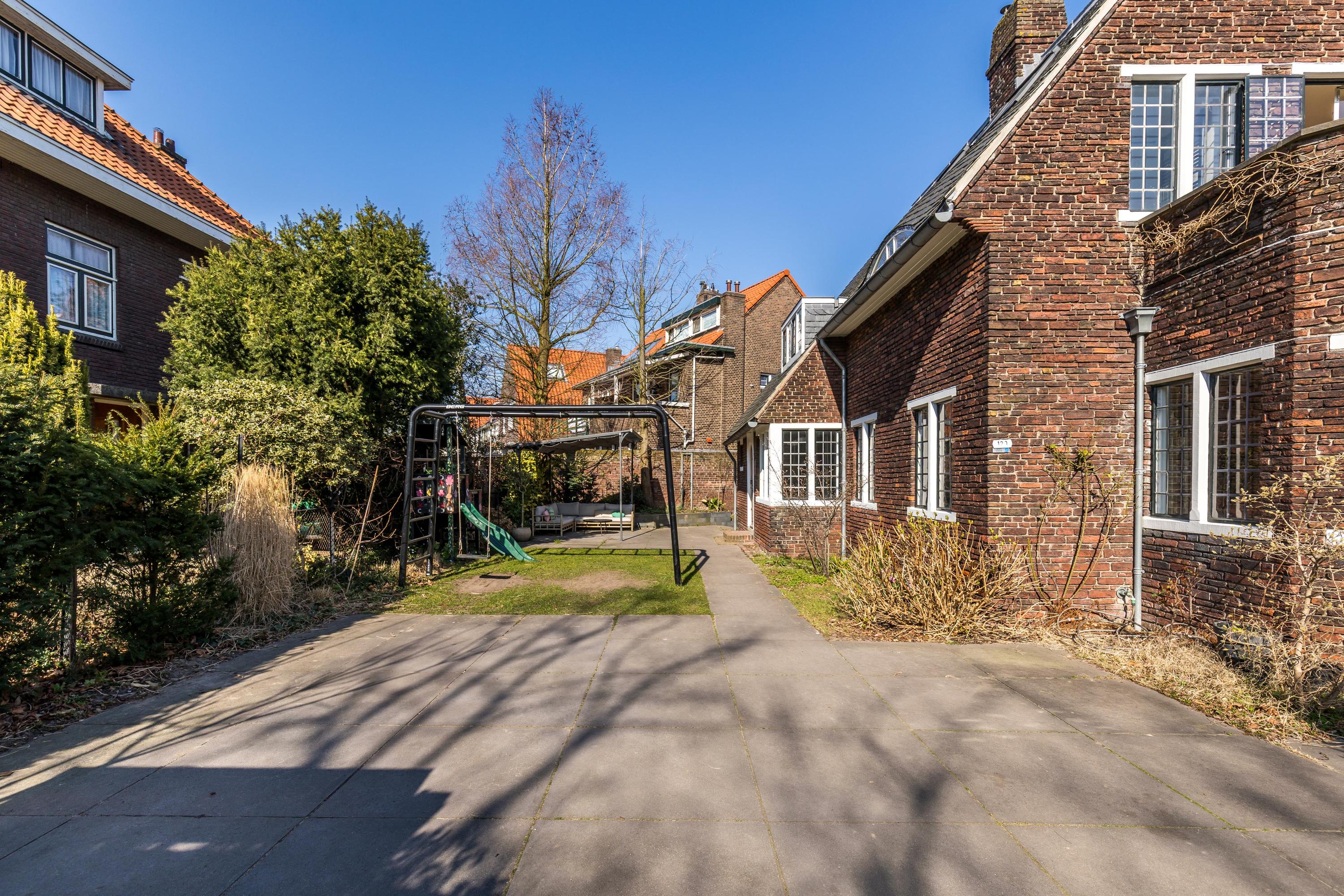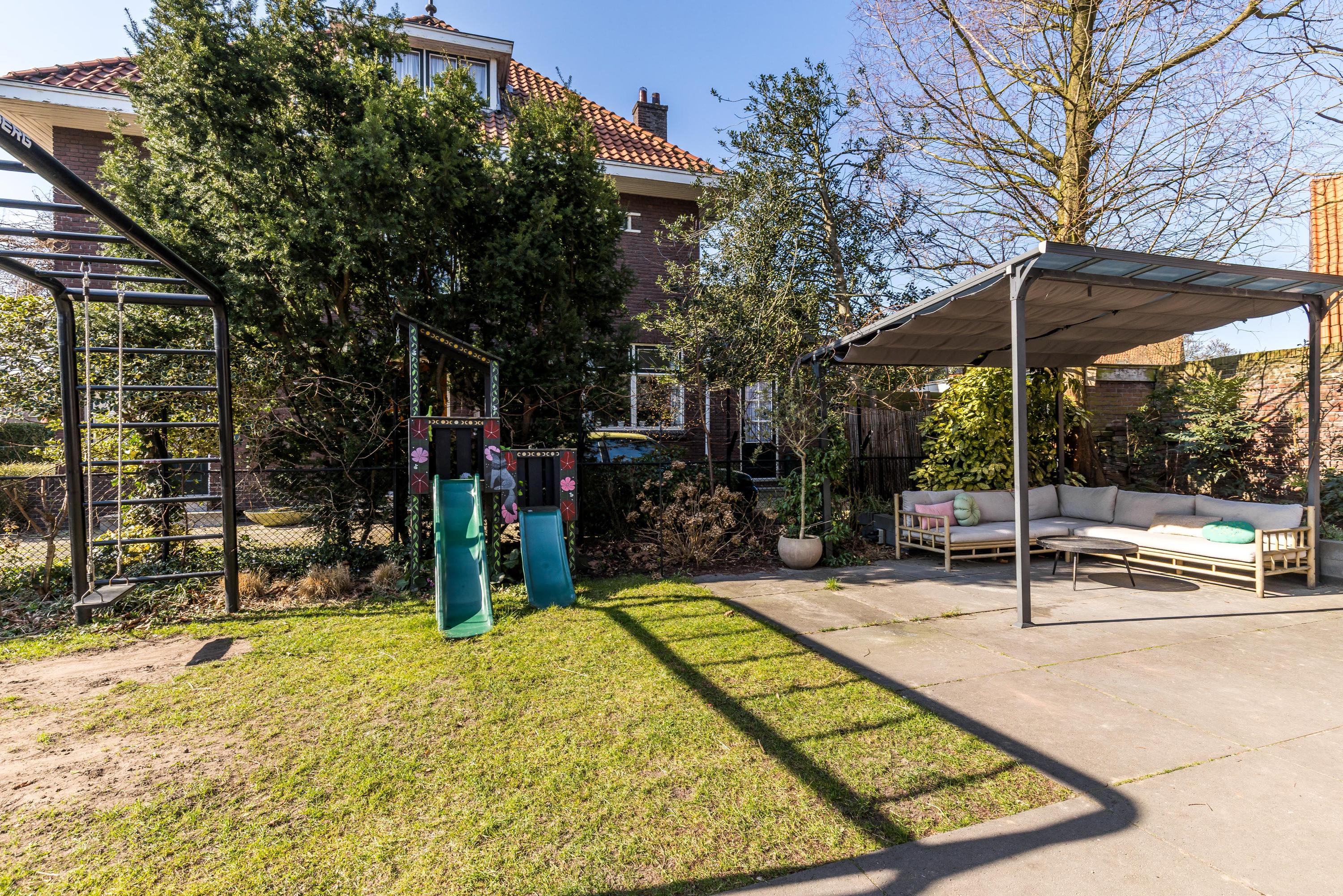 Tuin: De tuin ligt vanwege de vrije ligging helemaal rondom het huis. De noordzijde bevindt zich aan de achterzijde van het huis en is het beperktst qua ruimte. Juist de zijtuinen (oost- en westligging) en de voortuin (zuidligging) hebben de meeste ruimte en bieden gedurende de dag altijd een plekje in de zon. Beide zijtuinen zijn voorzien van meerdere fruit- en notenbomen die elk jaar vers fruit en noten geven. De zijtuin met west- en zuidligging is ingericht met verschillende zitjes en om te spelen. Parkeren op eigen terrein met meerdere auto’s is makkelijk mogelijk en de tuin wordt afgesloten middels een elektronisch bedienbaar hek dat in dezelfde stijl is gemaakt als het hekwerk van het Julianapark.