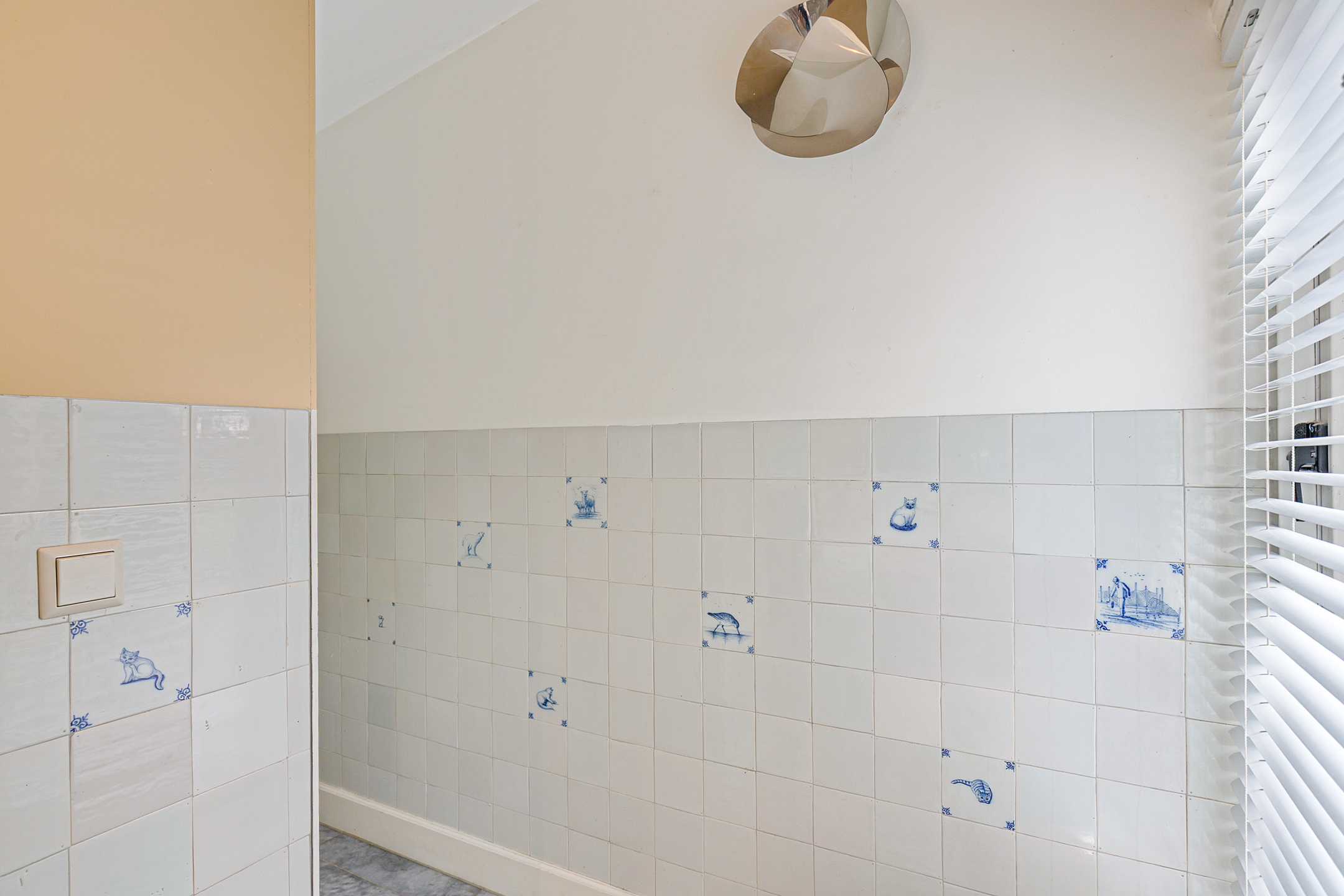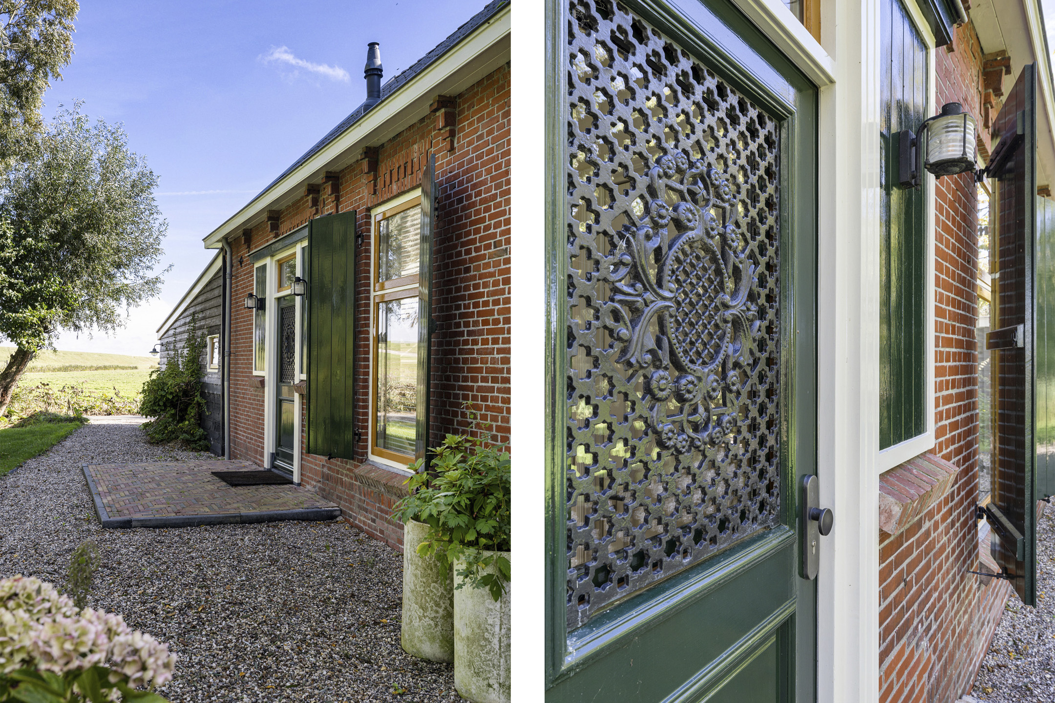 Bij binnenkomst valt meteen de stijl op: de voordeur met sierlijk smeedijzeren deurlichtrooster, een wand van oude Friese tegeltjes en een hardstenen vloer zetten de toon van dit zorgvuldig verbouwde dijkhuis. De hal geeft toegang tot een royale badkamer met dubbel wastafelmeubel, ligbad, inloopdouche en toilet.
