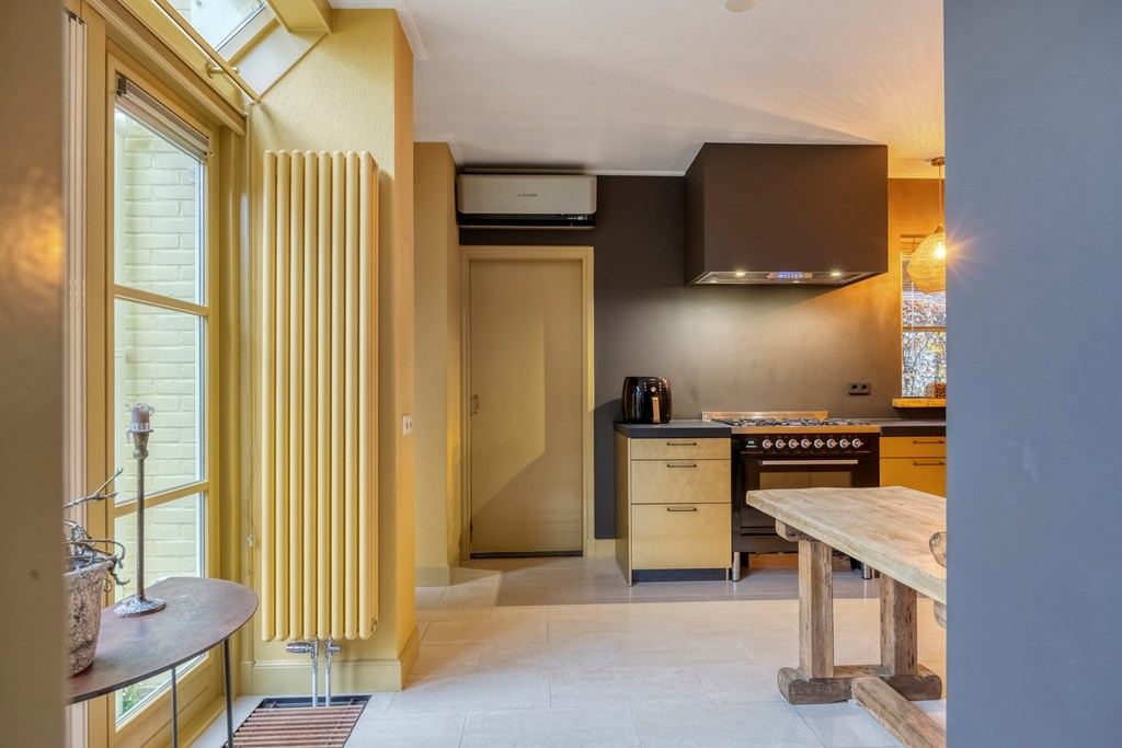 Via de zijkant van de woning komt u binnen in de hal, waar de eerste jaren ’20 details zich meteen laten zien: warme materialen, fijne lichtval, glas-in-loodraampjes en een prettige doorloop naar de kelder en leefruimte. Het toilet is modern en de trapopgang authentiek. De woonkamer strekt zich diep uit en vormt een heerlijk lichte ruimte dankzij de grote raampartijen, erker en de serre aan de achterzijde. Het gevoel van warmte komt van de houten vloeren, de sierlijke schouw en de verschillende zithoeken die het geheel intiem en sfeervol maken. De serre is een heerlijke toevoeging aan de woning; hier creëert u eenvoudig een gezellig zitje, met zicht op de tuin door de openslaande tuindeuren.