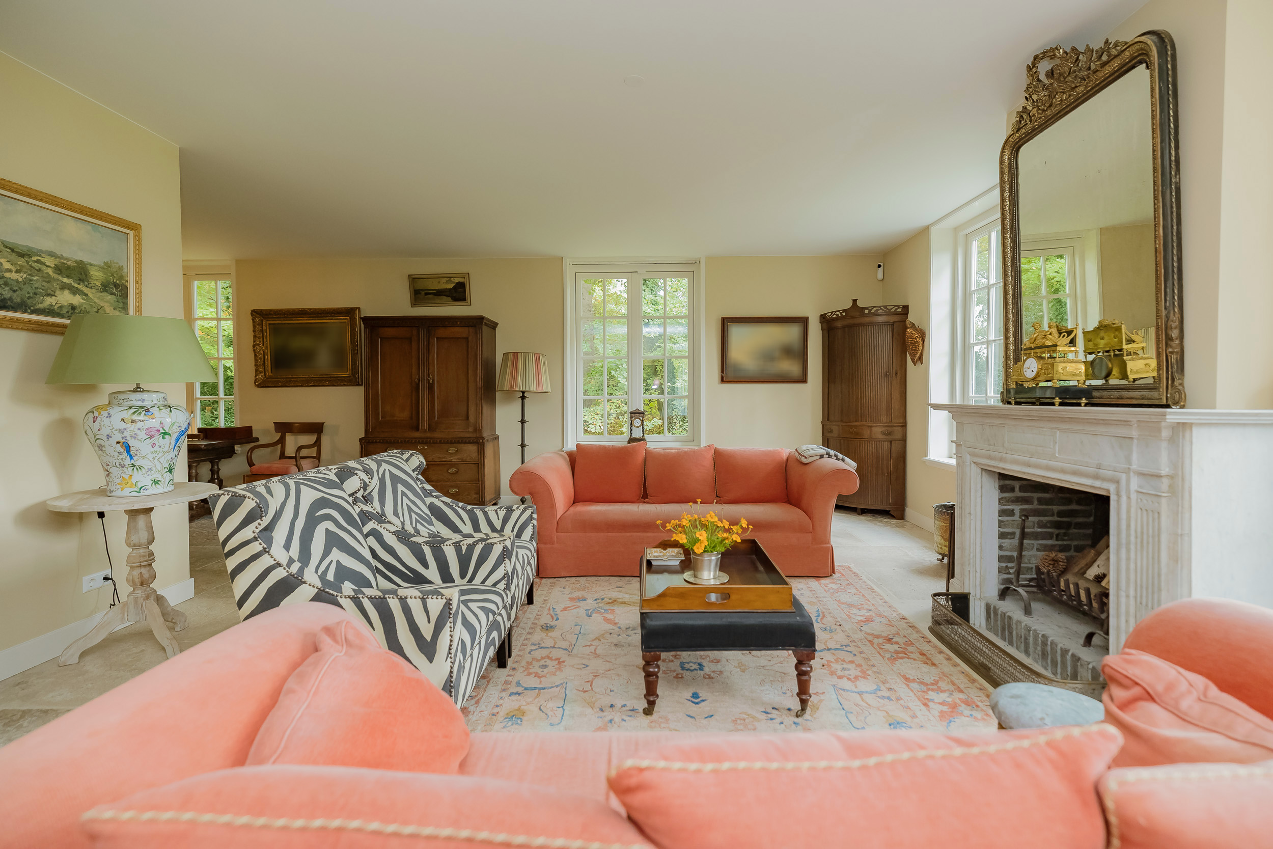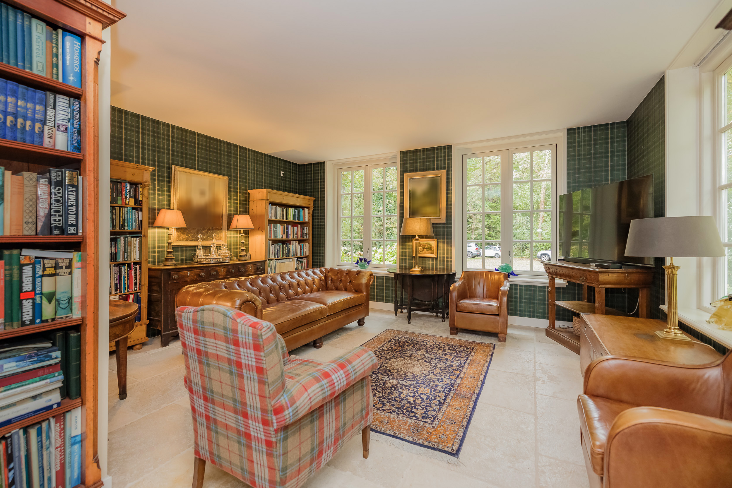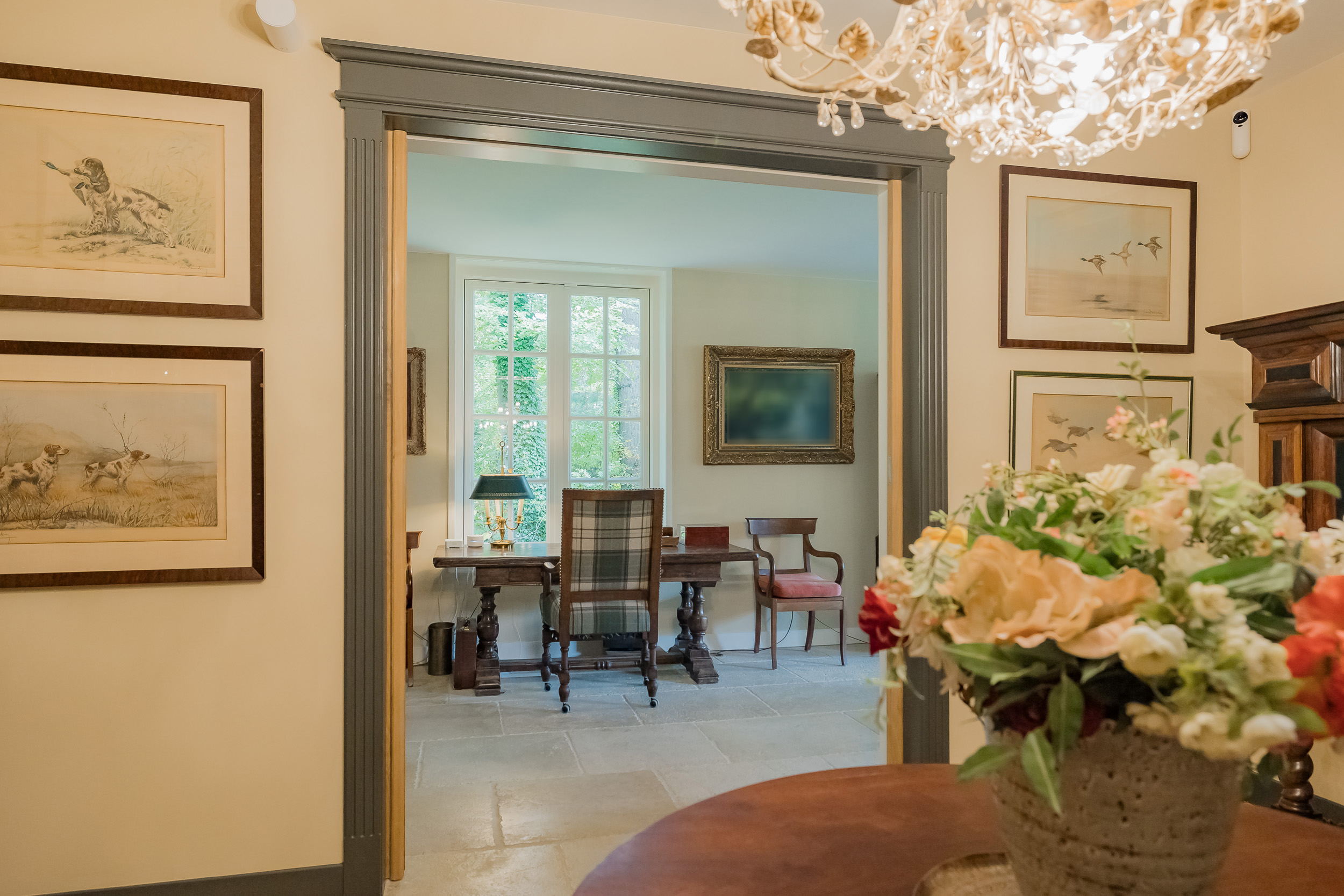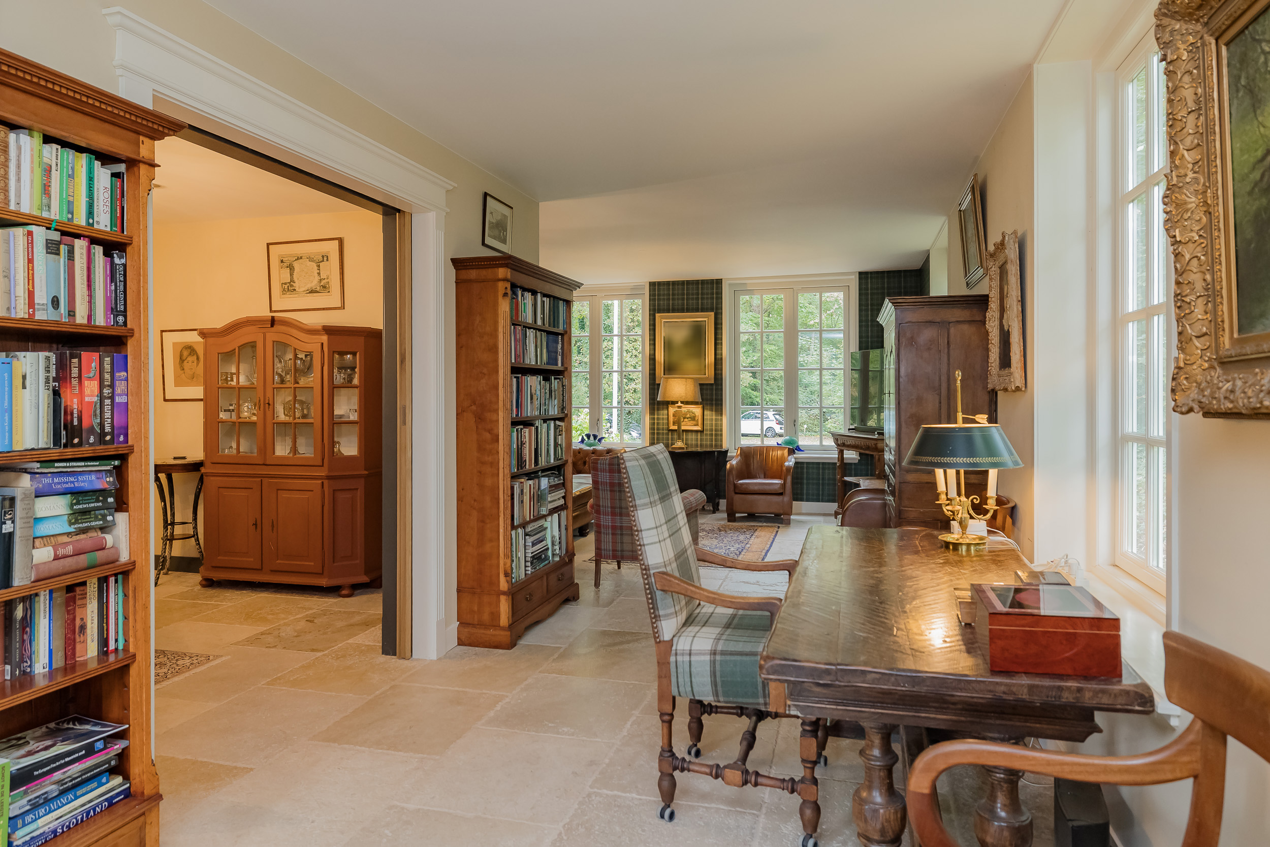 Via de indrukwekkende centrale hal met fraaie bordestrap en lift bereikt u alle vertrekken. De lichte woonkamer is een heerlijke ruime plek om van de rust en het uitzicht te genieten en biedt direct toegang tot de veranda. De open haard en vloerverwarming zorgen samen voor nog meer sfeer en comfort. Aan de voorzijde van de woning bevindt zich een sfeervolle herenkamer (of eetkamer) met uitzicht op het bos. Tussen deze kamers in bevindt zich een ruime werkplek.