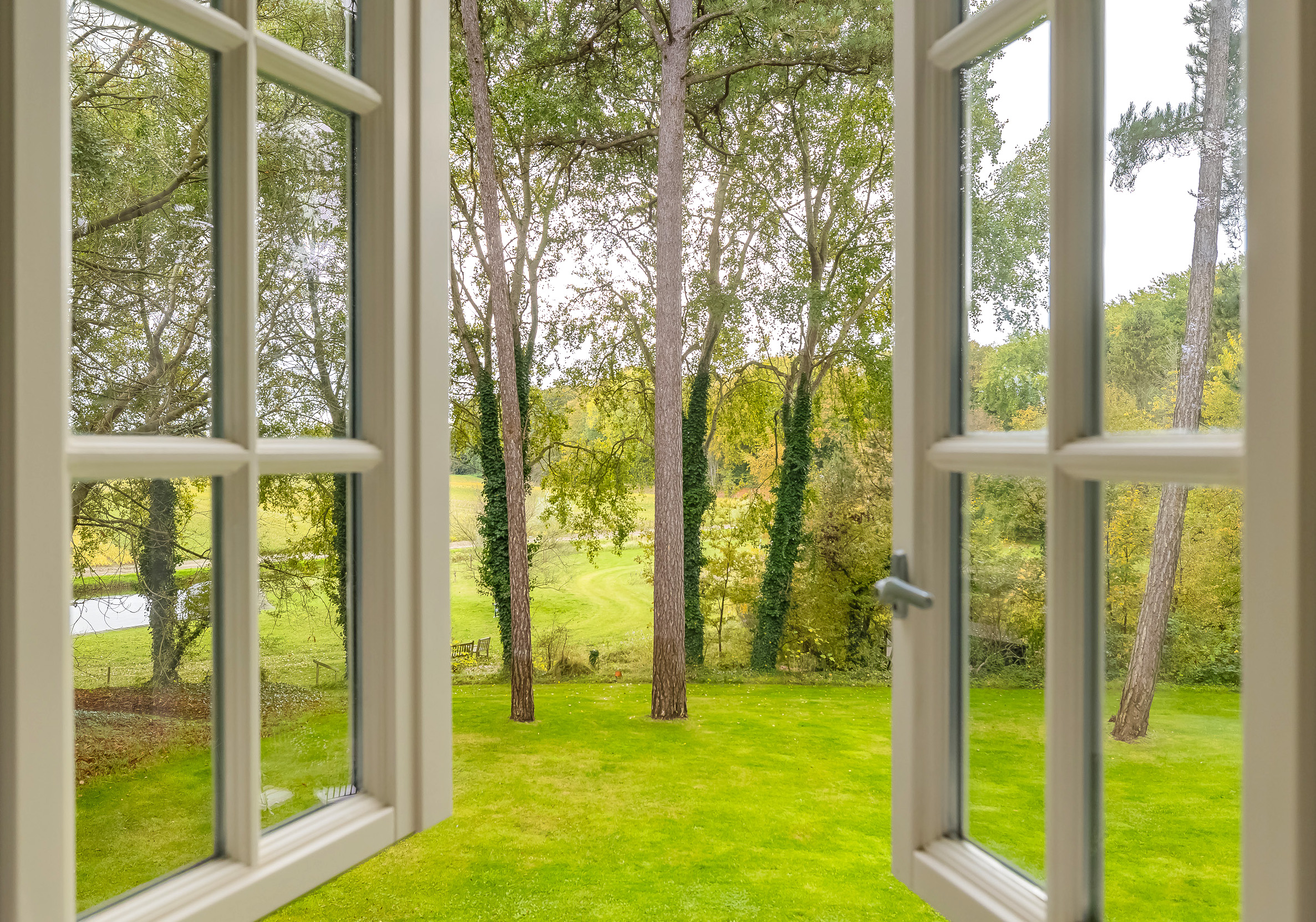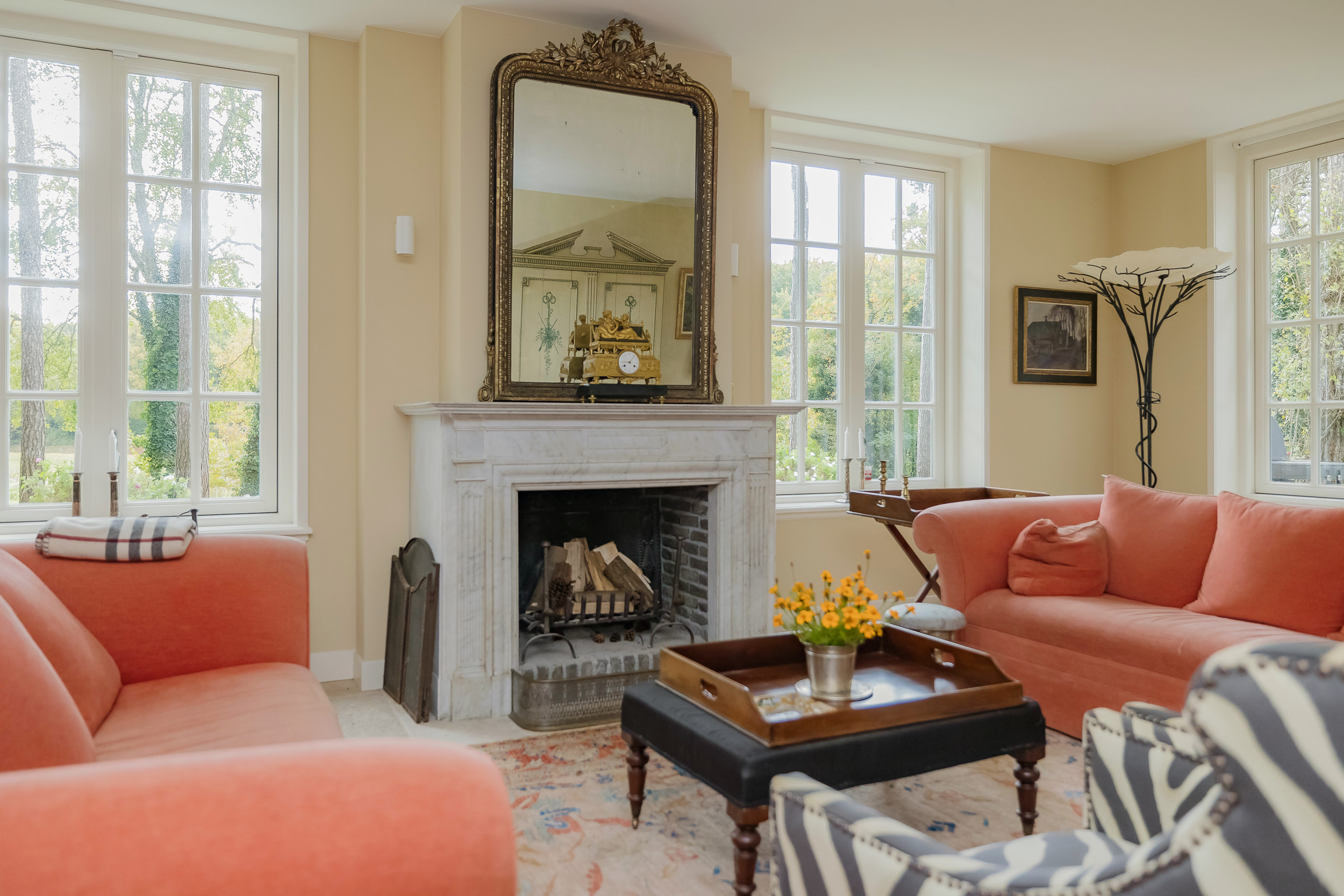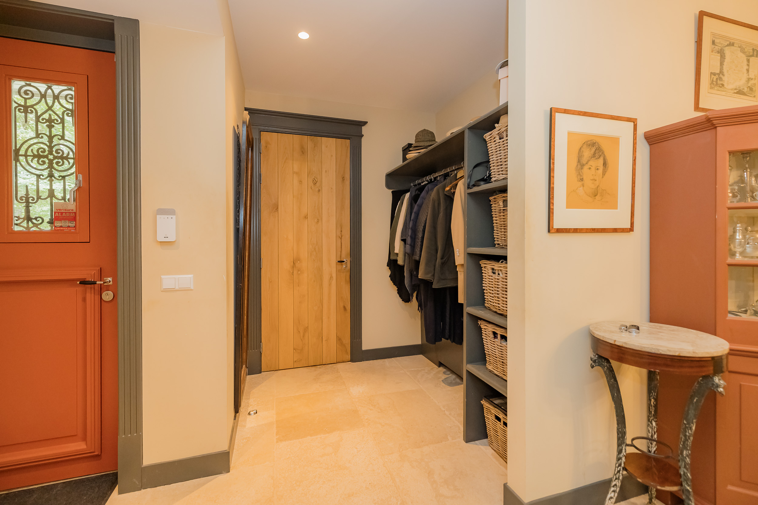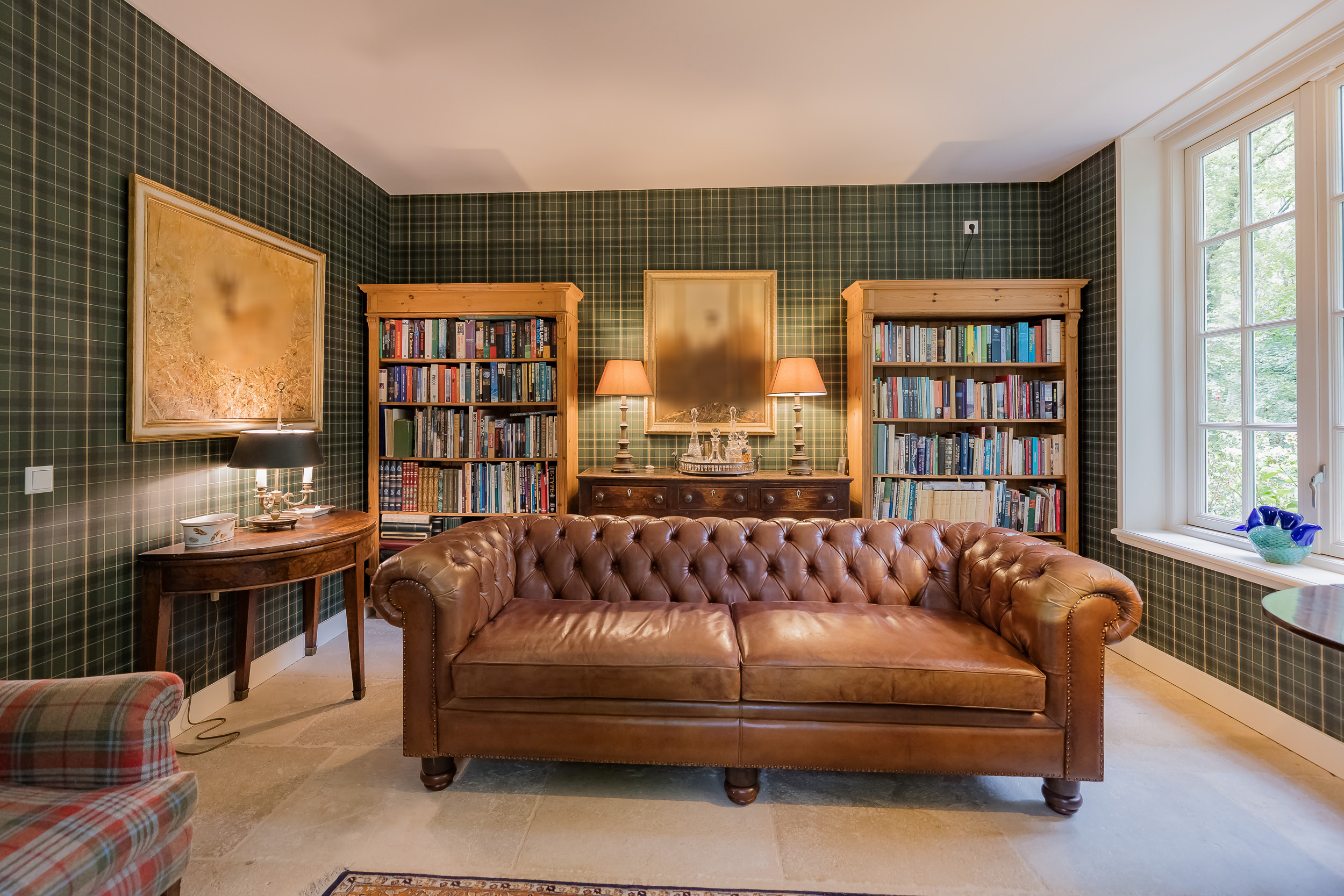 Via de indrukwekkende centrale hal met fraaie bordestrap en lift bereikt u alle vertrekken. De lichte woonkamer is een heerlijke ruime plek om van de rust en het uitzicht te genieten en biedt direct toegang tot de veranda. De open haard en vloerverwarming zorgen samen voor nog meer sfeer en comfort. Aan de voorzijde van de woning bevindt zich een sfeervolle herenkamer (of eetkamer) met uitzicht op het bos. Tussen deze kamers in bevindt zich een ruime werkplek.