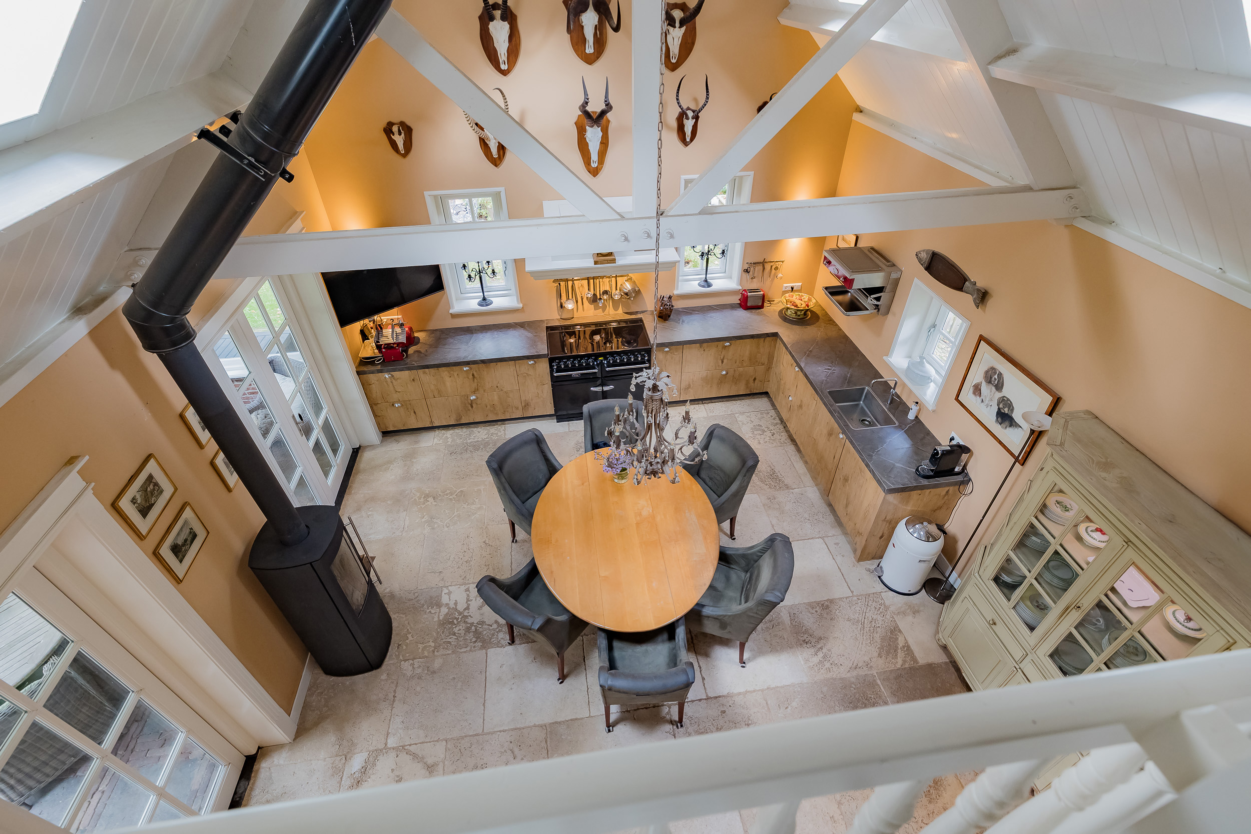 De royale, sfeervolle woonkeuken heeft een hoog plafond, een entresol, moderne inbouwapparatuur waaronder een Amerikaanse koelkast en een luxe AGA inductiefornuis met 4 ovens. Aansluitend is er een praktische bijkeuken. De dakramen en de houtkachel maken de keuken tot een fijne, warme plek om te koken en te eten. Vanuit de keuken loopt u zo de veranda op, waar een houtkachel ervoor zorgt dat u het hele jaar kunt genieten van het buitenleven.