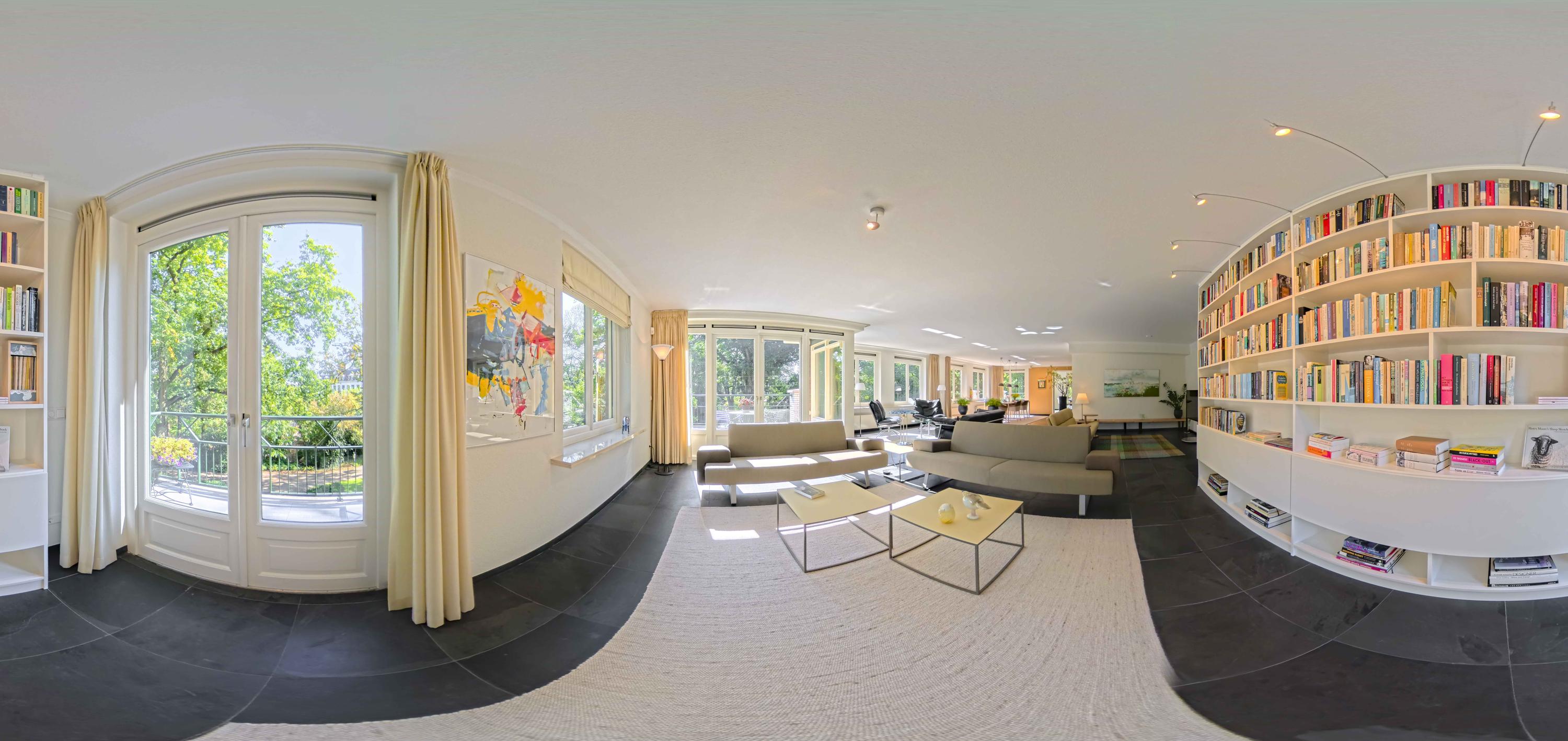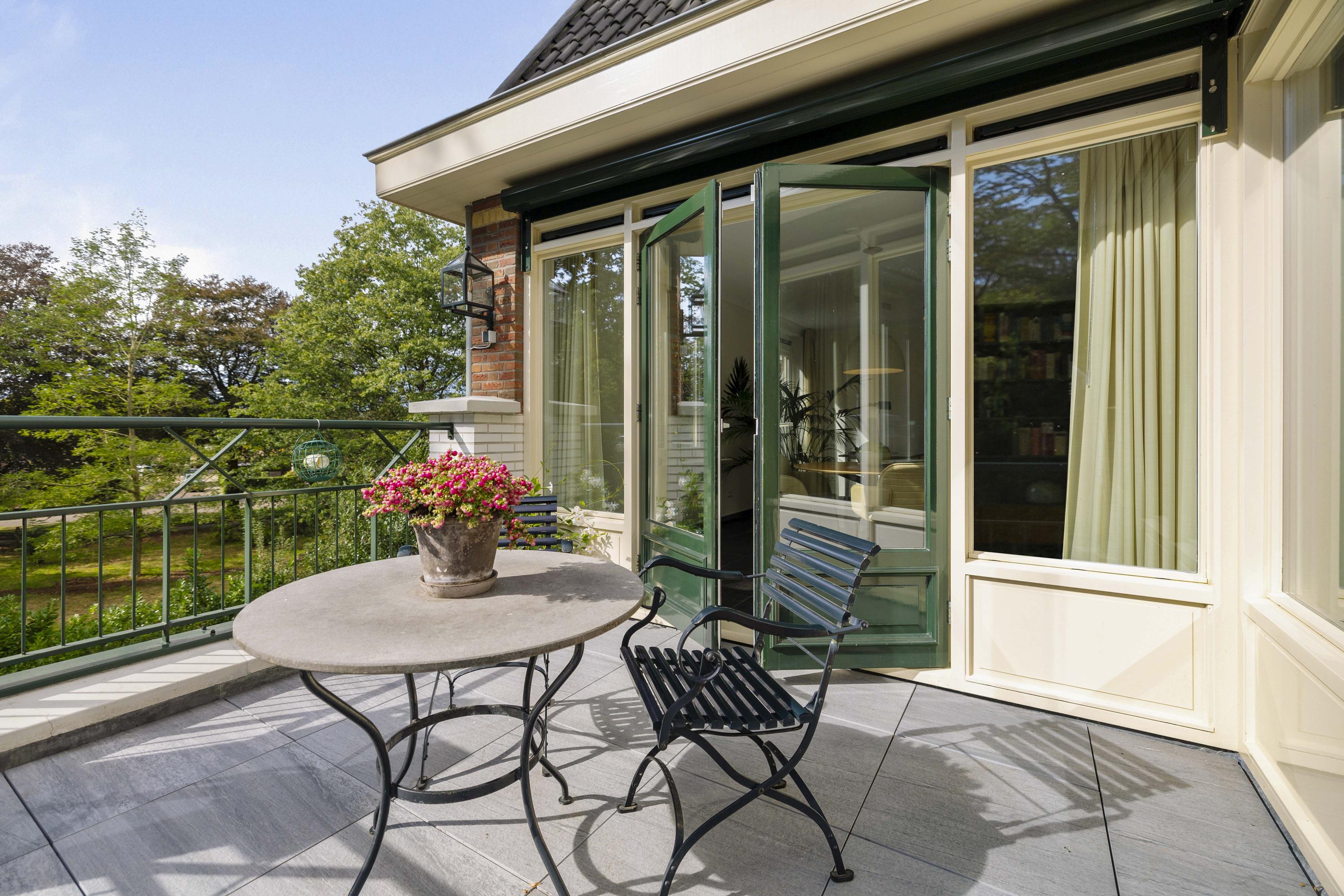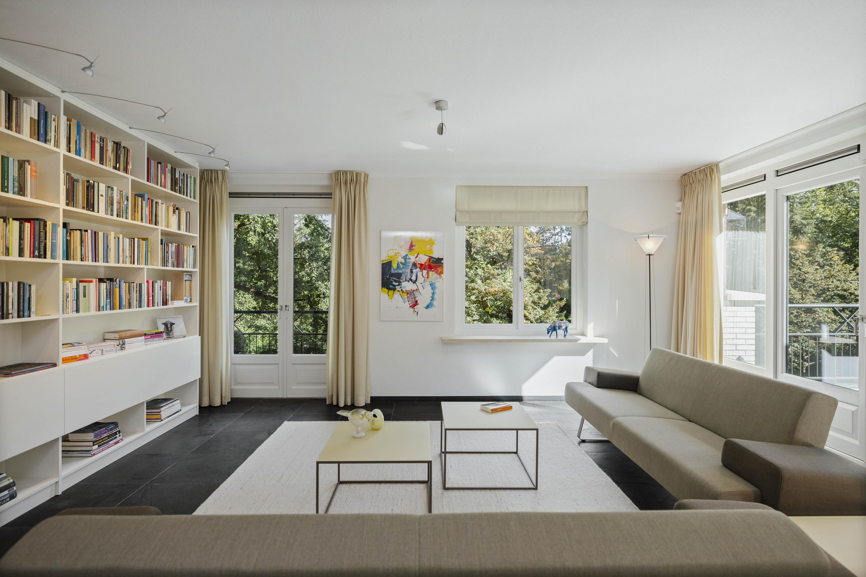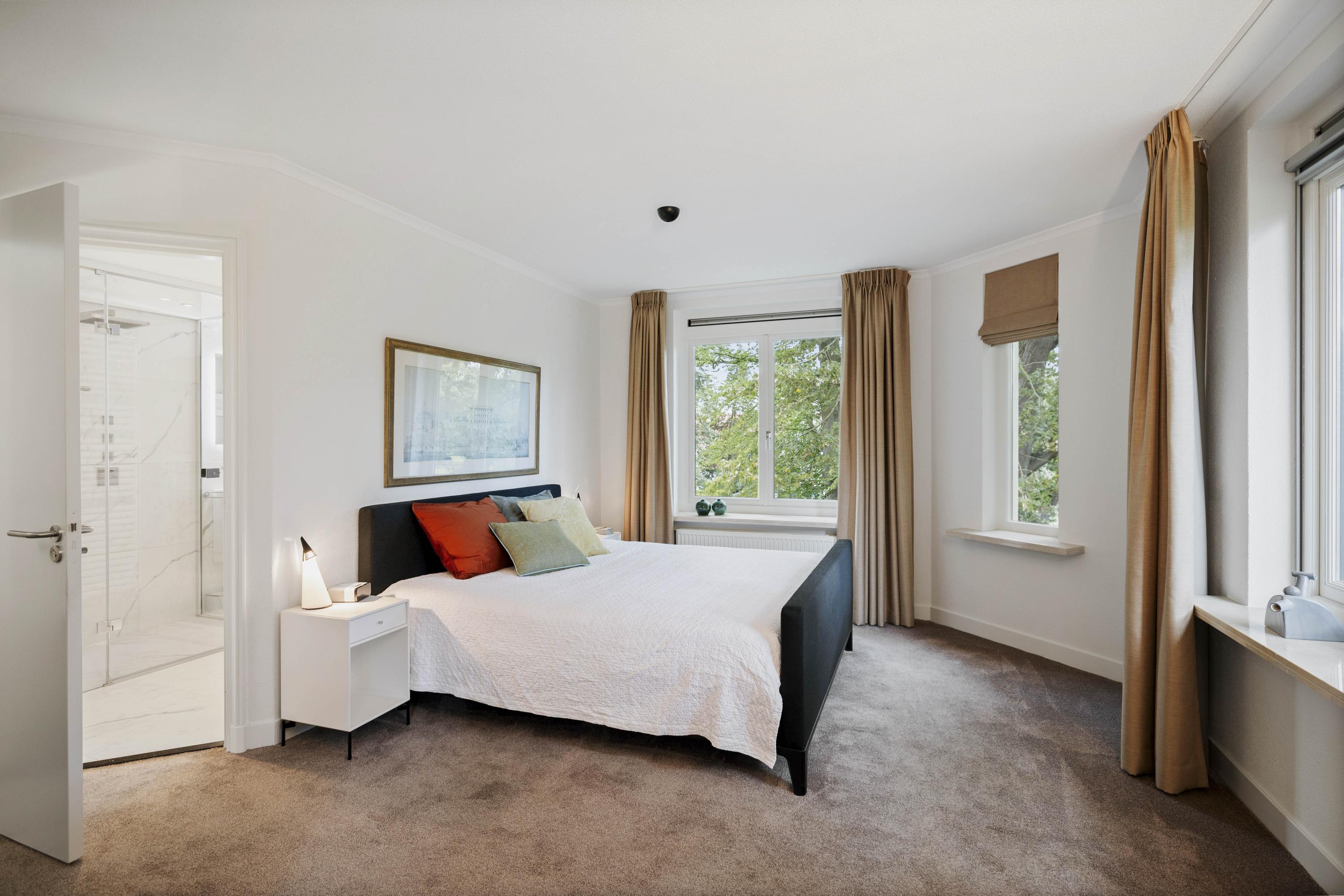 De riante woonkamer, met in het verlengde een ruime studeerkamer en-suite, biedt een prachtig uitzicht op het park en heeft openslaande deuren naar alle balkons.
