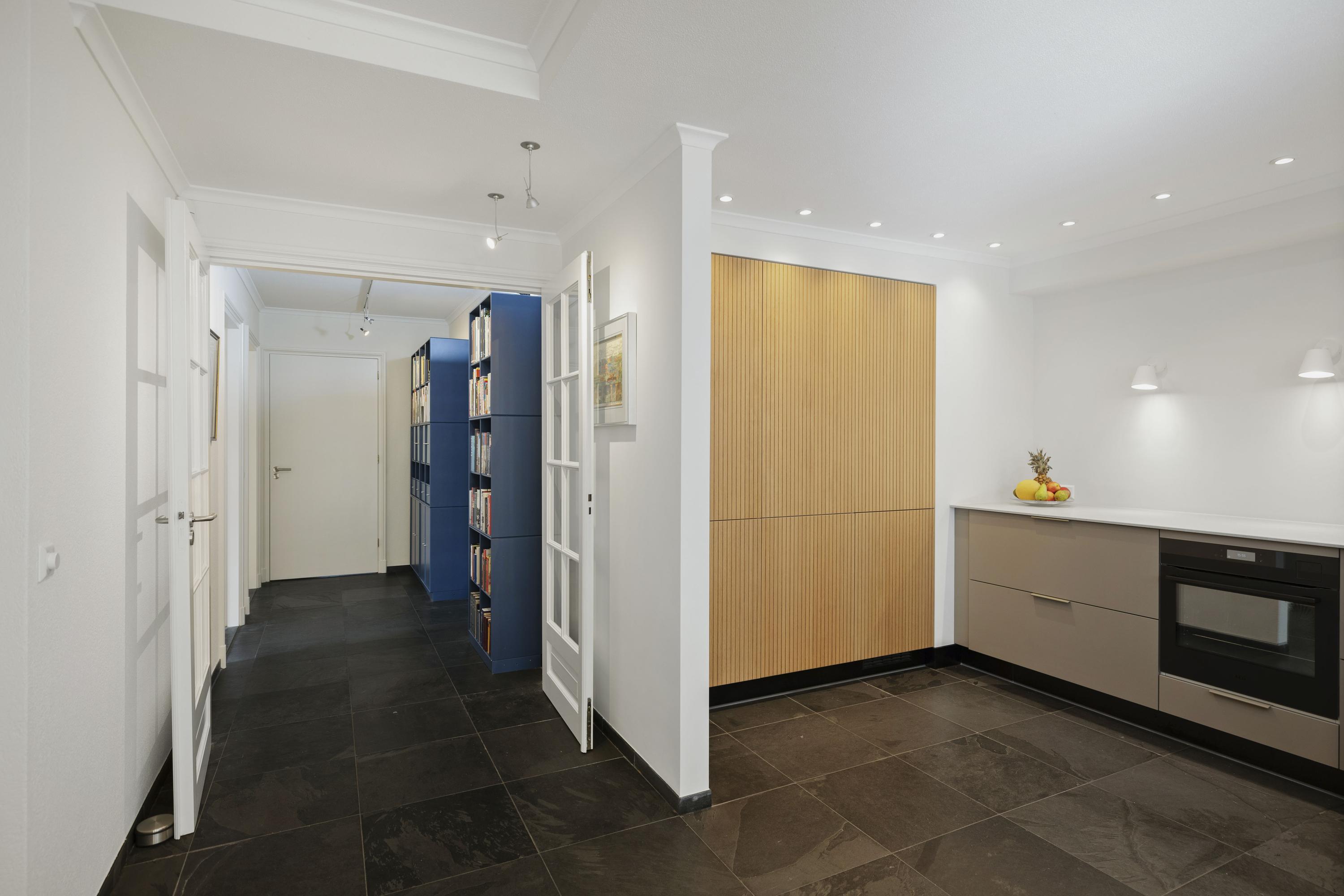Openslaande deuren geven toegang tot de bijkeuken, twee slaap/hobby-kamers en een tweede badkamer met ligbad, inloopdouche en een dubbele wastafel. De ruime bijkeuken met spoelbak, cv installatie (2021), waterontharder en aansluitingen voor wasmachine en -droger heeft een eigen uitgang naar de entreehal met lift en trappenhuis.