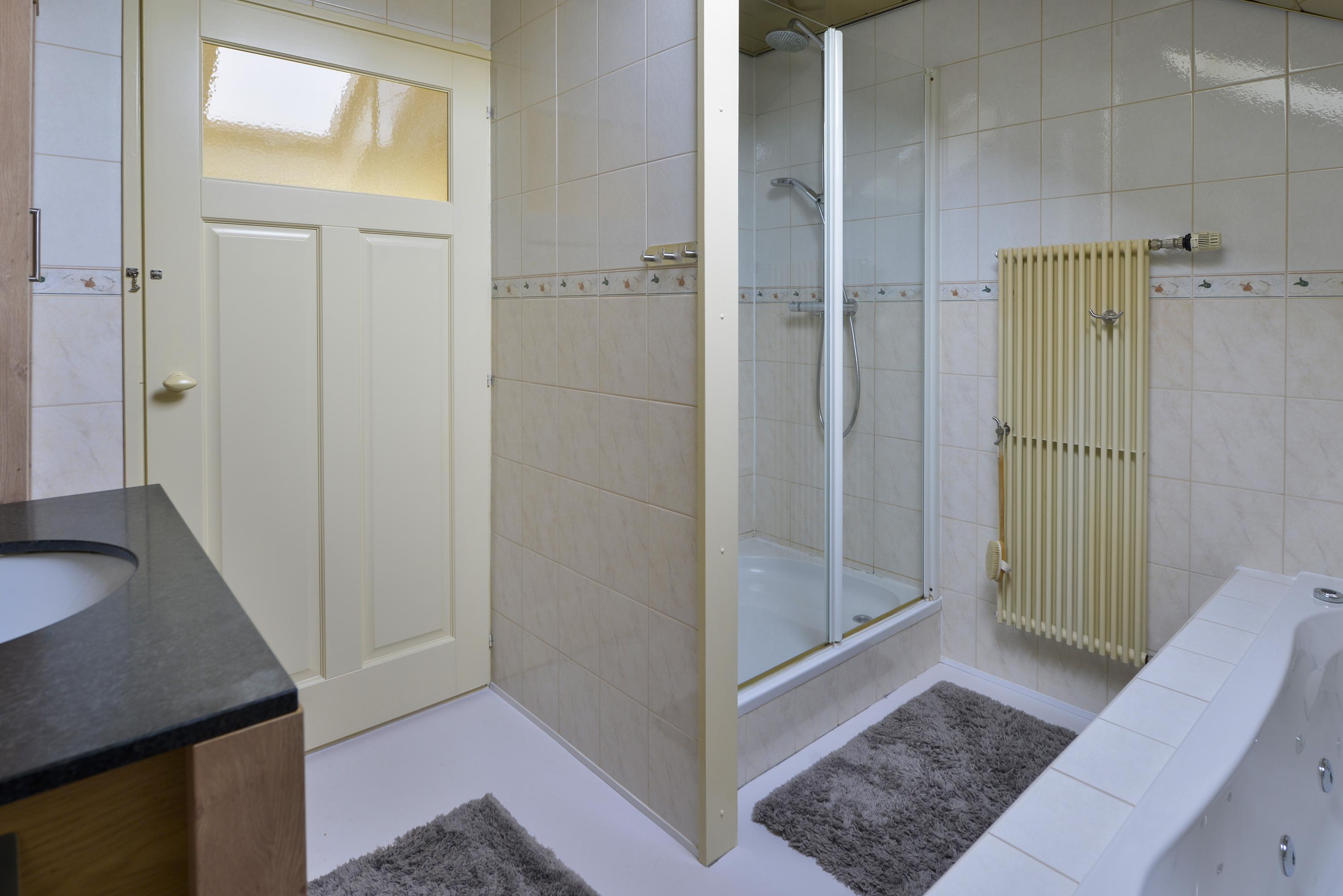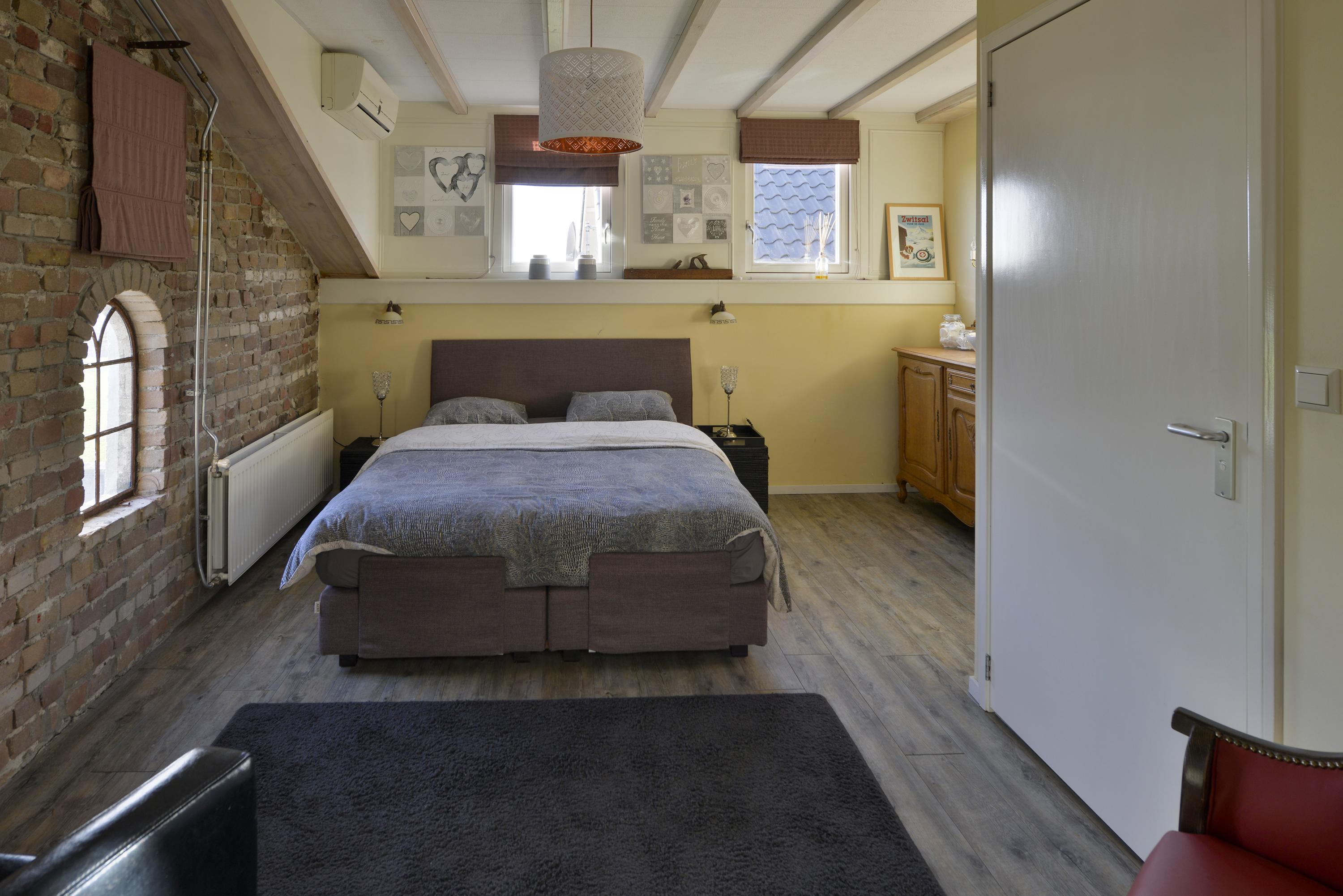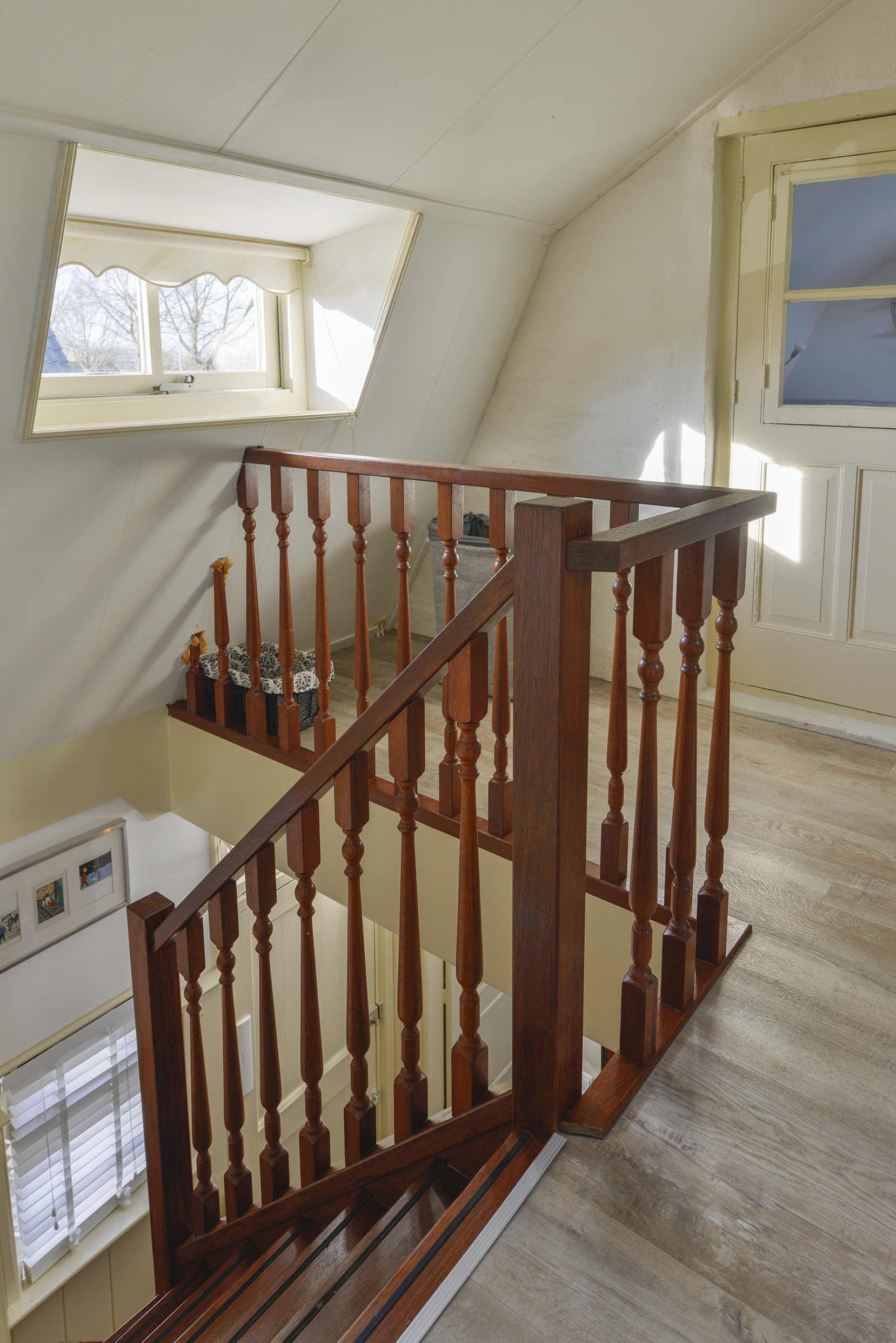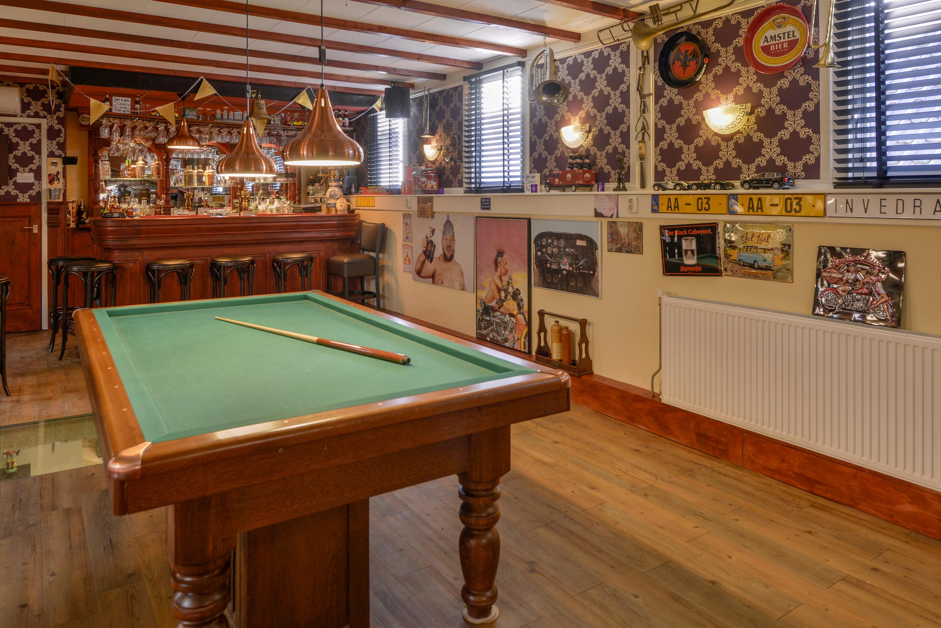 Eerste verdieping: overloop met toegang tot de eerste slaapkamer, de eerste badkamer en de tweede overloop. Deze slaapkamer is aan de voorkant van de woning gelegen. De complete badkamer is voorzien van een ligbad, douche, wastafel en toilet. Ruime overloop met inloopkast en werkhoek. Vanuit deze tweede overloop is de hal naar de overige slaapkamers te bereiken. Er zijn nog vier ruime slaapkamers en een multifunctionele ruimte met bar, welke nu in gebruik is als poolkamer. Tevens zijn er nog twee badkamers en een separaat toilet. Deze ruimtes bevinden zich boven de multifunctionele bijgebouwen en hebben een ruime en lichte vide met terras.