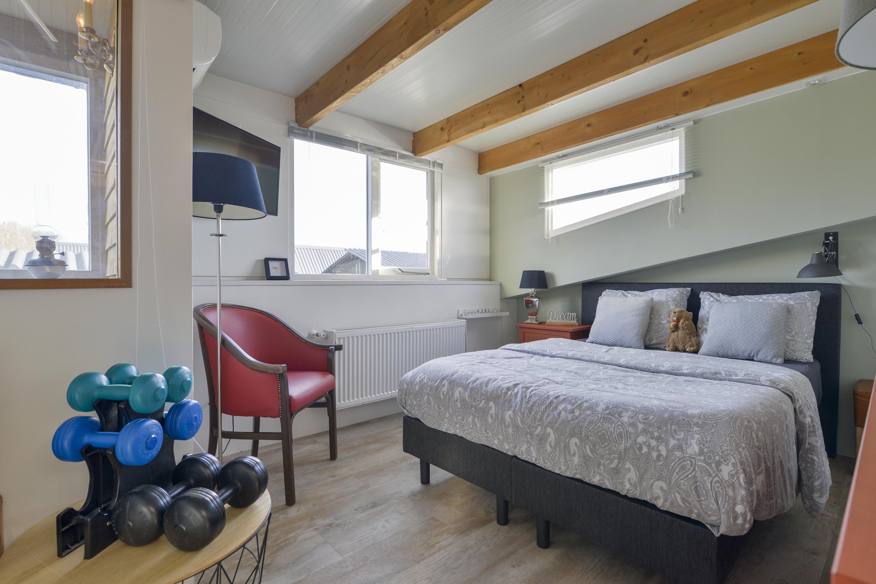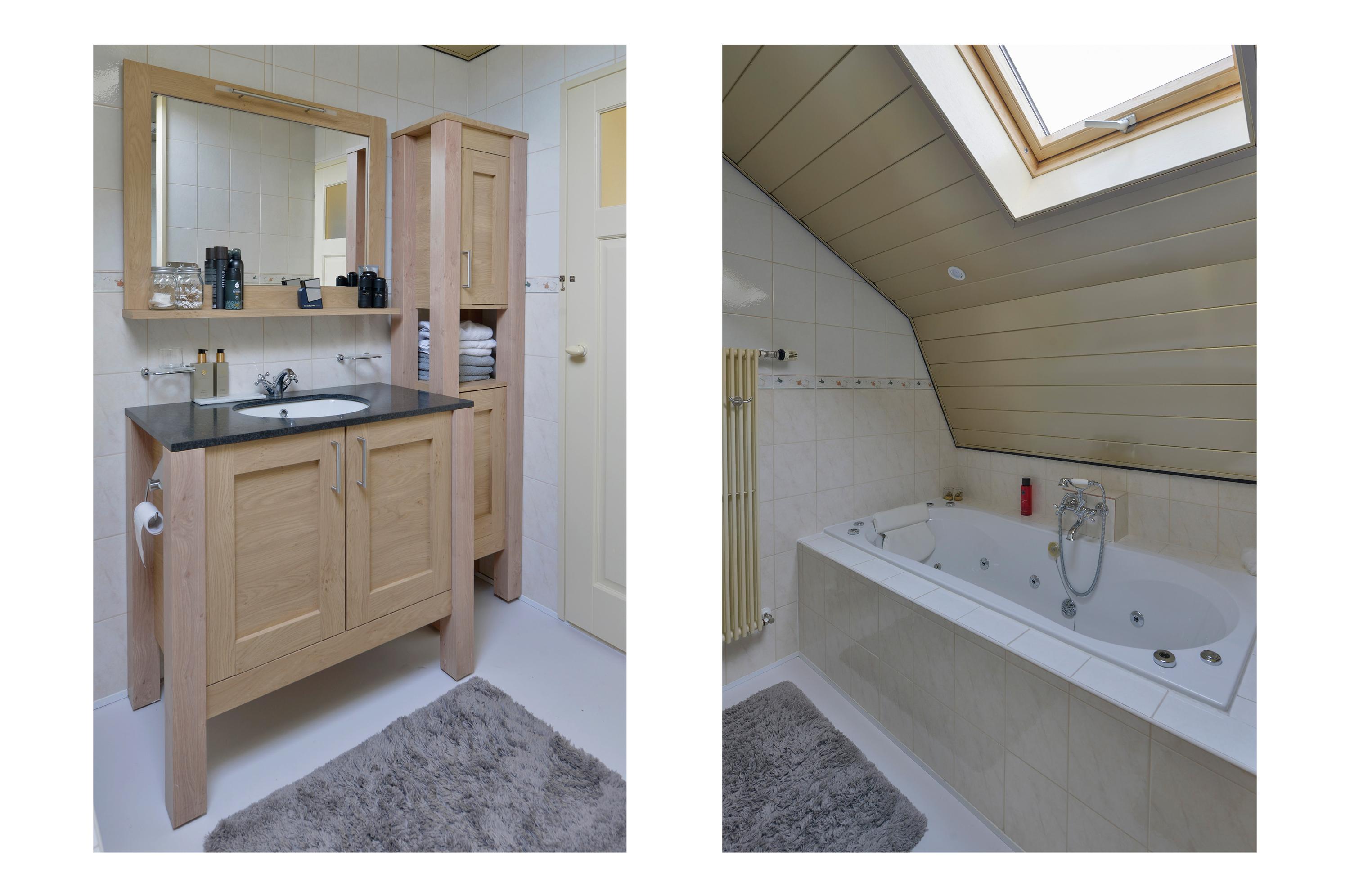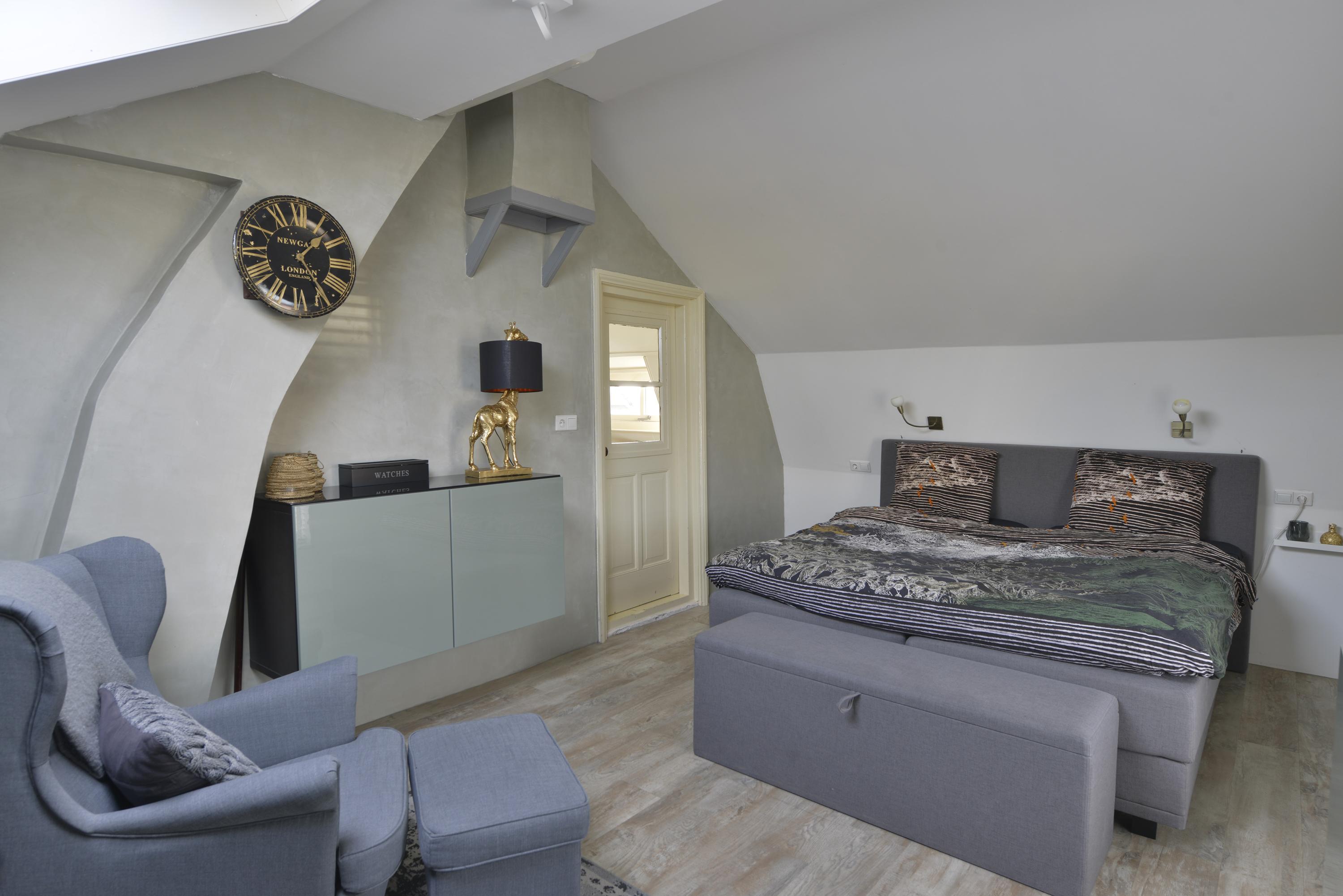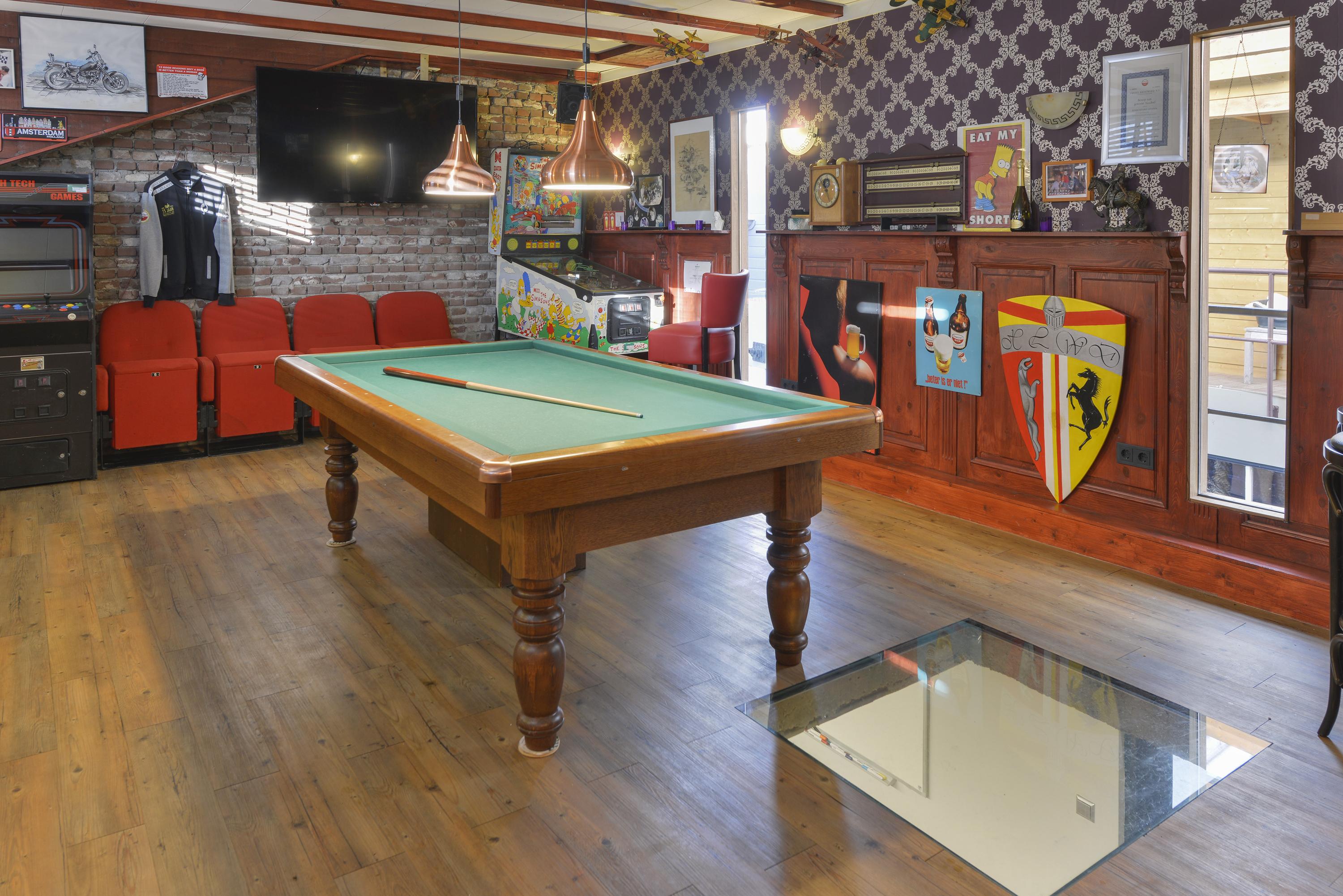 Eerste verdieping: overloop met toegang tot de eerste slaapkamer, de eerste badkamer en de tweede overloop. Deze slaapkamer is aan de voorkant van de woning gelegen. De complete badkamer is voorzien van een ligbad, douche, wastafel en toilet. Ruime overloop met inloopkast en werkhoek. Vanuit deze tweede overloop is de hal naar de overige slaapkamers te bereiken. Er zijn nog vier ruime slaapkamers en een multifunctionele ruimte met bar, welke nu in gebruik is als poolkamer. Tevens zijn er nog twee badkamers en een separaat toilet. Deze ruimtes bevinden zich boven de multifunctionele bijgebouwen en hebben een ruime en lichte vide met terras.